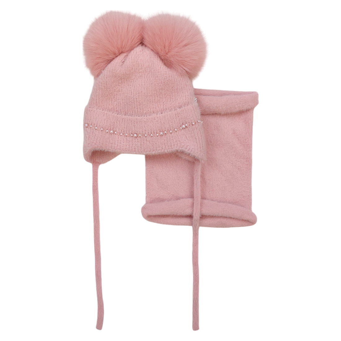 Set of hat with snood 2 pompoms girly powder pink Ambra D68-241024-39