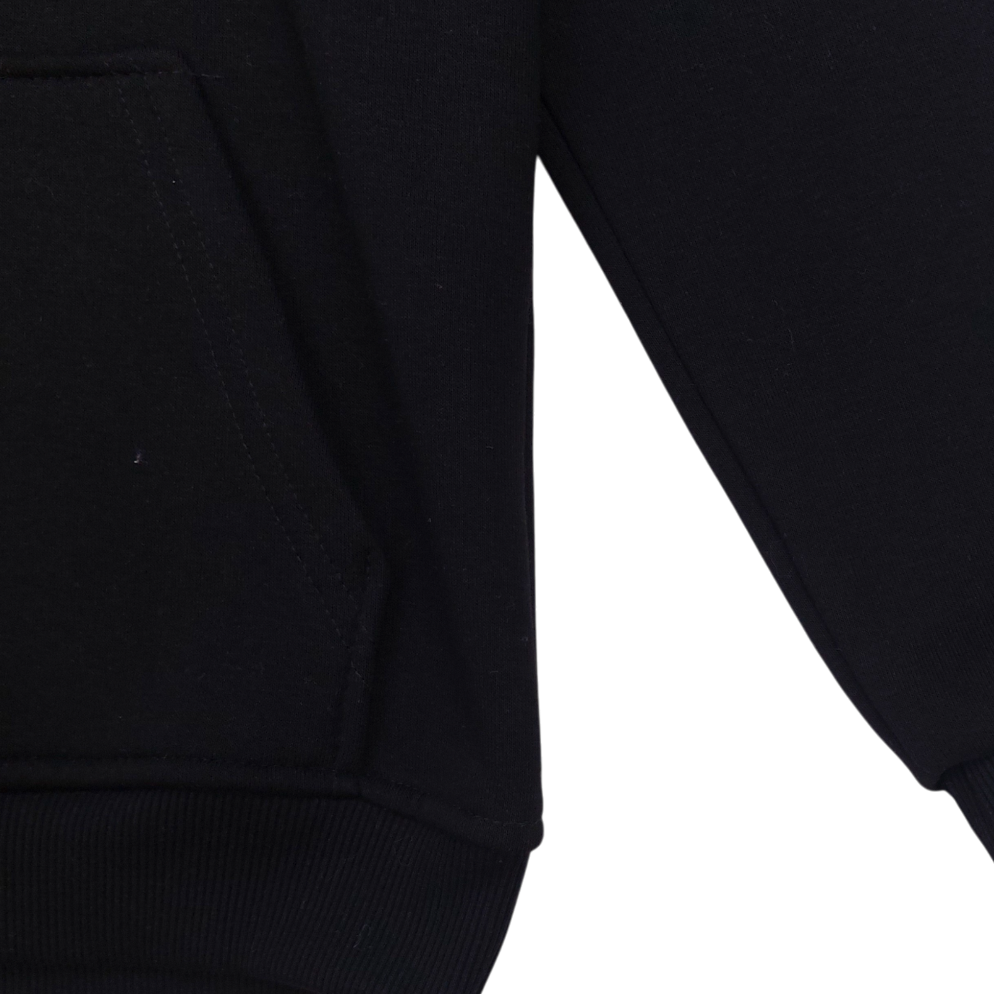 Ein klassisches schwarzes Kapuzensweatshirt für Jungen , perfekt für kühle Herbst- und Wintertage. Dieses isolierte Modell bietet thermischen Komfort und eine praktische Kängurutasche . Rippbündchen an Ärmeln und Saum sorgen für eine perfekte Passform und Schutz vor Kälte.
