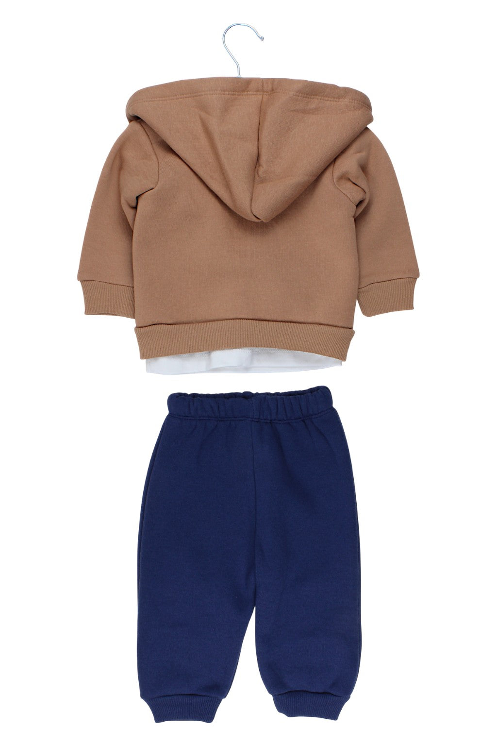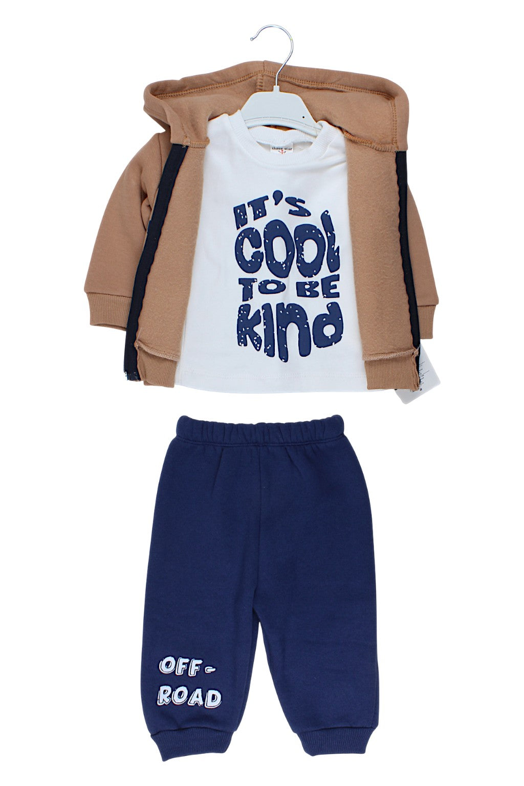 Chłopięcy komplet składający się z trzech części w kolorze beżowym, idealny na sezon jesień-zima. Zestaw zawiera bluzę z motywem auta, spodnie oraz koszulkę. Bluza posiada praktyczne kieszenie oraz wygodne zapięcie na suwak. Spodnie są elastyczne w pasie, co zapewnia komfort noszenia. Całość wykonana z przyjemnego w dotyku materiału, idealnego dla dzieci.