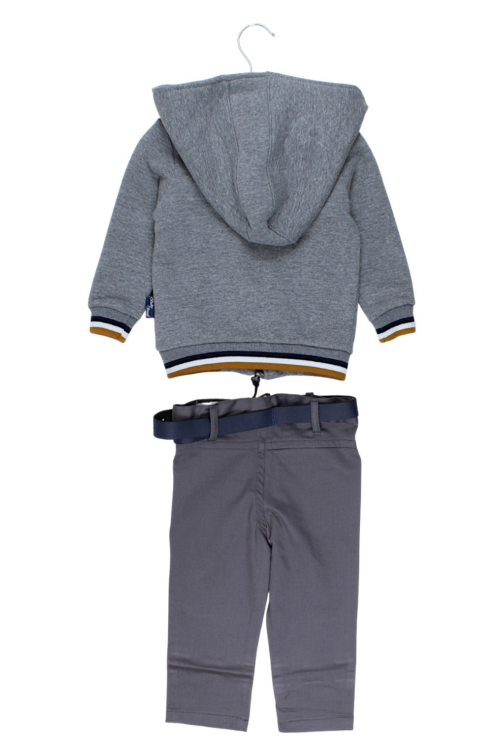 Przedstawiamy elegancki komplet wizytowy dla chłopców w kolorze popielatym. Zestaw składa się z trzech części: stylowego polo, wygodnych spodni oraz praktycznej bluzy. Polo wykonane jest w 100% z bawełny, co zapewnia komfort noszenia. Spodnie, z dodatkiem elastanu, gwarantują swobodę ruchów, a bluza z domieszką poliestru dodaje ciepła. Komplet jest idealny na chłodniejsze dni sezonu jesień-zima. Zwróć uwagę na detale, takie jak kieszenie i zapięcia, które podkreślają funkcjonalność i styl tego zestawu.