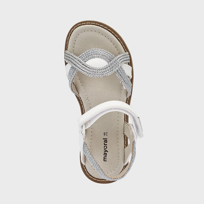 Elegante Kinder-Flechtsandalen mit Klettverschluss für Mädchen von Mayoral aus der Mini Girl Frühjahr/Sommer Kollektion, Produktcode 45269, Farbe 46 Silber. Kinderschuhe.