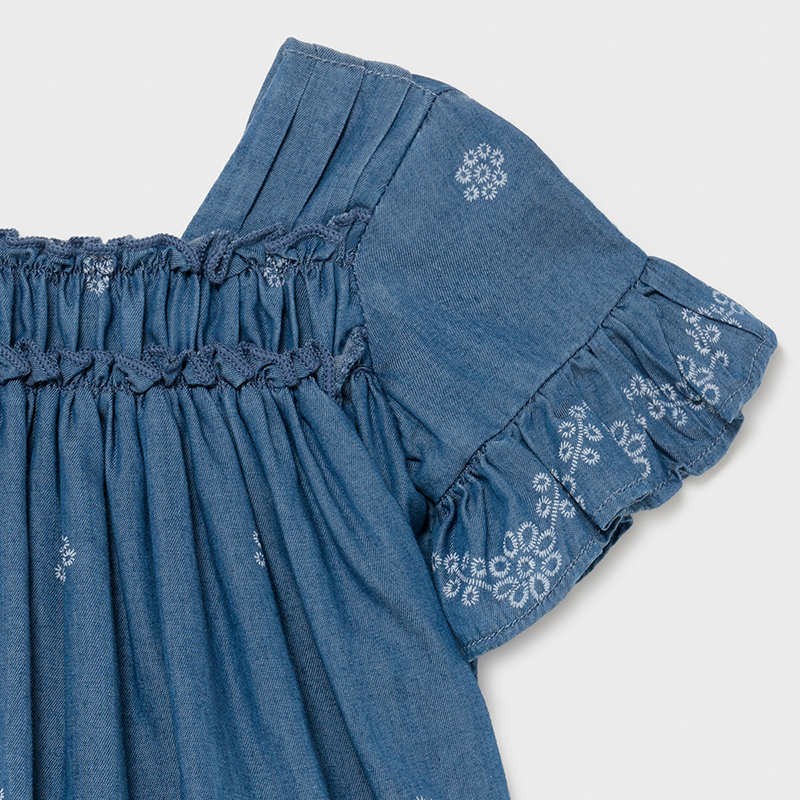 Kinder-Jeanskleid mit kurzen Ärmeln und Stickerei für Mädchen von Mayoral aus der Baby-Mädchen-Frühjahr-Sommer-Kollektion, Produktcode 1981, Farbe 5 Blau. Kinderkleidung.