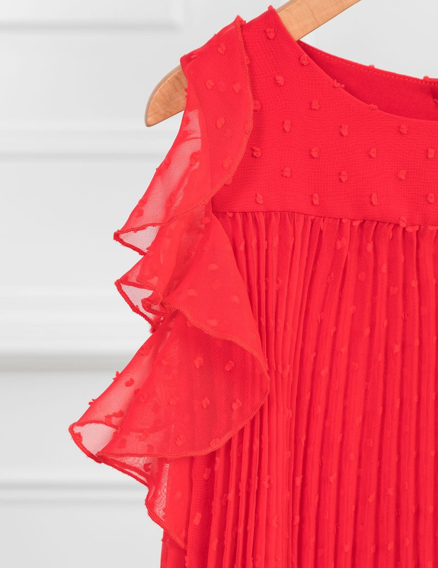 Elegantes Plumeti-Gaze-Kleid für Kinder, plissiert mit Rüschenärmeln, für Mädchen, Abel & Lula, aus der Girls Mini Premium-Kollektion, Frühjahr-Sommer-Saison, Produktcode 5036, Farbe 62 Rot. Elegante Kleidung für Kinder.