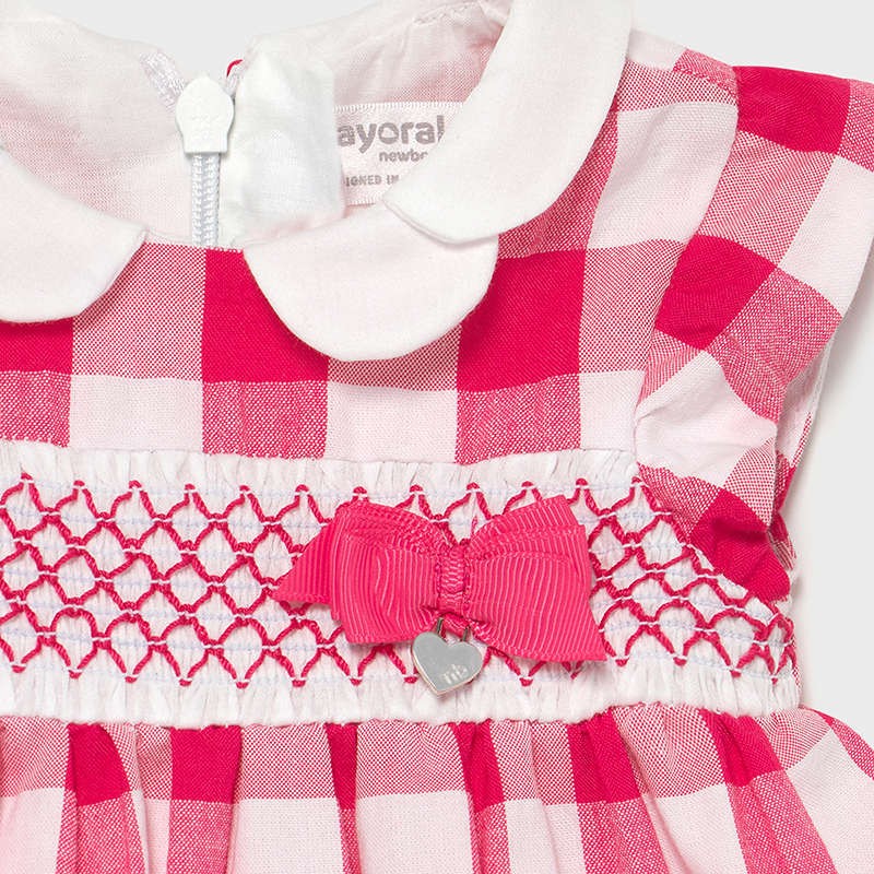 Kariertes Kleid mit Höschen von Mayoral für Mädchen aus der Frühjahr/Sommer-Kollektion für Neugeborene, Produktcode 1833, Farbe 60 Fragola. Kleidung für Neugeborene.