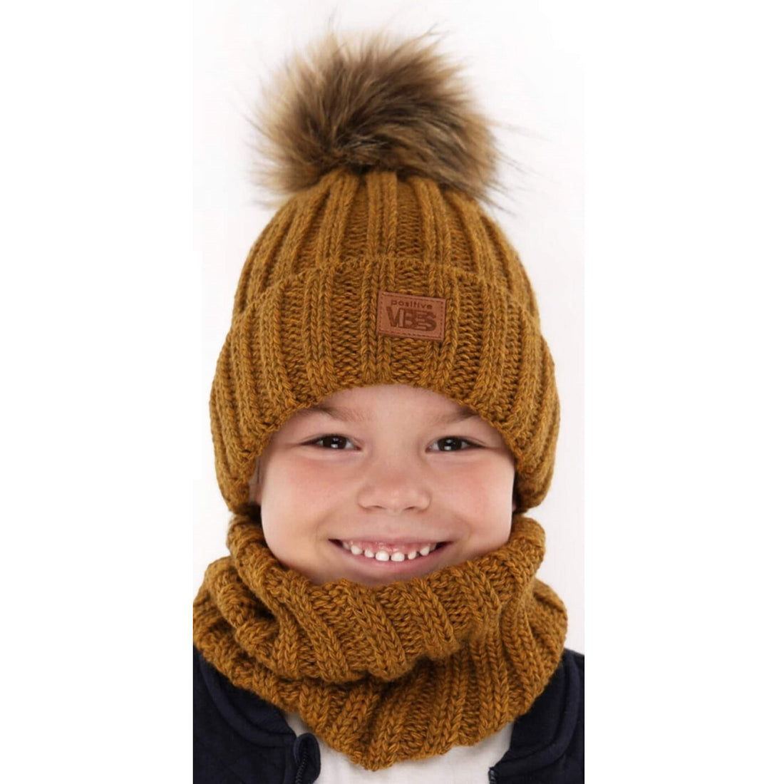 Komplet czapka z kominem z pomponem chłopięcy musztarda Agbo K-41-241024-60