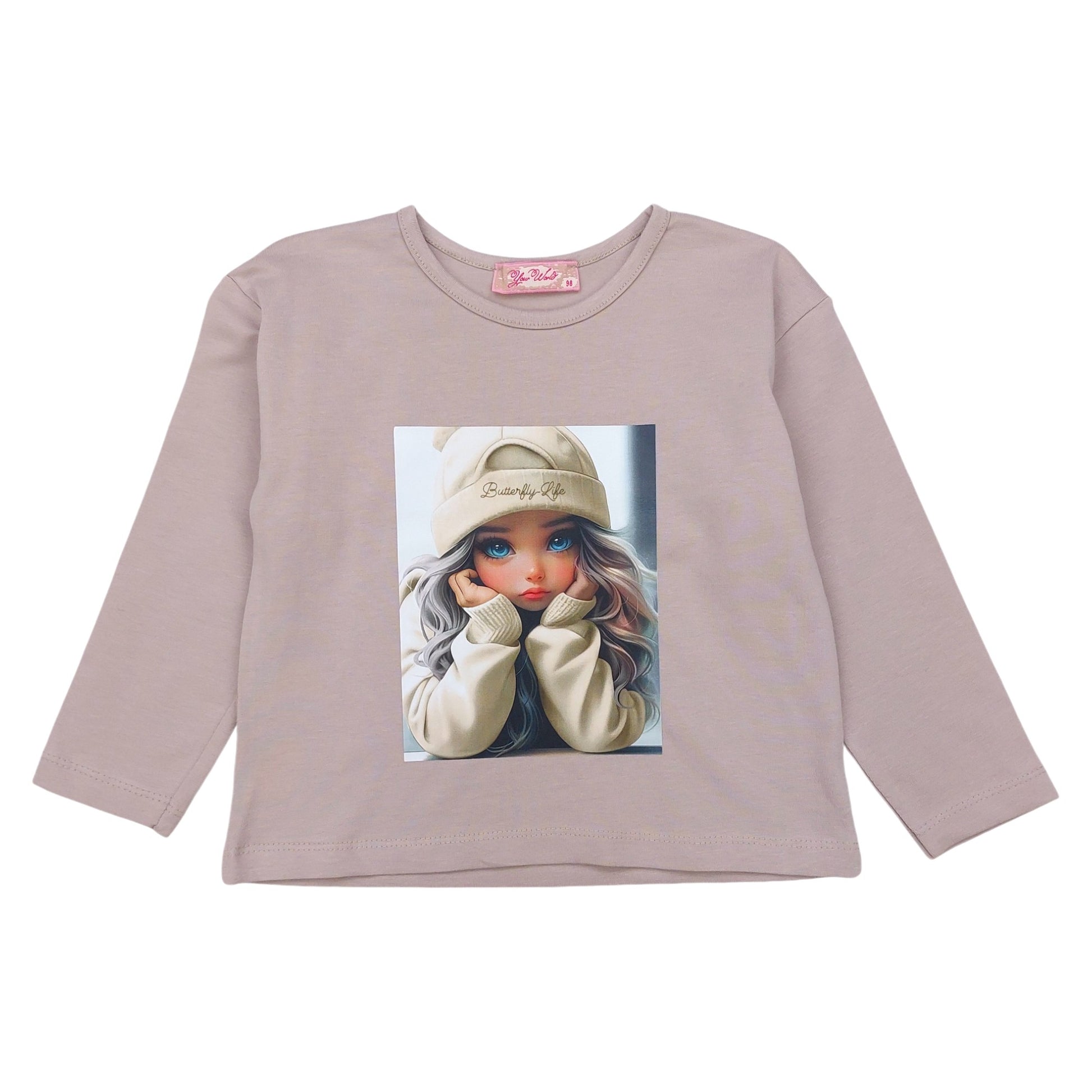 Unikalny nadruk z uroczą dziewczynką nadaje tej bluzce wyjątkowego stylu. Kolorystyka jest subtelna, pastelowa, idealnie wpisująca się w dziecięce gusta. Długie rękawy są idealnym rozwiązaniem na jesienne i zimowe dni, kiedy potrzebna jest dodatkowa warstwa ciepła. Delikatnie marszczone ramiona dodają całości lekkości i dziewczęcego wdzięku.