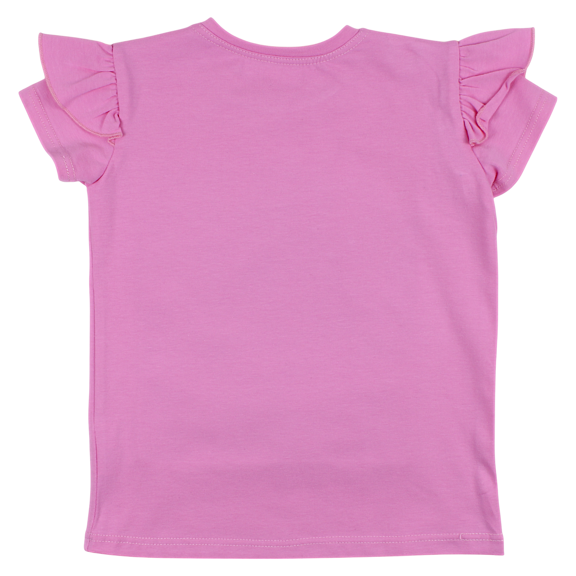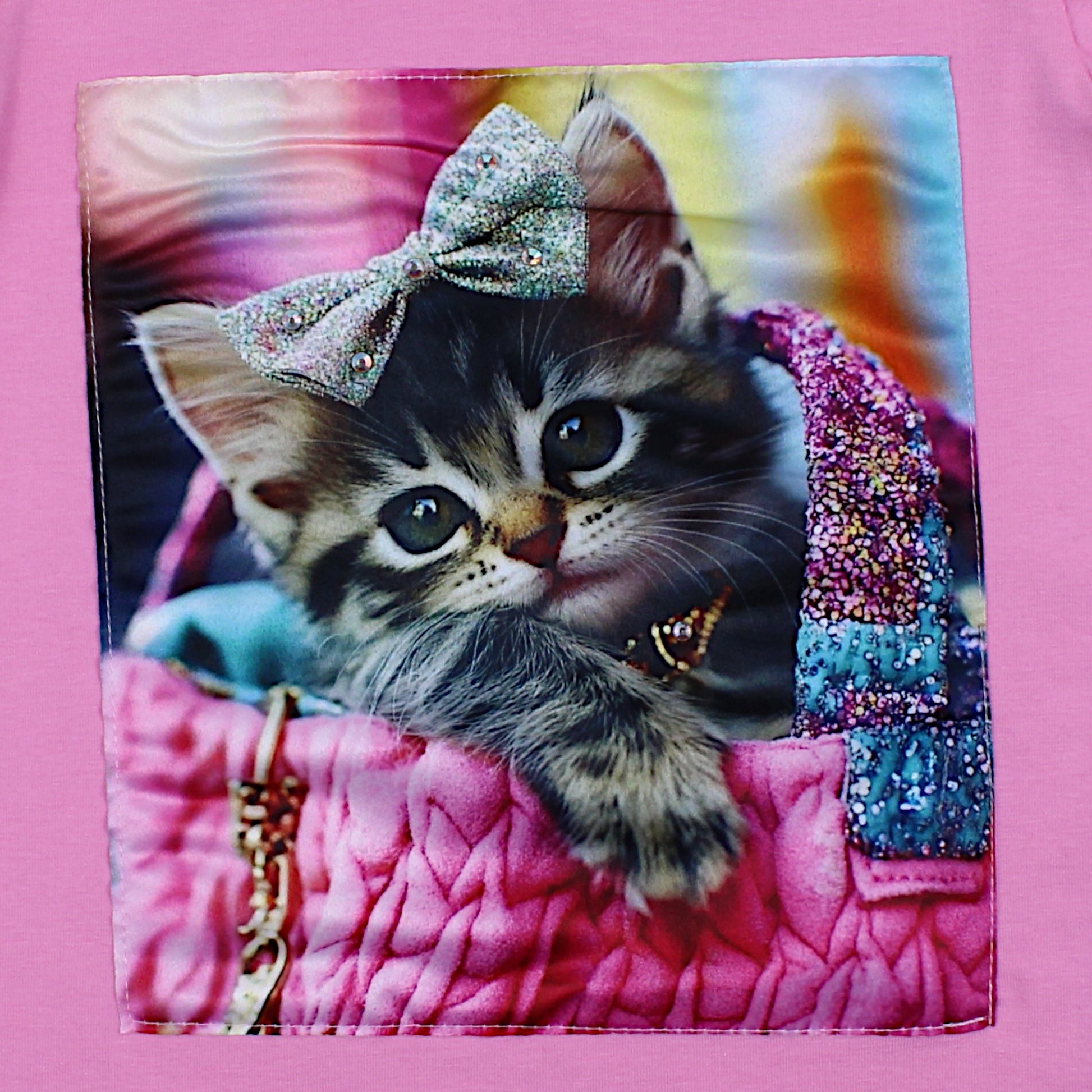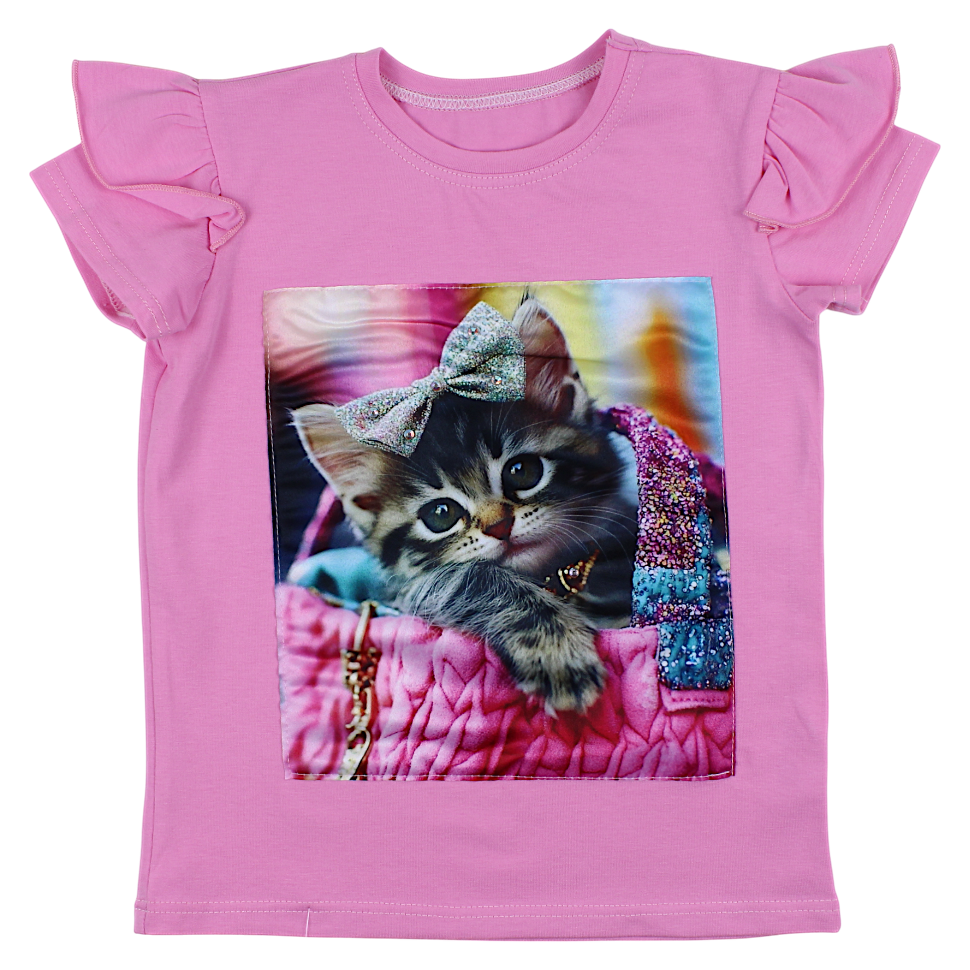 Urocza bluzka dla dziewczynek w różowym kolorze, ozdobiona grafiką z kotkiem w pięknej kokardce. Wykończona falbankami na krótkich rękawach, co dodaje jej niezwykłego wdzięku. Na przodzie znajduje się kolorowy nadruk, który przyciąga wzrok. Bluzka jest idealna na wiosenne i letnie dni. Brak kieszeni i zapięć, co zapewnia komfort noszenia i swobodę ruchu.