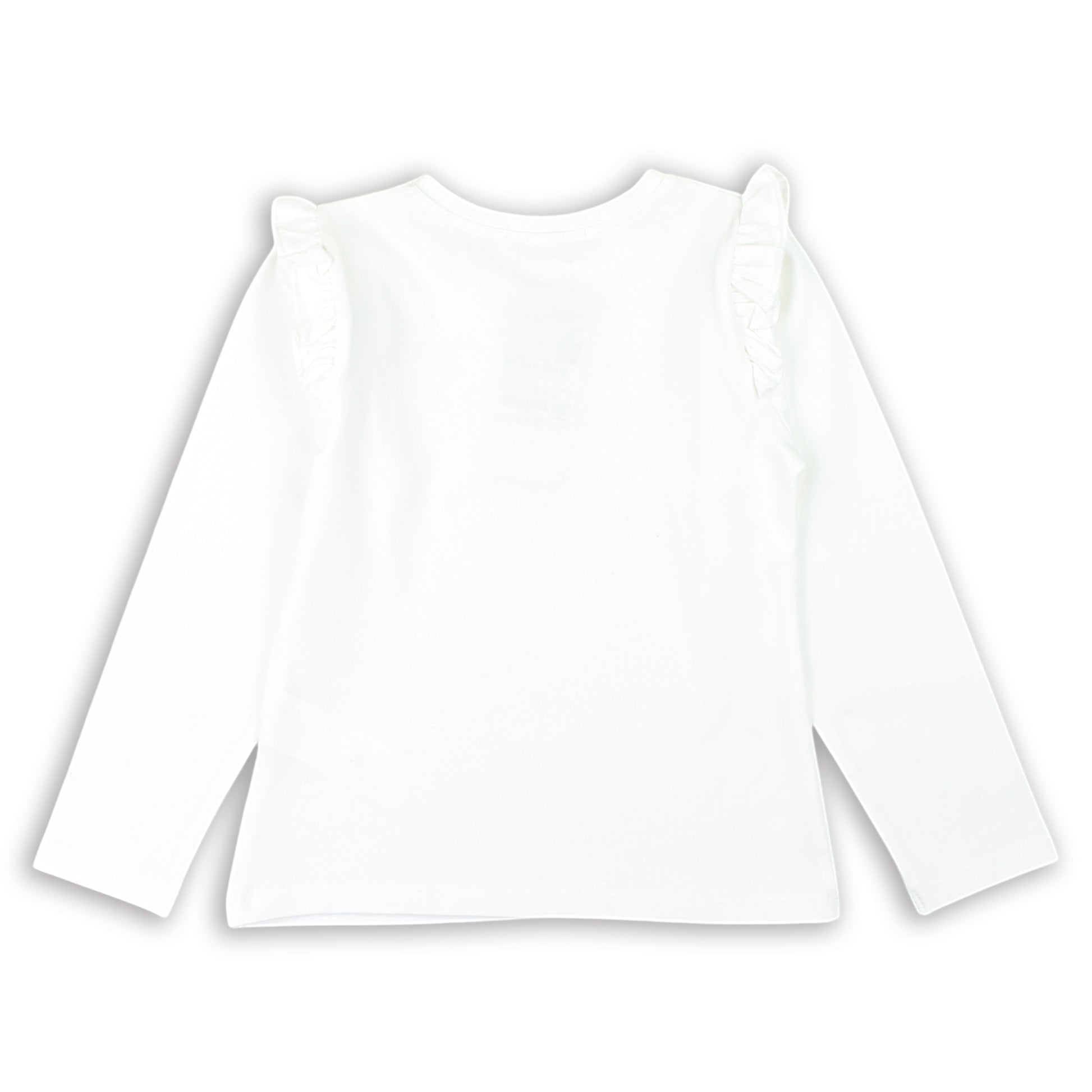 Bluzka dziewczęca z długim rękawem w eleganckim stylu, wykonana z miękkiej bawełny. Model ozdobiony delikatnymi falbankami na ramionach, które dodają dziewczęcego uroku. Na przodzie subtelne aplikacje w kształcie kwiatków i kokardy z połyskujących dżetów. Klasyczny krój zapewnia wygodę noszenia, a elastyczny materiał dopasowuje się do sylwetki. Doskonała na co dzień, jak i na bardziej eleganckie okazje.