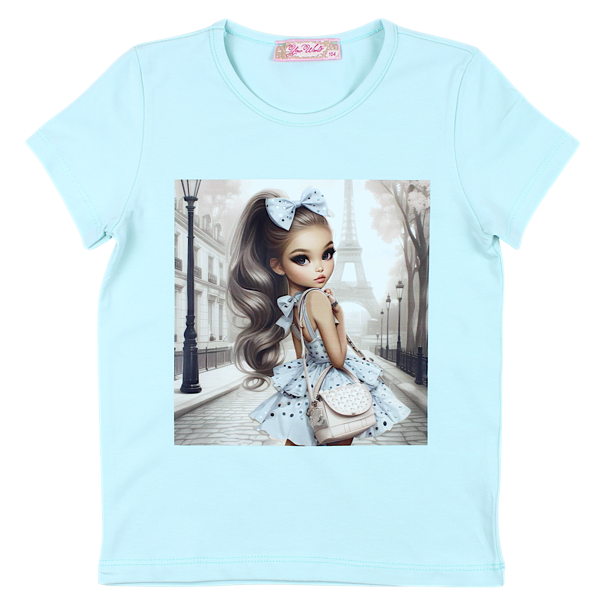 Bluzka dziewczęca w kolorze mięty z krótkimi rękawami to doskonały wybór na cieplejsze dni. Na przodzie znajduje się urocza grafika przedstawiająca dziewczynkę na tle paryskiej ulicy z wieżą Eiffla w tle. Wyrazisty nadruk na środku bluzki dodaje jej unikalnego charakteru. Wykończenia są delikatnie obszyte, co zapewnia trwałość. Materiał jest miękki i elastyczny, co gwarantuje komfort noszenia każdego dnia. Idealna do noszenia w sezonie wiosenno-letnim.