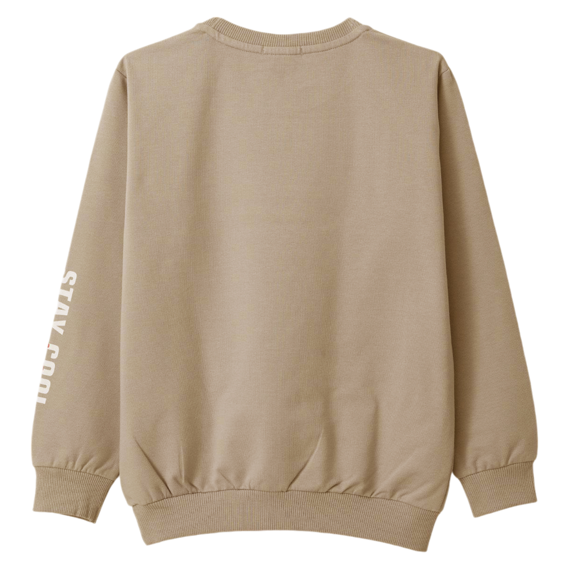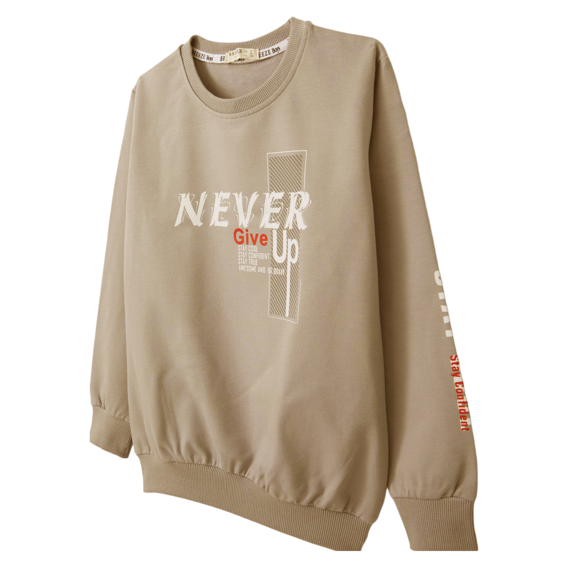 Cienka bluza chłopięca, beżowa z kolekcji jesień-zima, z nadrukiem "NEVER GIVE UP" oraz inspirującymi hasłami na przodzie. Długie rękawy ozdobione napisem "STAY COOL" oraz elastyczne ściągacze na mankietach i u dołu zapewniają komfort i styl. Bluza wkładana przez głowę, nie posiada kieszeni ani zapięć, co czyni ją prostą i wygodną w użytkowaniu. Idealna na co dzień, lekka i funkcjonalna.
