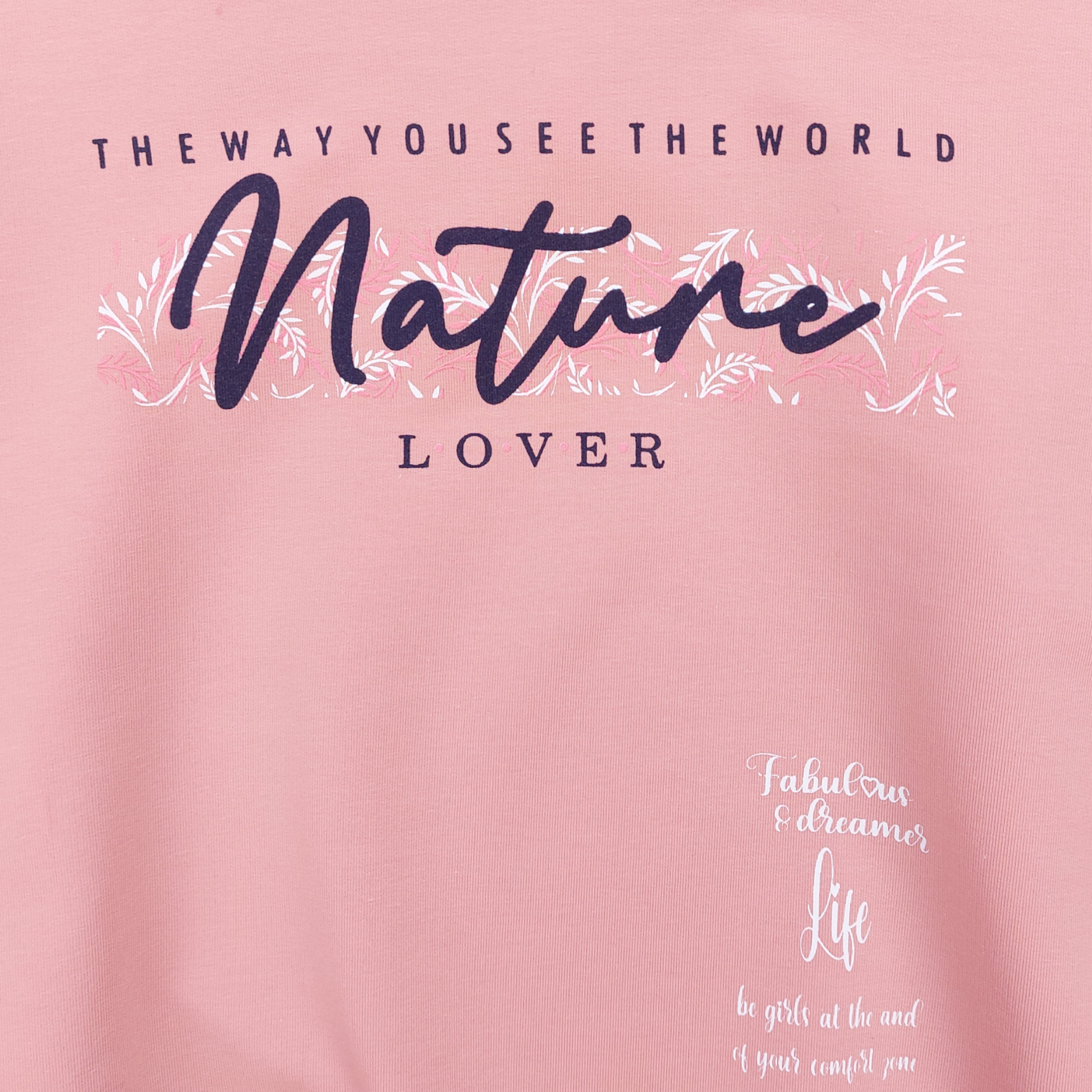 - Różową bluzę z kapturem – idealną na chłodniejsze dni. Wyjątkowy nadruk "Nature Lover" podkreśla zamiłowanie do natury, a dodatkowe subtelne napisy stanowią modne wykończenie. Elastyczne ściągacze u dołu oraz na rękawach gwarantują wygodę i ochronę przed chłodem.