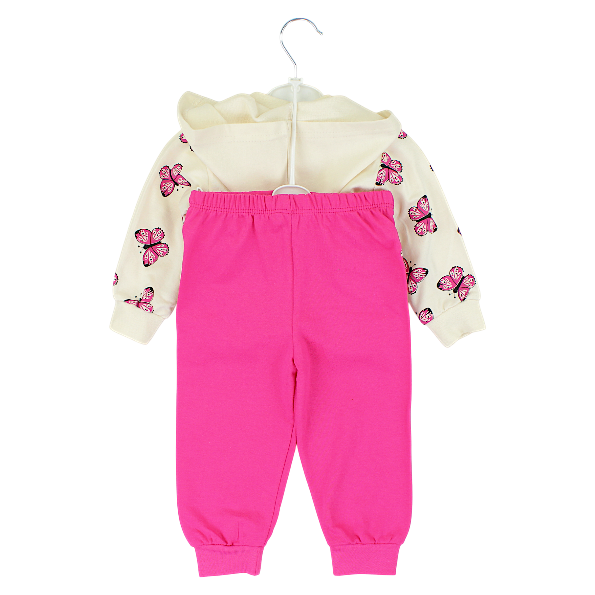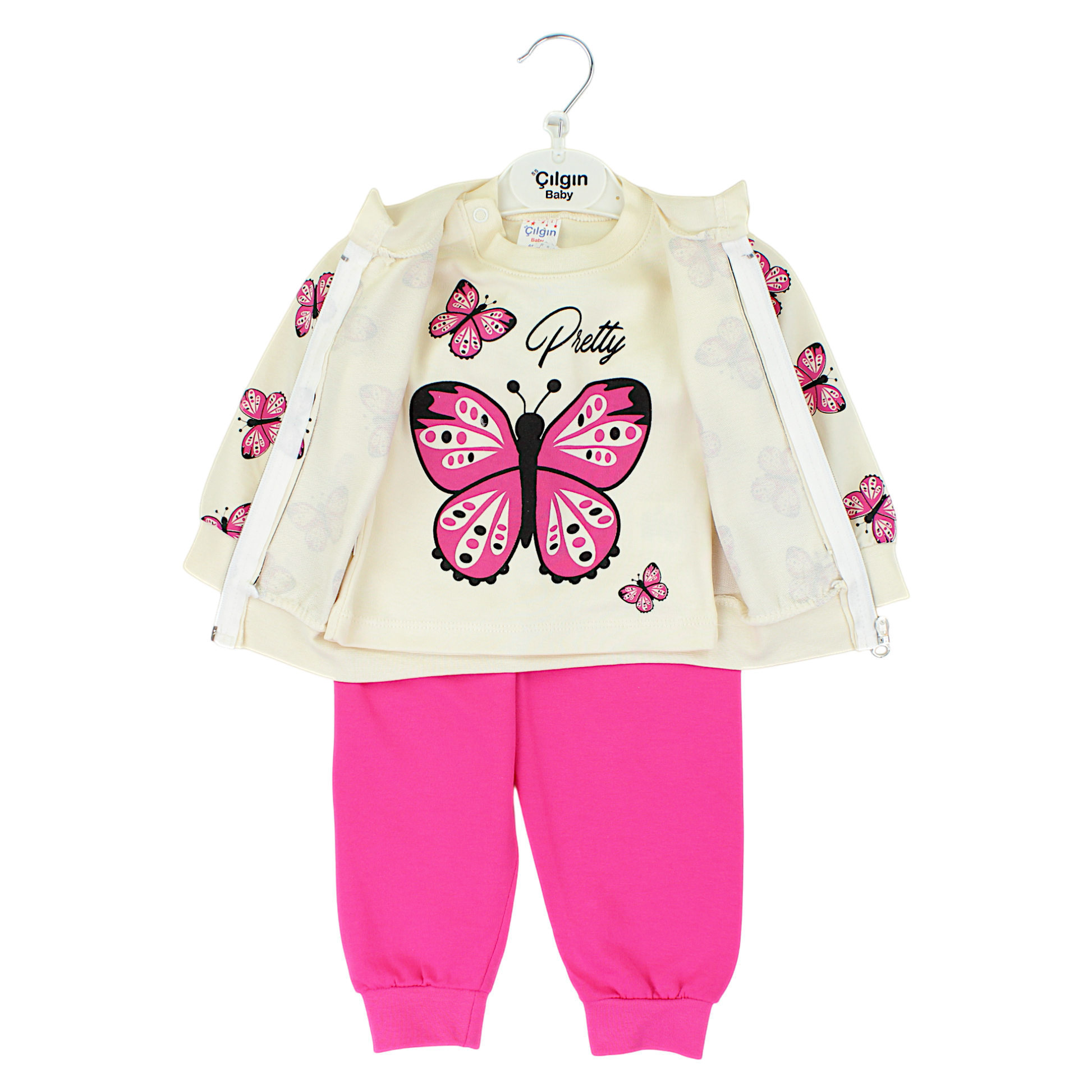 Dres 3-częściowy Motylek dziewczęcy Cilgin Baby 3639-27225, idealny na wiosnę i lato. Komplet składa się z rozpinanej bluzy z kapturem, bluzki z krótkim rękawem oraz spodni dresowych. Bluza w kolorze ecru z różowymi motylkami posiada zamek błyskawiczny oraz elastyczne ściągacze. Bluzka z nadrukiem dużego motyla w odcieniach fuksji dodaje uroku stylizacji. Spodnie w kolorze fuksji mają elastyczną gumkę w pasie, zapewniając komfort noszenia.