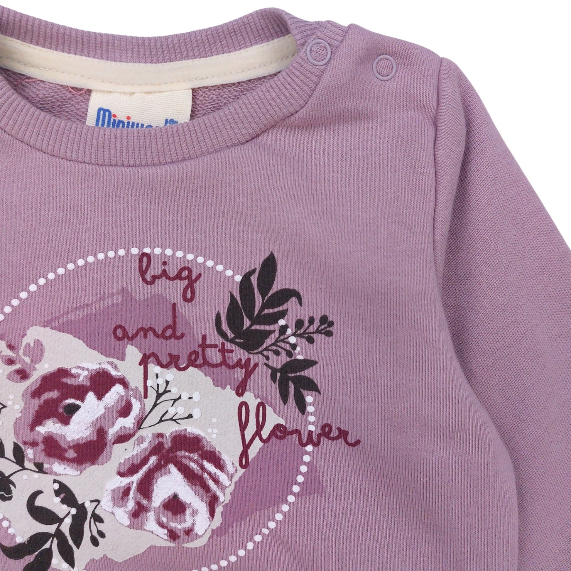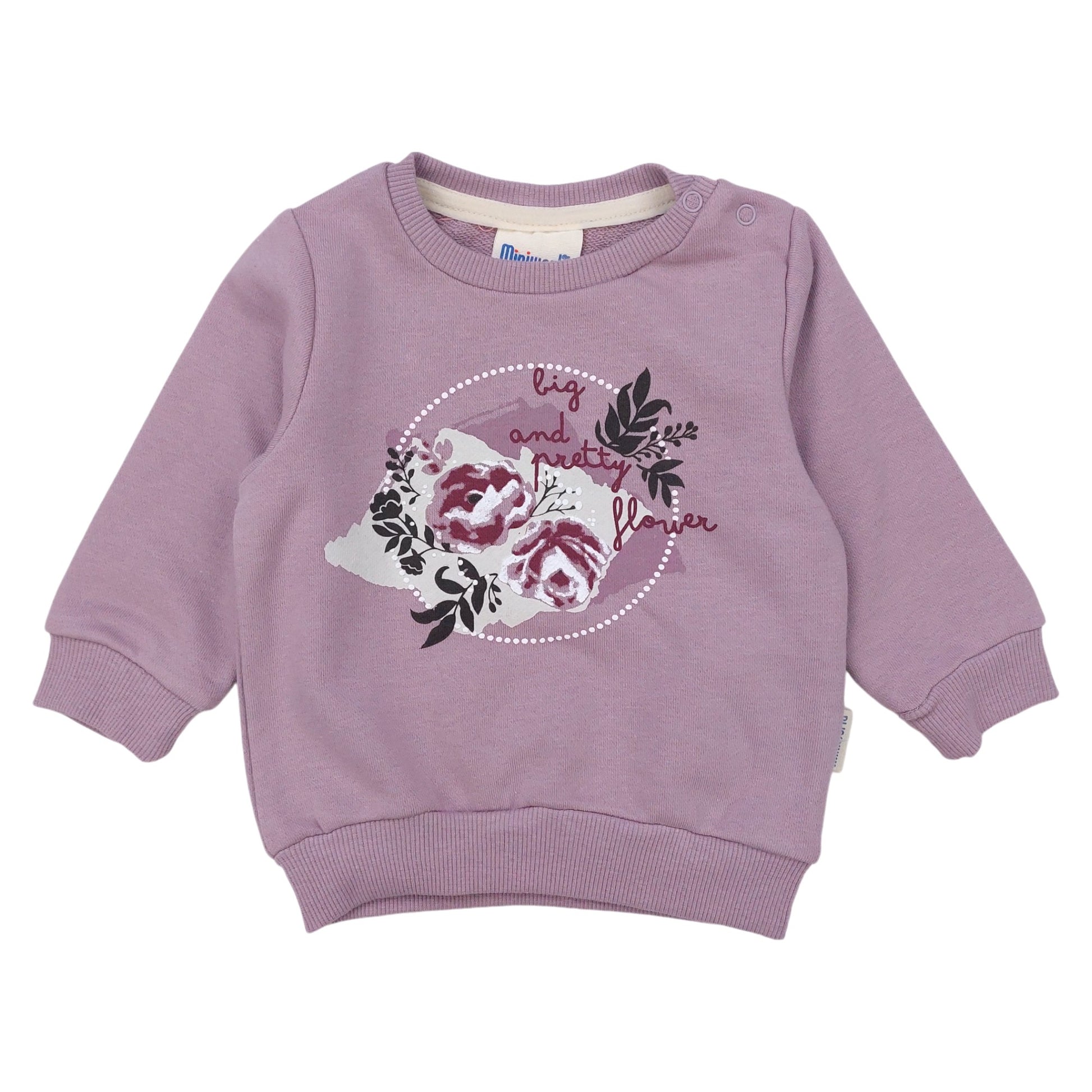 Dres dziewczęcy Mini World z kolekcji jesień-zima, model 18477-30924 to stylowy zestaw składający się z bluzy oraz spodni. Bluza w kolorze fioletowym, ozdobiona motywem kwiatowym z napisem „big and pretty flower” na przodzie, posiada wygodne zapięcia na guziczki przy ramieniu, co ułatwia zakładanie. Spodnie są zdobione delikatnym kwiatowym wzorem, co tworzy piękne połączenie z bluzą. Zarówno bluza, jak i spodnie wykończone są ściągaczami, co zapewnia komfort noszenia i dopasowanie do ciała. Długi rękaw i elastyczna talia zapewniają wygodę w codziennym użytkowaniu.