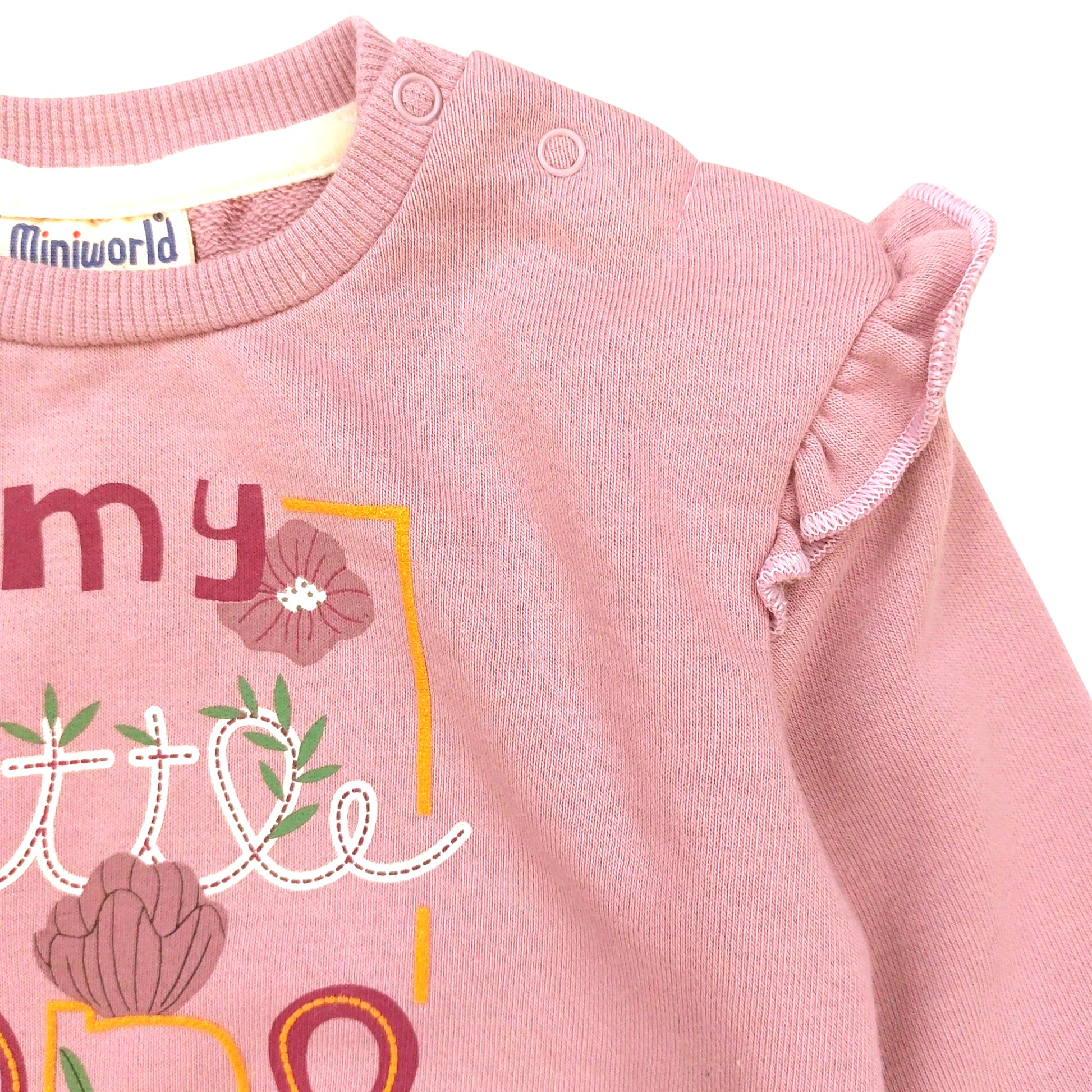 Dres dziewczęcy Mini World w kolorze fioletowym to idealna propozycja dla małych księżniczek na chłodniejsze dni. Bluza z długim rękawem posiada subtelne falbanki na ramionach, które dodają jej dziewczęcego uroku, a nadruk „ my little one ” z kwiatowymi elementami nadaje całości stylowego wyglądu. Zapięcia na guziki przy ramieniu sprawiają, że bluza jest łatwa do zakładania i zdejmowania, co jest praktycznym rozwiązaniem na co dzień.