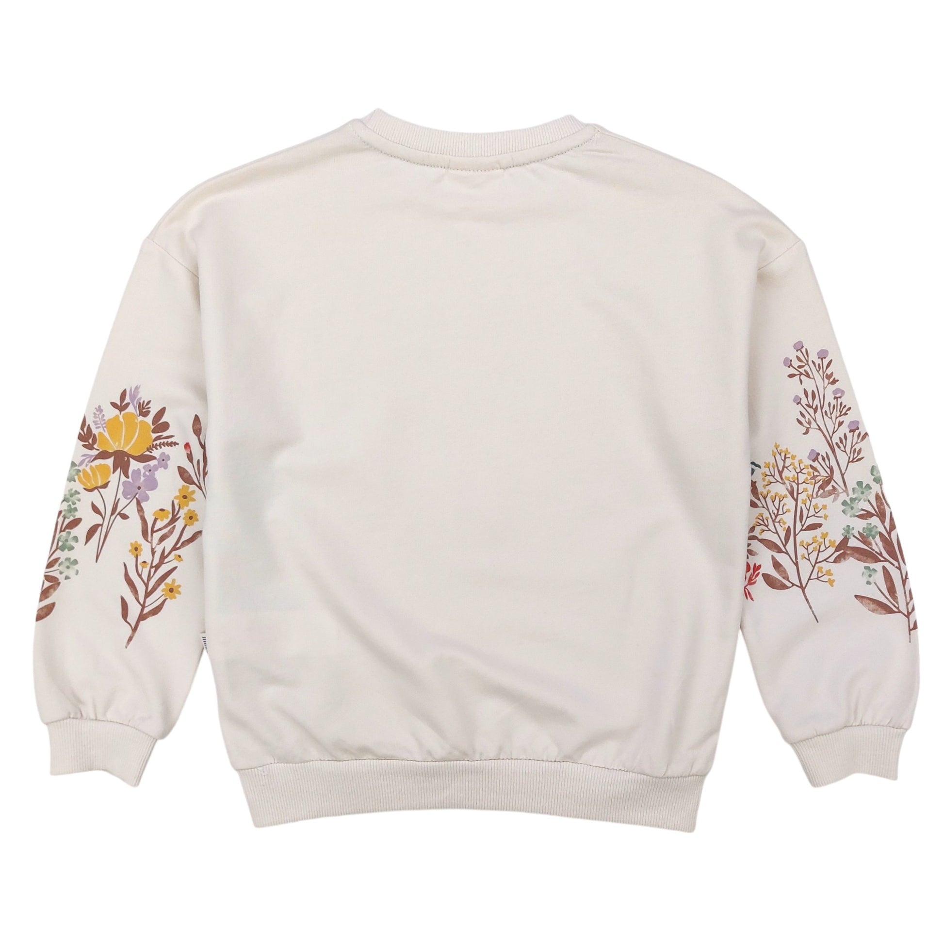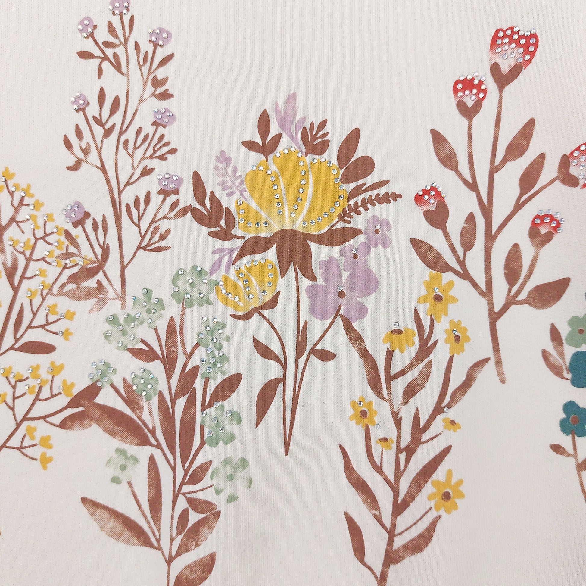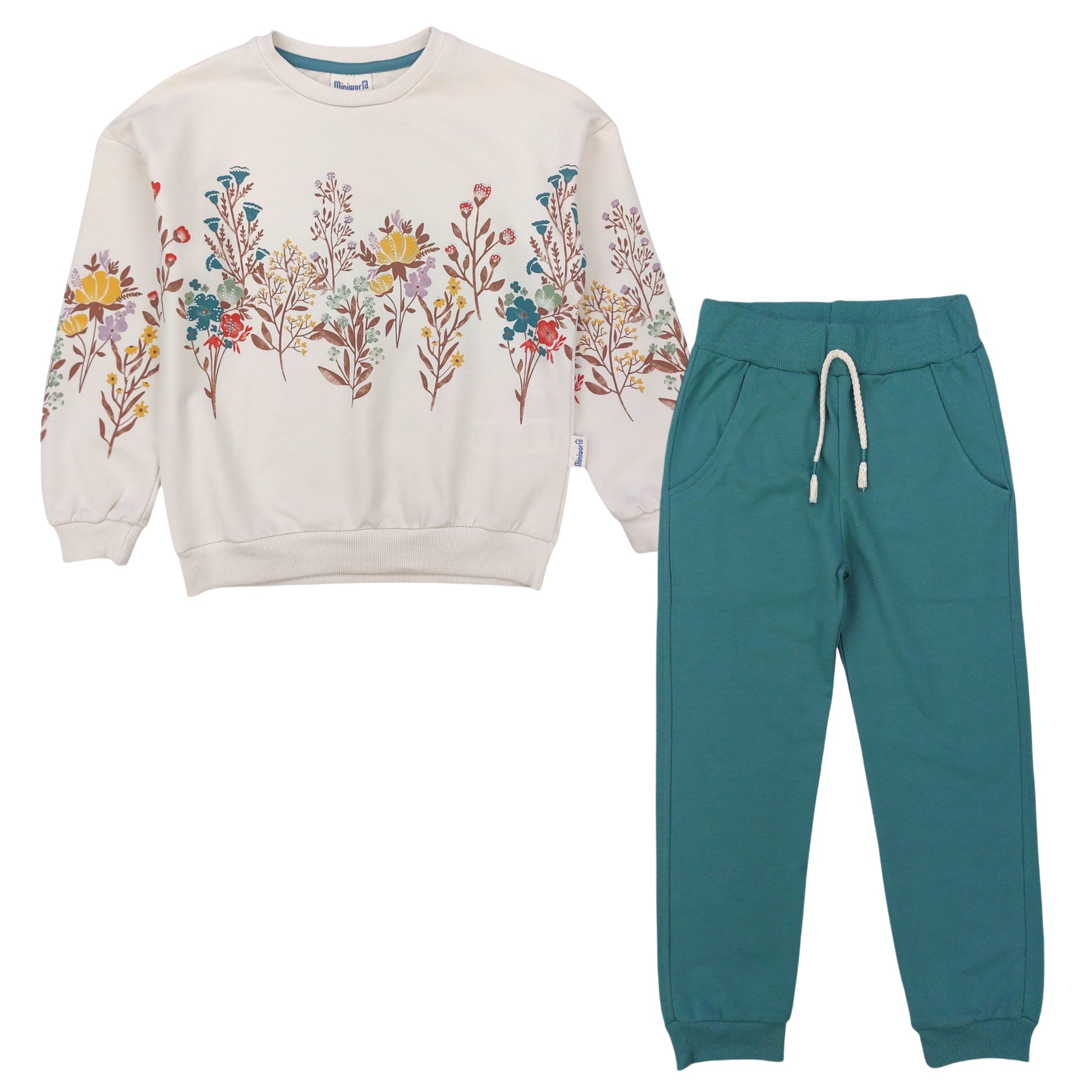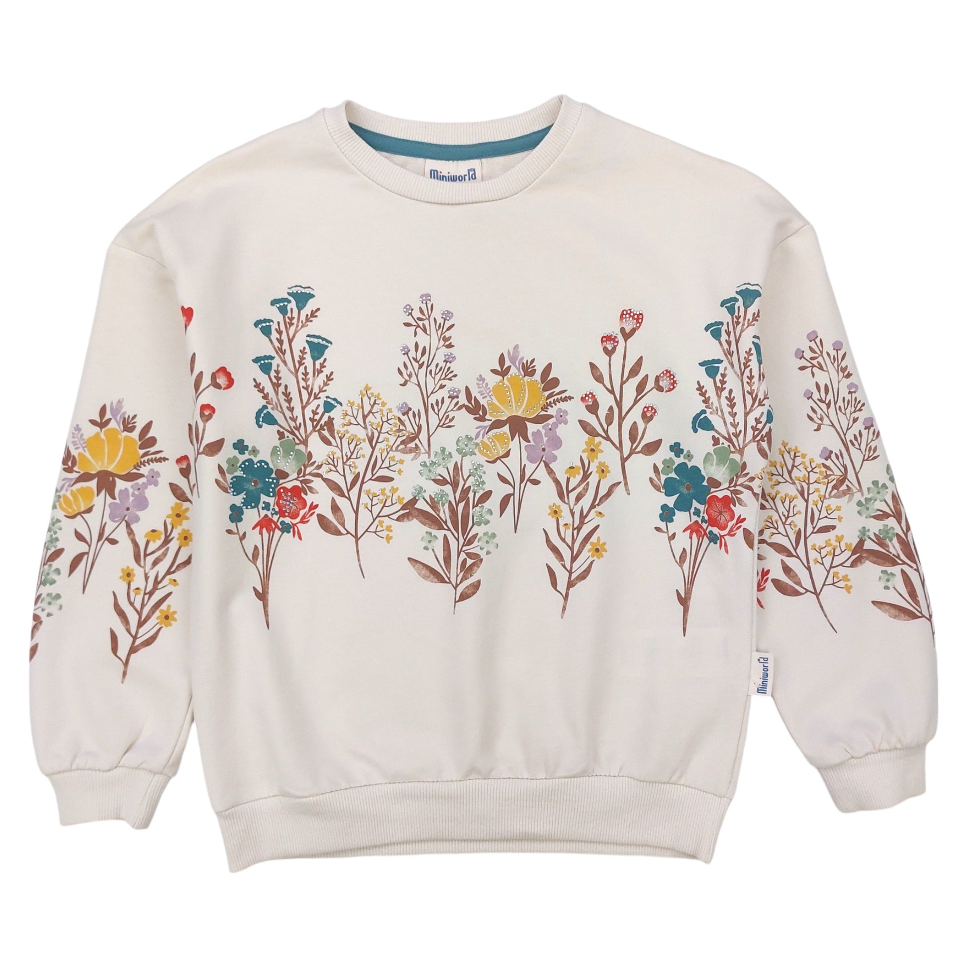 Bluza: Beżowa bluza o luźnym kroju zachwyca subtelnym nadrukiem przedstawiającym kwiaty w żywych kolorach. Nadruk przyciąga wzrok, nadając całości lekkości i dziewczęcego uroku. Ściągacze na rękawach i dolnej części bluzy gwarantują dobre dopasowanie, jednocześnie zapewniając swobodę ruchów. To doskonały wybór na chłodniejsze dni, kiedy dziecko potrzebuje zarówno ciepła, jak i stylowego wyglądu.
