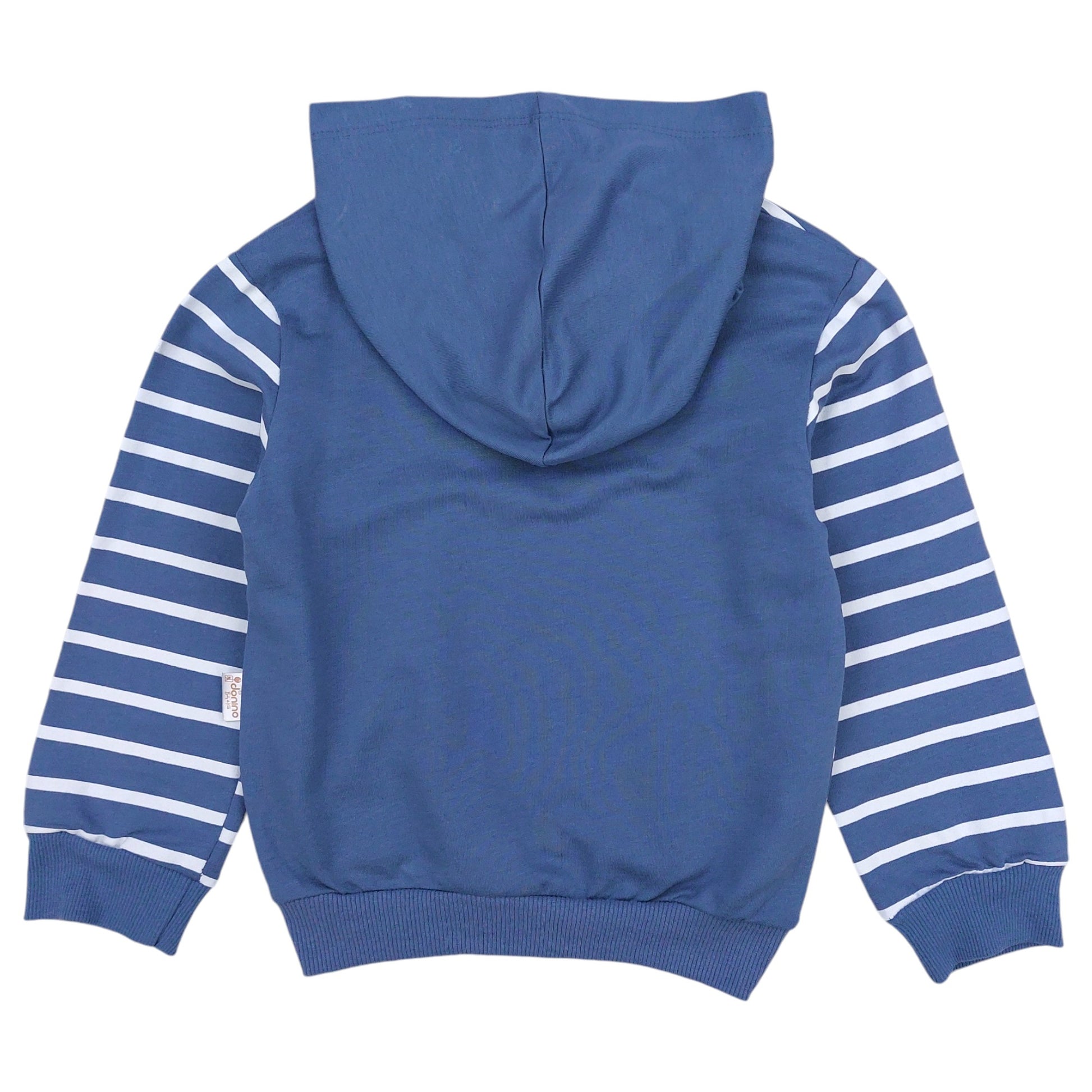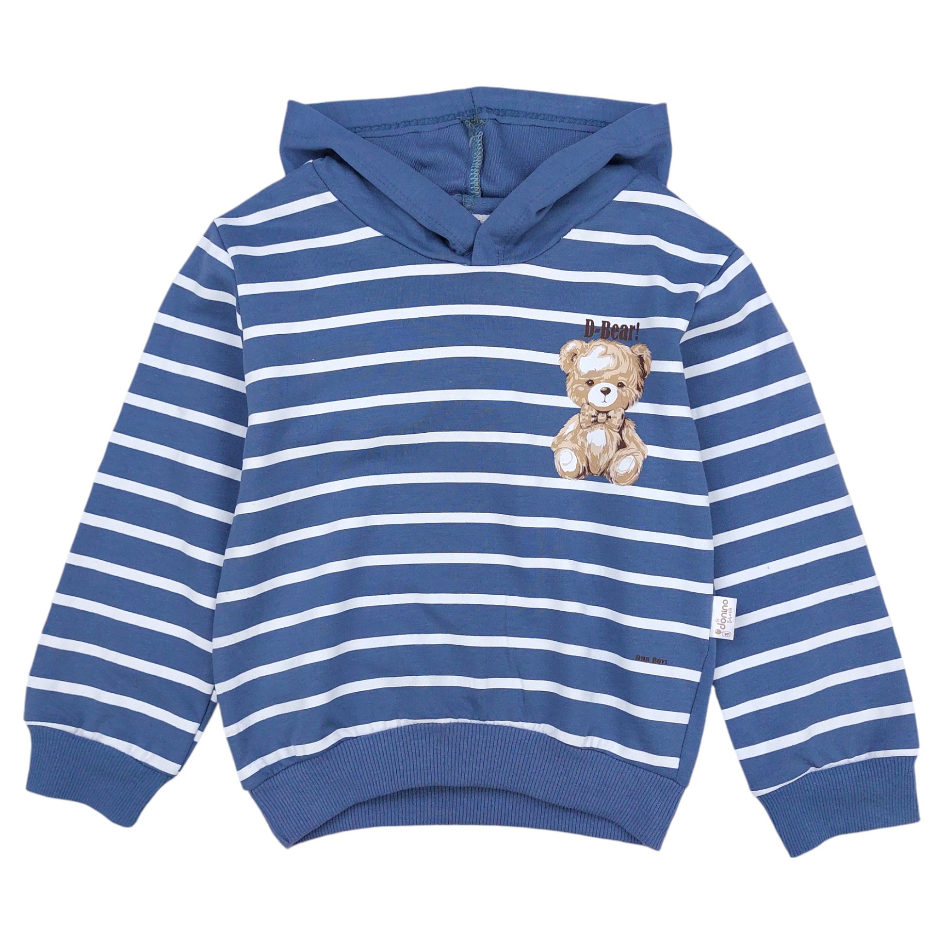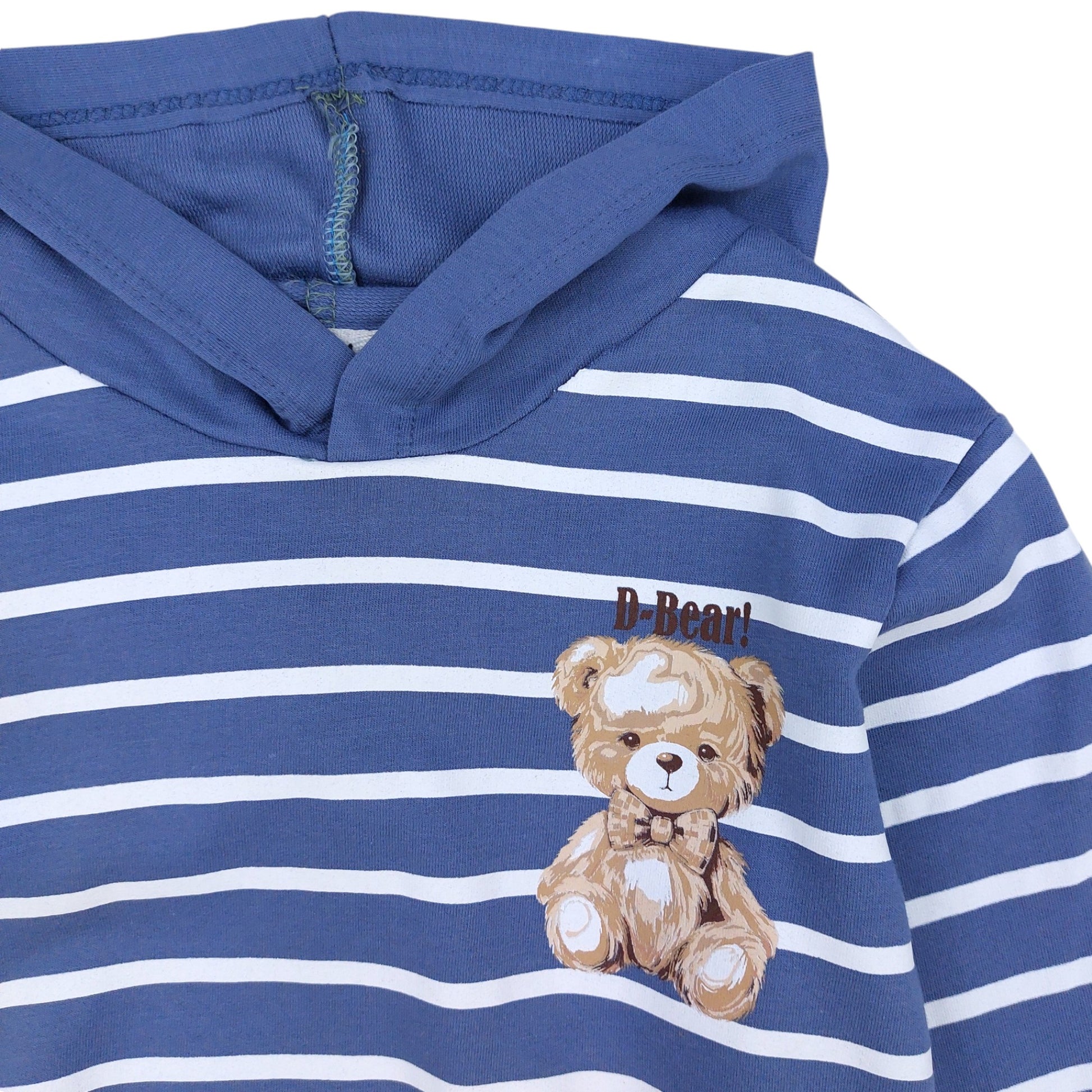 Dres dziecięcy Donino 2-częściowy w kolorze niebieskim, idealny na sezon jesień-zima. Bluza z kapturem ozdobiona uroczym motywem misia oraz paskami w poziomie. Spodnie o wygodnym, elastycznym ściągaczu w pasie. Miękki materiał (95% bawełna, 5% lycra) zapewnia komfort i swobodę ruchów, jednocześnie utrzymując ciepło. To doskonały wybór na codzienne aktywności Twojego dziecka.