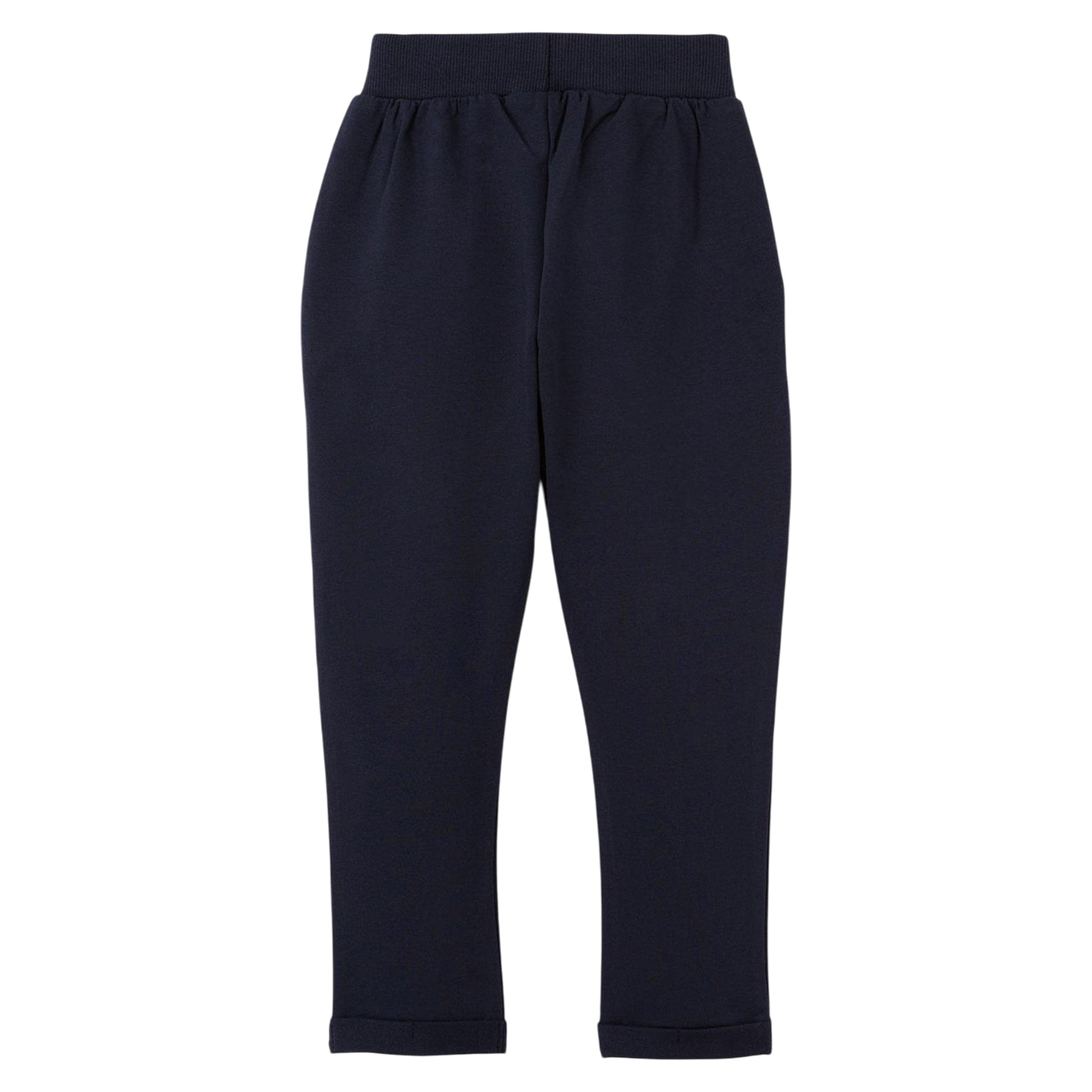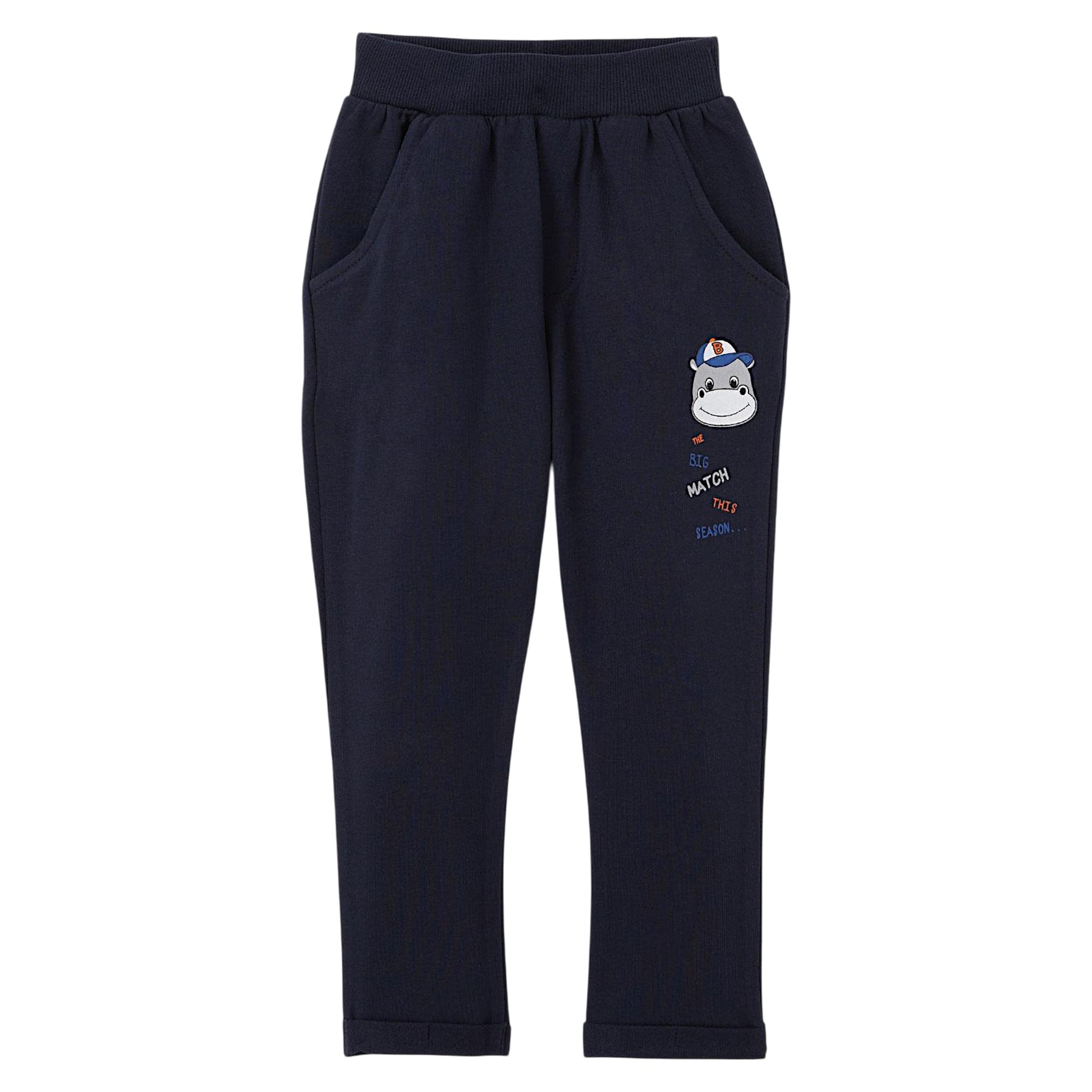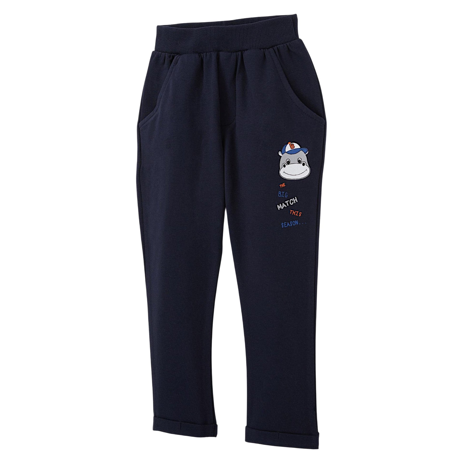 Spodnie chłopięce dresowe w granatowym kolorze posiadają praktyczne kieszenie , dzięki którym dziecko może nosić ze sobą drobne skarby. Elastyczna gumka w pasie zapewnia wygodne dopasowanie, a luźny krój nie krępuje ruchów, co sprawia, że są idealne zarówno do zabawy, jak i na spacer. Na jednej nogawce znajduje się nadruk hipopotama , nawiązujący do wzoru na bluzce, co dodaje zestawowi spójności.