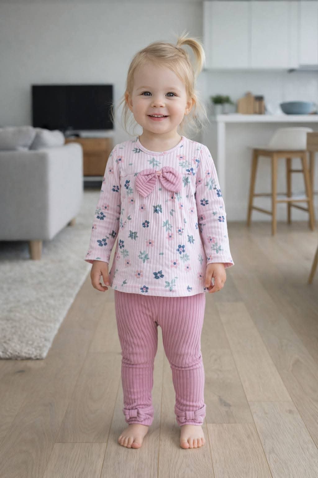 Ten uroczy komplet dziewczęcy w kwiaty to doskonały wybór na sezon jesień-zima. Wykonany z miękkiej bawełny, zapewnia komfort i ciepło. Komplet składa się z dwóch części: bluzki z długim rękawem i spodni. Bluzka ma delikatny, różowy kolor z kwiatowym wzorem, a spodnie są jednolite, co tworzy harmonijną całość. Idealny dla małych dziewczynek, które cenią sobie wygodę i styl. Produkt nie posiada kieszeni ani zapięć, co ułatwia jego zakładanie.