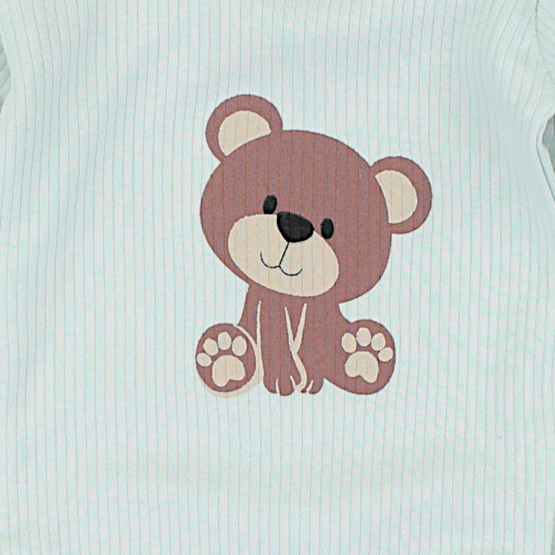 Uroczy komplet niemowlęcy składający się z body z długim rękawem oraz półśpiochów w pastelowym, miętowym kolorze. Body zapinane jest na napy na ramieniu i w kroku, co ułatwia przewijanie i ubieranie maluszka. Na przodzie znajduje się słodki nadruk misia, a półśpiochy ozdobione są wzorem małych misiów, które dodają uroku. Wykonany z delikatnej, przewiewnej bawełny, która jest bezpieczna dla wrażliwej skóry dziecka. Idealny wybór na wiosnę i lato – zarówno do spania, jak i na codzienne zabawy.