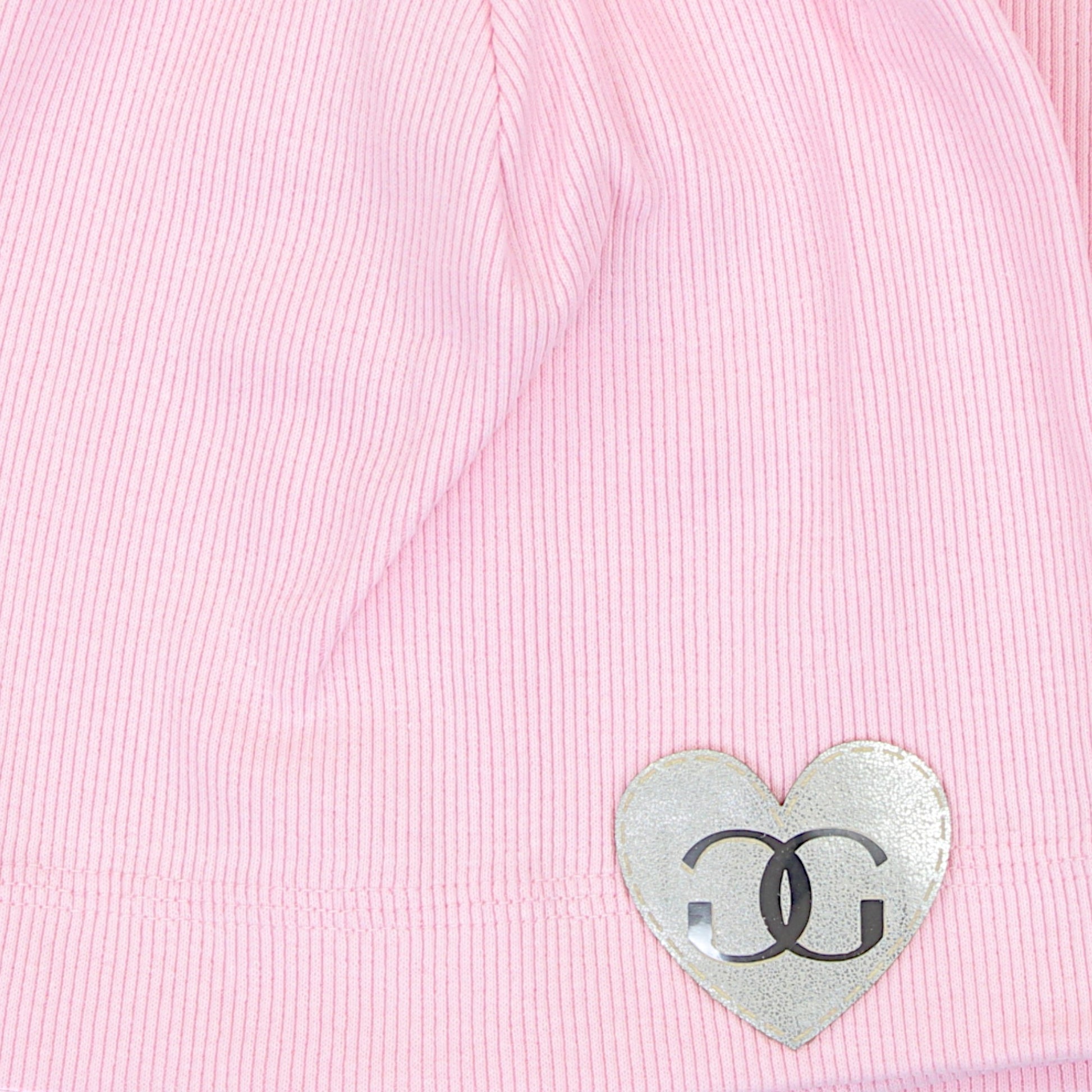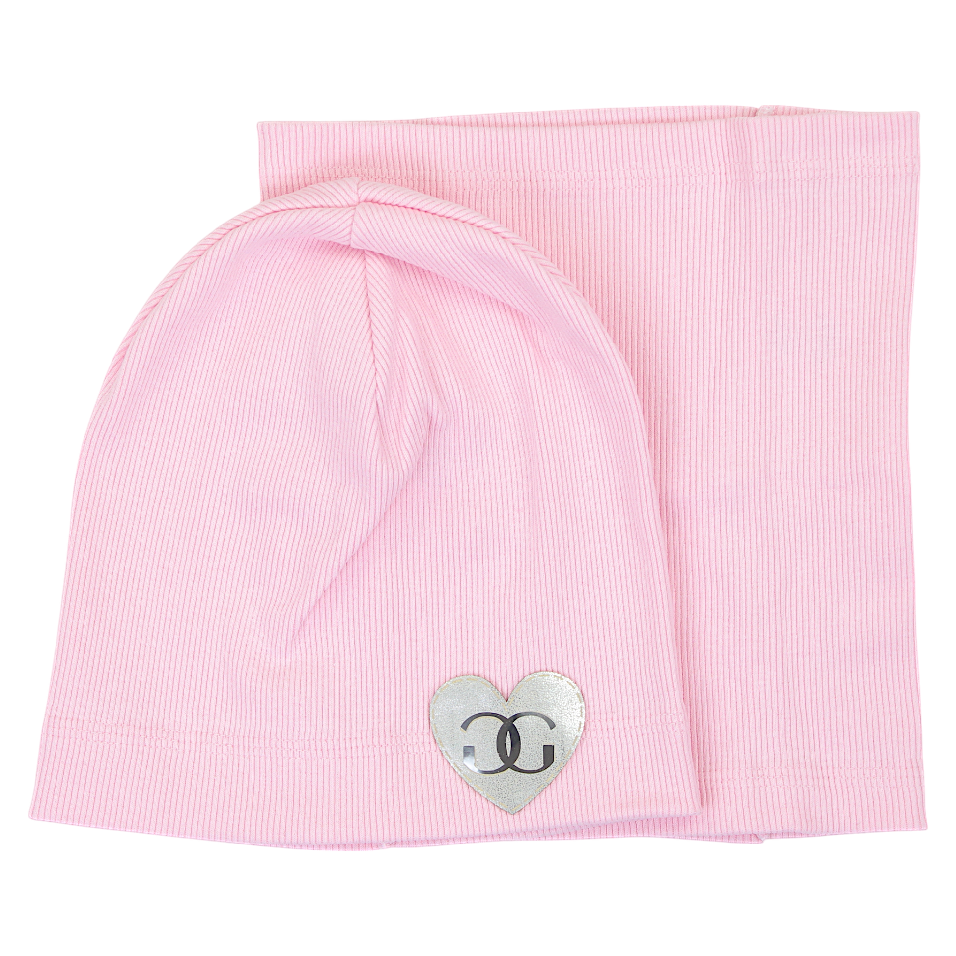 Stylowy komplet dziewczęcy składający się z czapki i komina, wykonany z przyjemnej w dotyku, elastycznej bawełny. Różowy komplet ma subtelną prążkowaną fakturę, a czapka została ozdobiona aplikacją w kształcie serca z dekoracyjnym logo, nadając jej wyjątkowego uroku. Elastyczna tkanina zapewnia idealne dopasowanie, a lekka i przewiewna struktura sprawia, że komplet jest doskonałym wyborem na wiosenne i letnie dni.