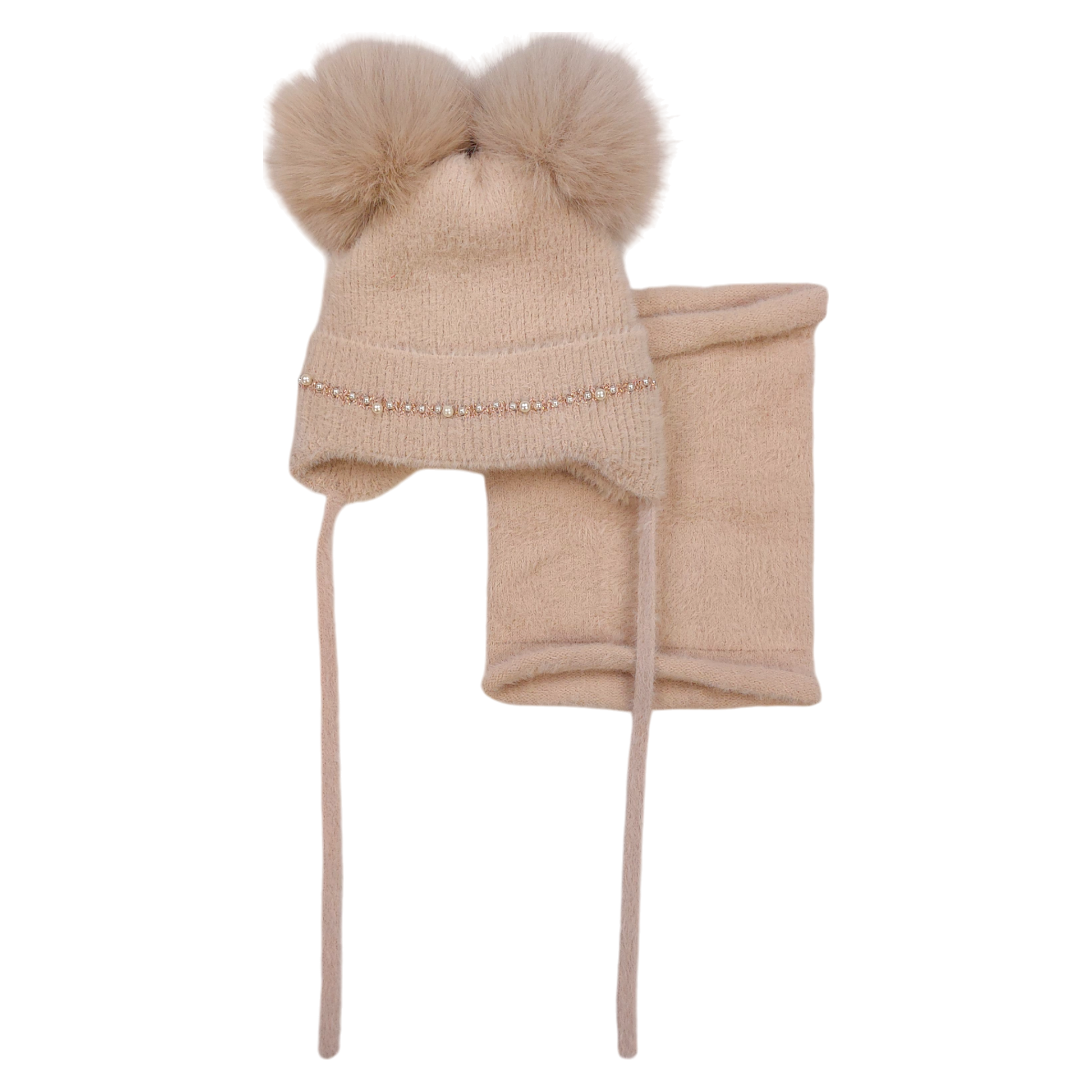 Komplet czapka z kominem 2 pompny dziewczęcy beż Ambra D68-241024-40