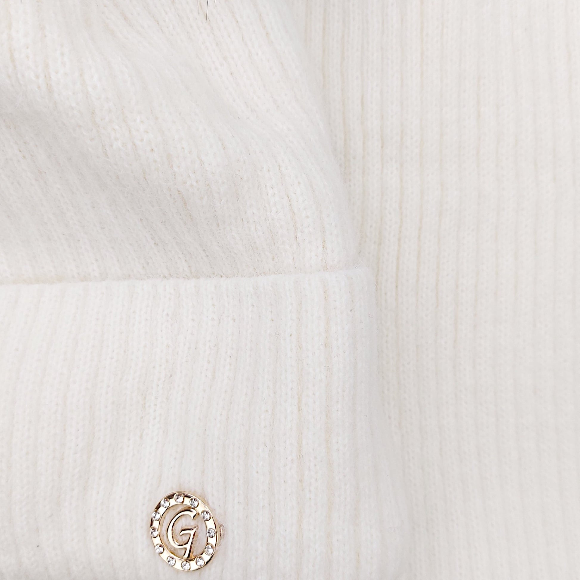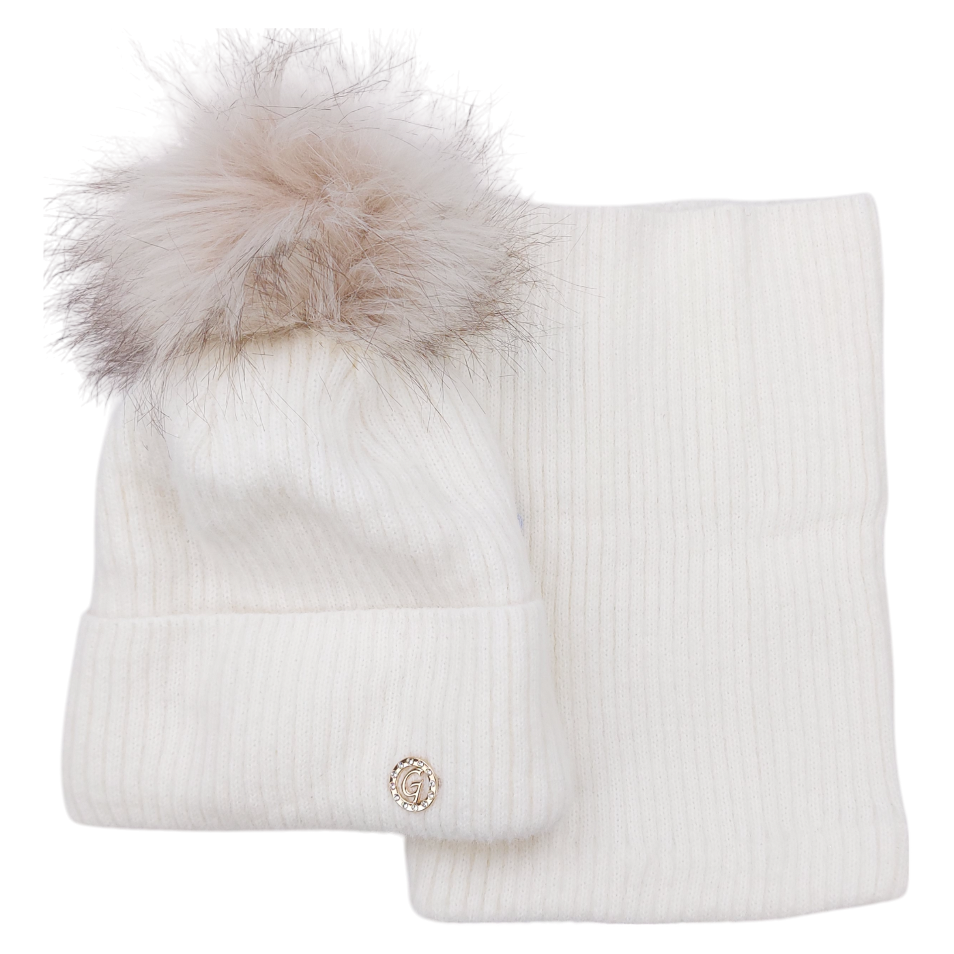Ciepły i stylowy komplet zimowy dla dziewczynki w kremowym kolorze, w skład którego wchodzi czapka z eleganckim pomponem oraz komin. Czapka posiada ozdobne złote logo z cyrkoniami, które dodaje uroku, a elastyczna podszewka z polaru zapewnia doskonałą ochronę przed chłodem. Komin jest wykonany z miękkiego, prążkowanego materiału, idealnie przylegającego do szyi.