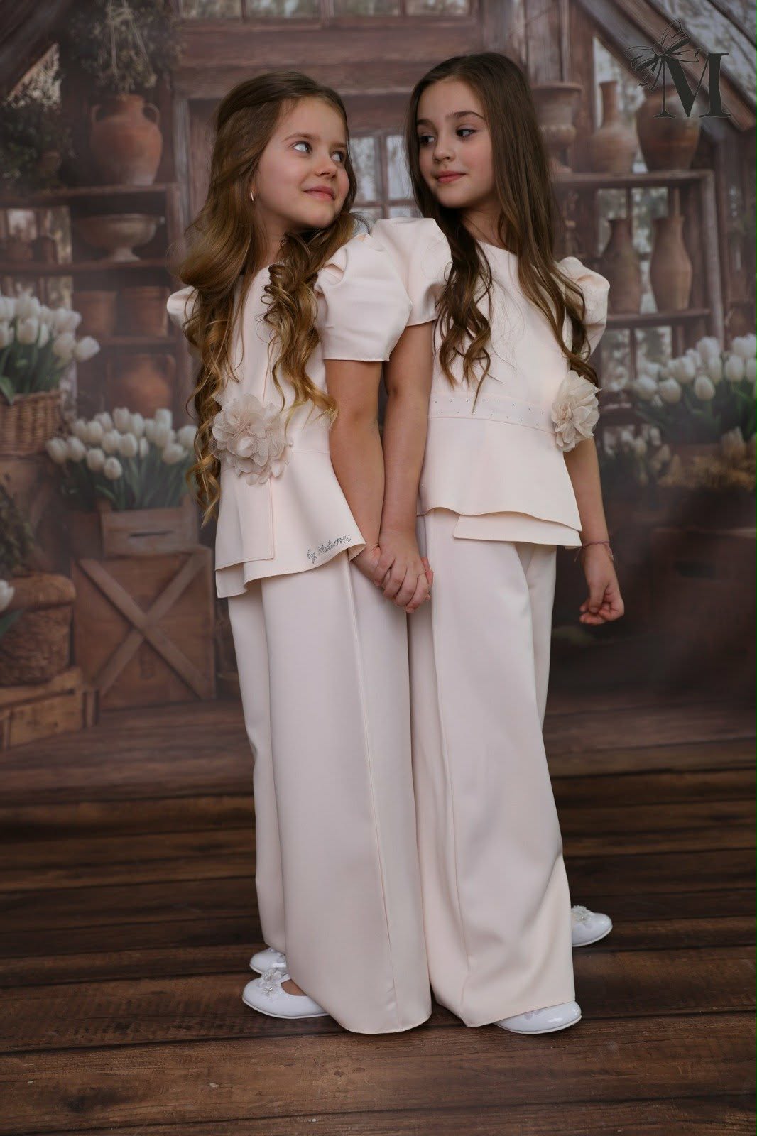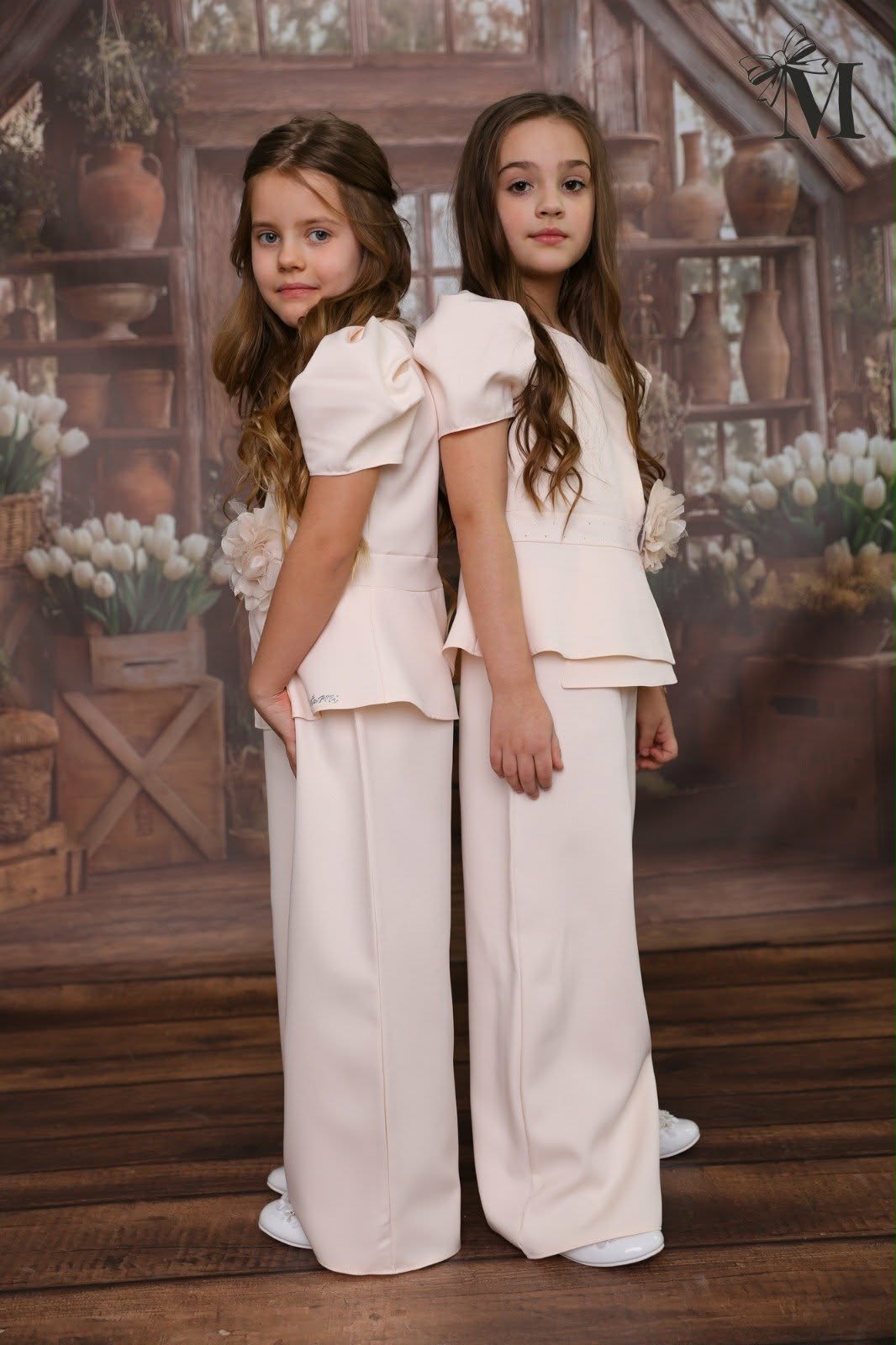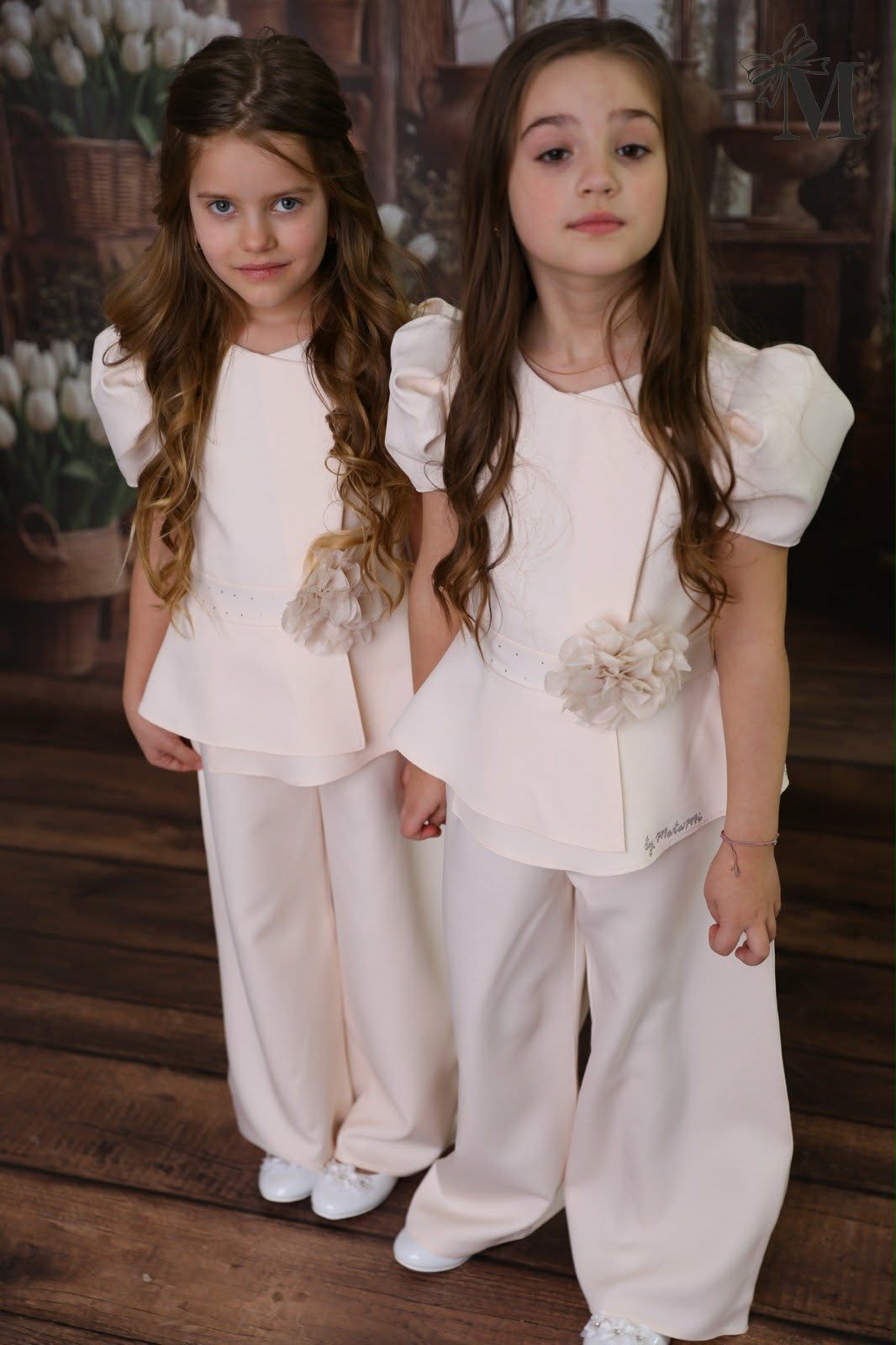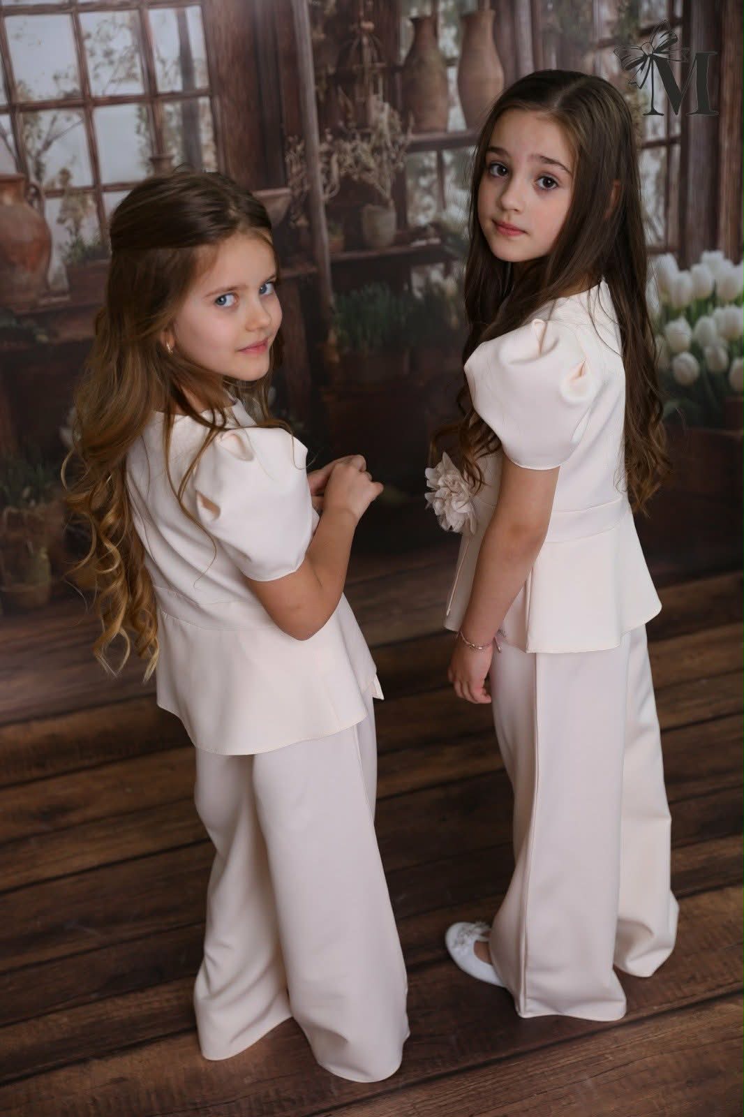Elegancki komplet dziewczęcy z bluzką i spodniami w kolorze waniliowym