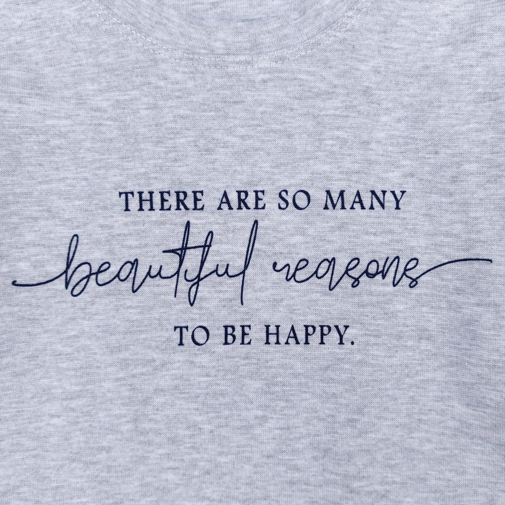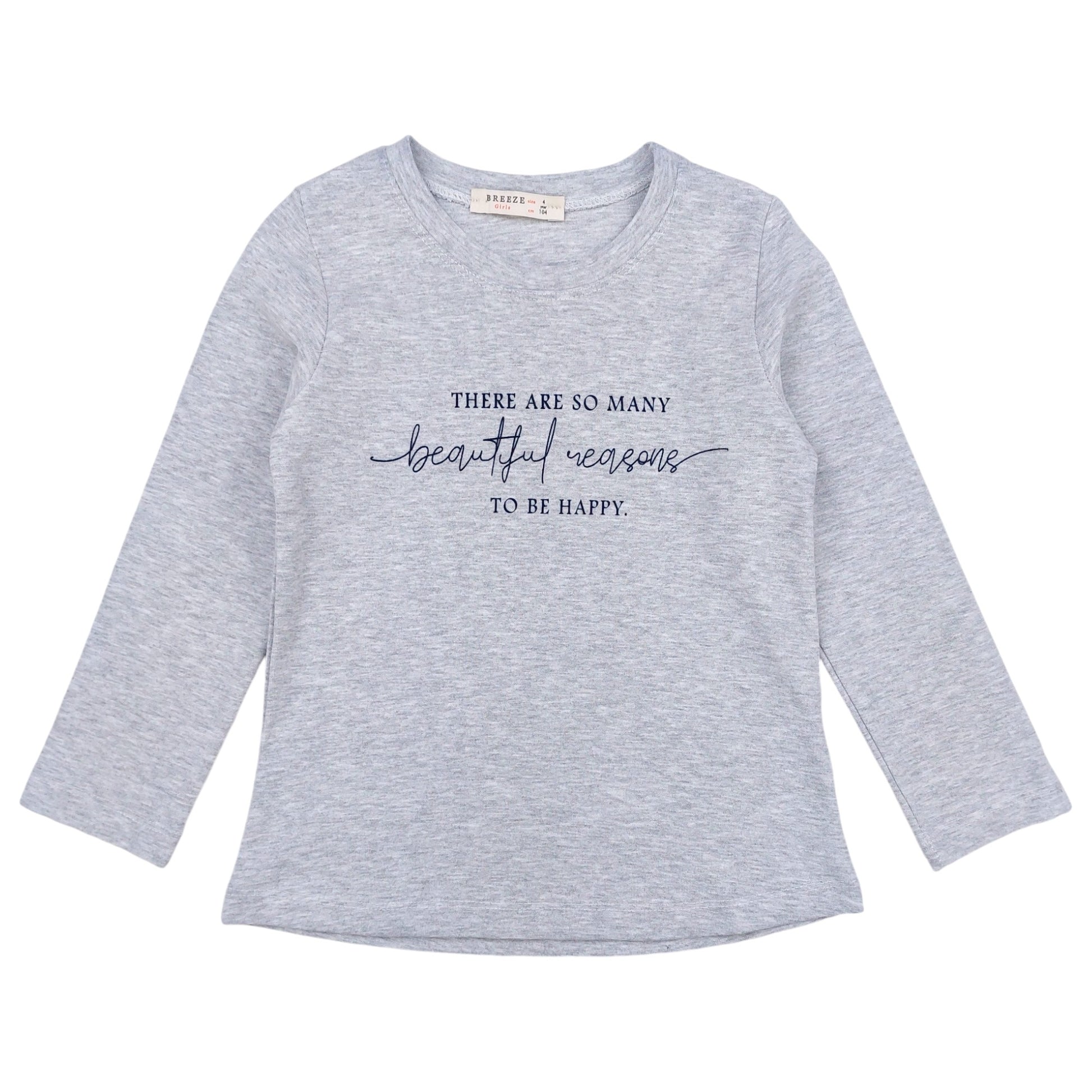 Komplet dziewczęcy składający się z bluzki z długim rękawem i spodni typu dzwony w kolorze szarym marki Breeze, model 19709-23824 GKMOD, pochodzi z kolekcji jesień-zima. Bluzka posiada subtelny nadruk z napisem "There are so many beautiful reasons to be happy", który nadaje całości wyjątkowego charakteru. Spodnie o fasonie dzwonów doskonale komponują się z bluzką, tworząc wygodny i modny zestaw na co dzień. Wykonany z miękkiej tkaniny, która składa się w 45% z bawełny, 45% z poliestru i 10% z elastanu, zapewniając komfort noszenia i elastyczność. Idealny wybór na chłodniejsze dni!