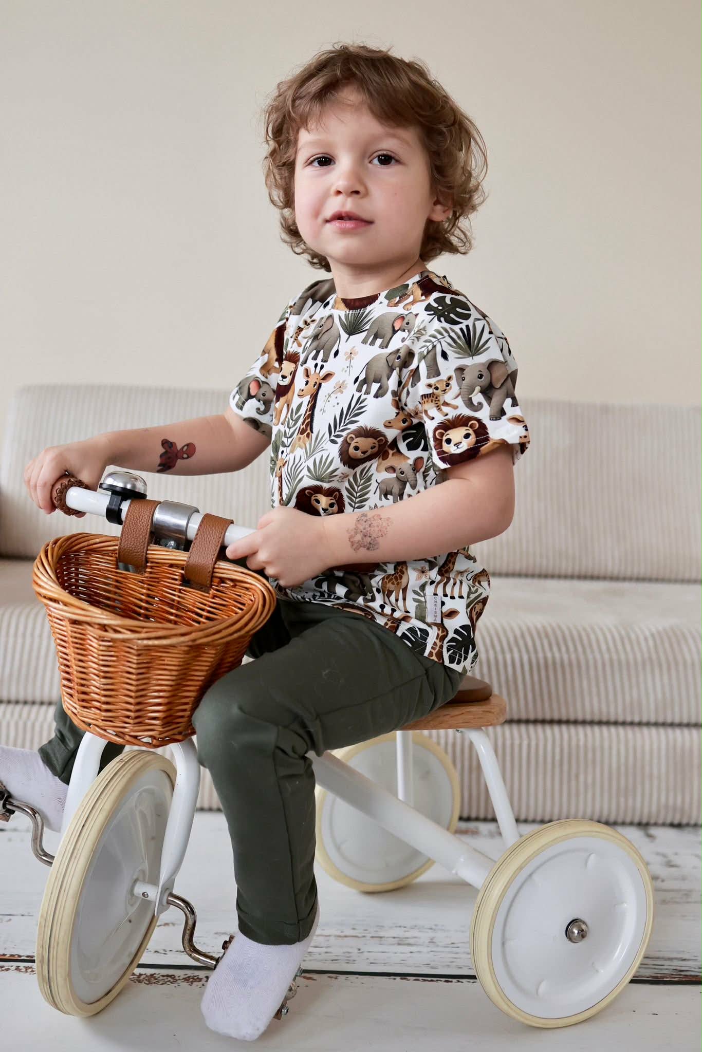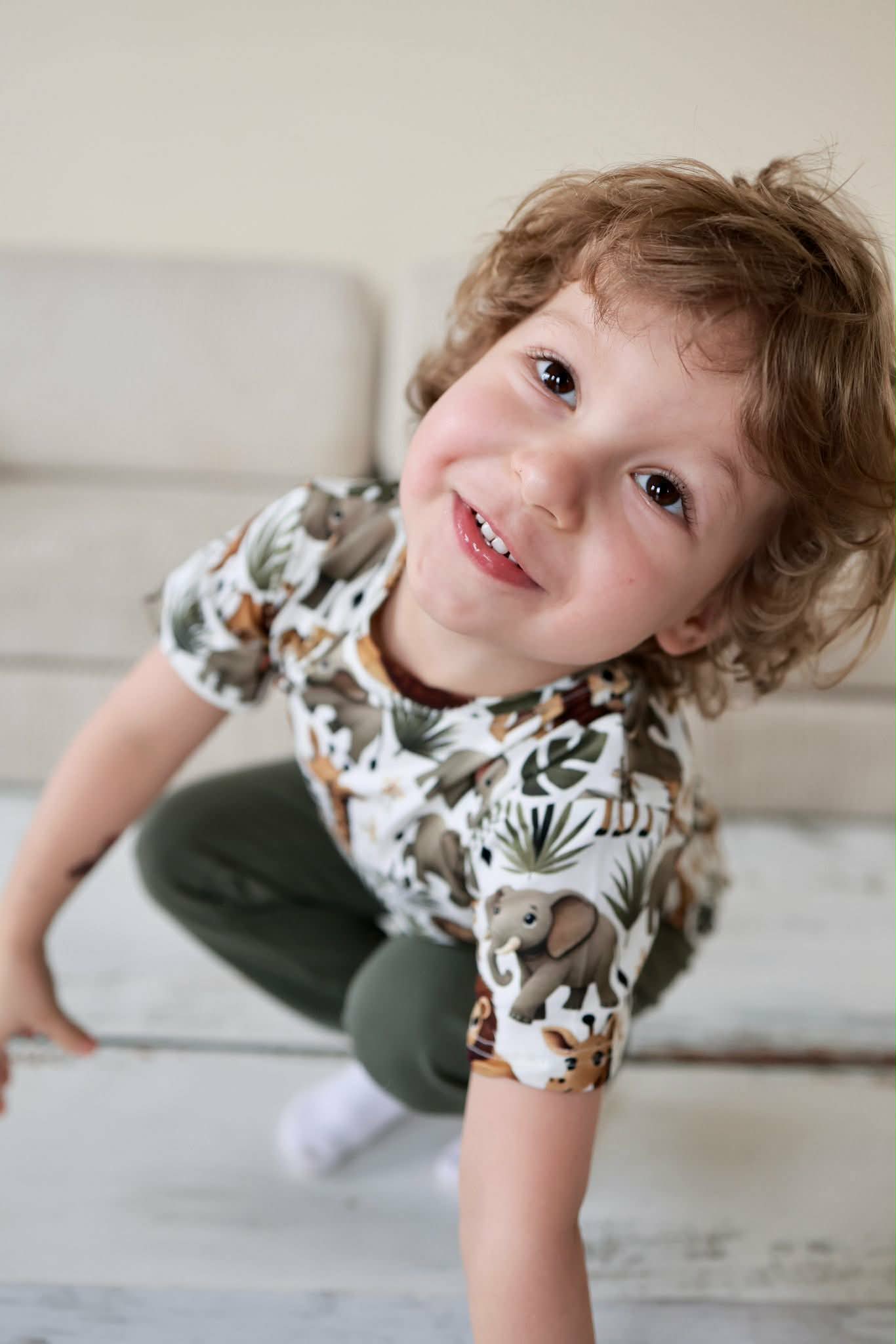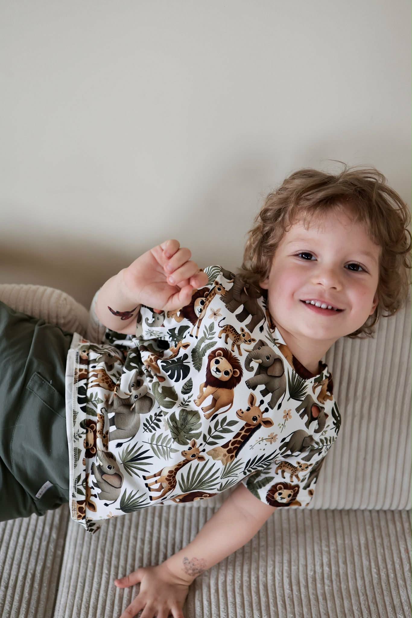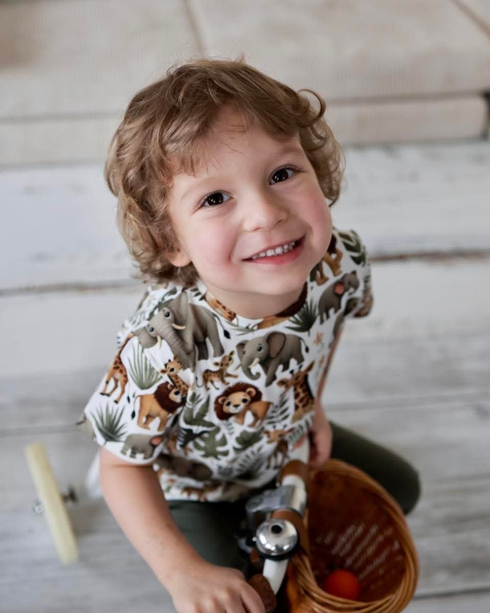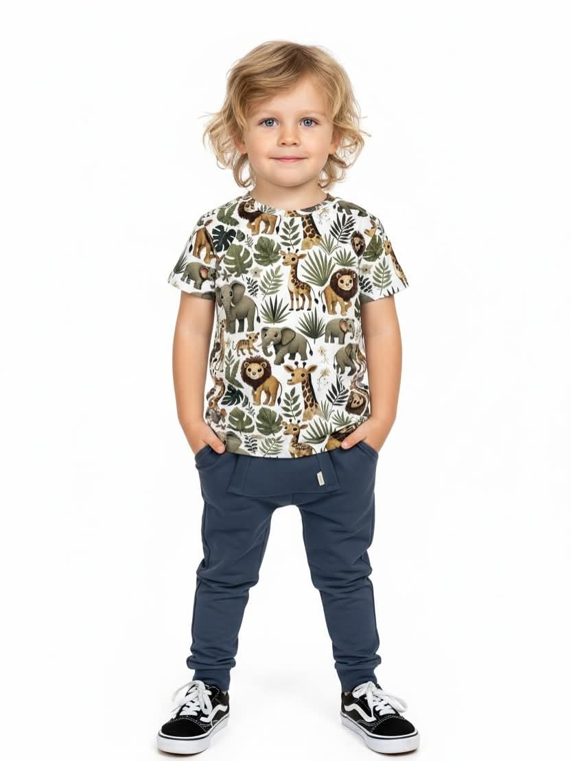 Ta urocza koszulka chłopięca w kolorze oliwkowym to idealny wybór na sezon wiosna-lato. Wykonana z miękkiej i przewiewnej tkaniny, zapewnia komfort noszenia przez cały dzień. Koszulka posiada krótkie rękawy i jest ozdobiona motywem zwierzątek, co z pewnością przypadnie do gustu każdemu małemu odkrywcy. Idealna do codziennych stylizacji, świetnie komponuje się z jeansami czy szortami. Produkt nie posiada kieszeni ani zapięć, co czyni go łatwym do zakładania i zdejmowania.