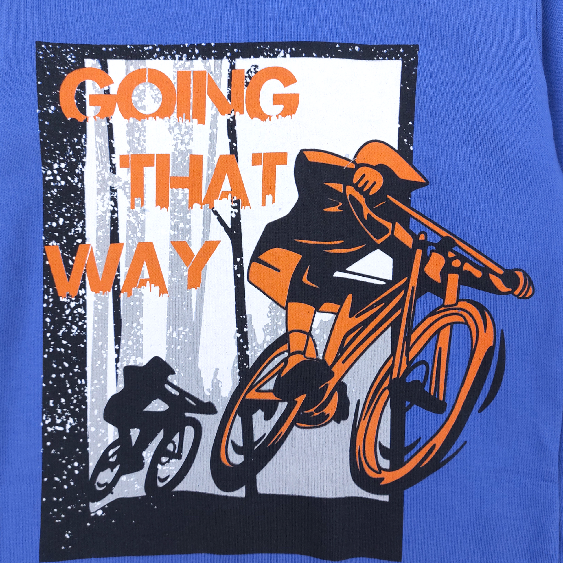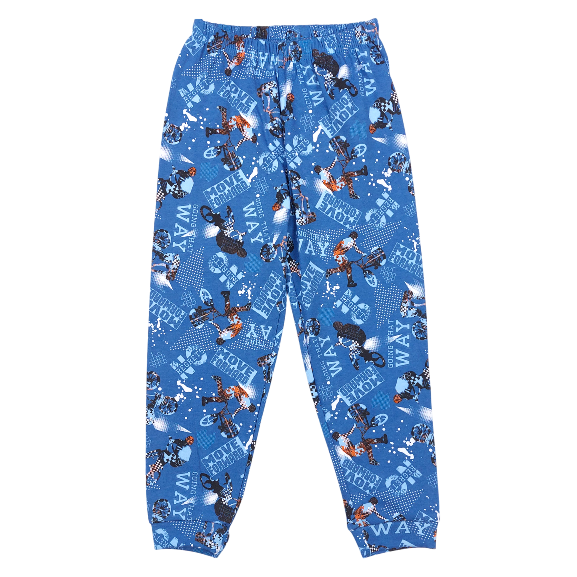 Chłopięca piżama z motywem rowerowym, stworzona z miękkiej, oddychającej bawełny. Bluzka z długim rękawem ozdobiona nadrukiem dynamicznej sceny jazdy na rowerze oraz napisem "Going That Way". Spodnie na gumce w pasie, pokryte kolorowymi grafikami rowerowymi, idealnie uzupełniają całość zestawu. Brak kieszeni i zapięć gwarantuje maksymalny komfort noszenia i bezpieczeństwo. Odpowiednia na sezon jesienno-zimowy.