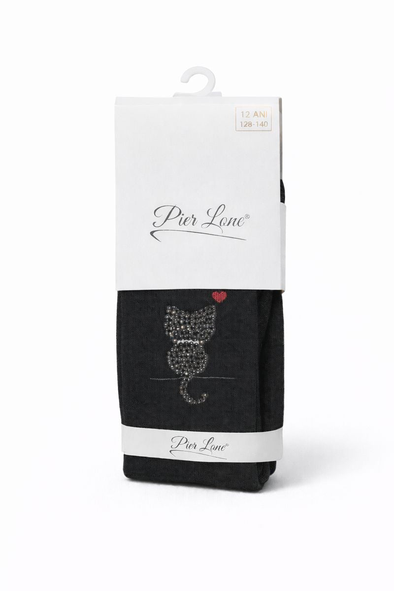 Dziewczęce rajstopy z cyrkoniami i motywem kotka w kolorze czarnym
