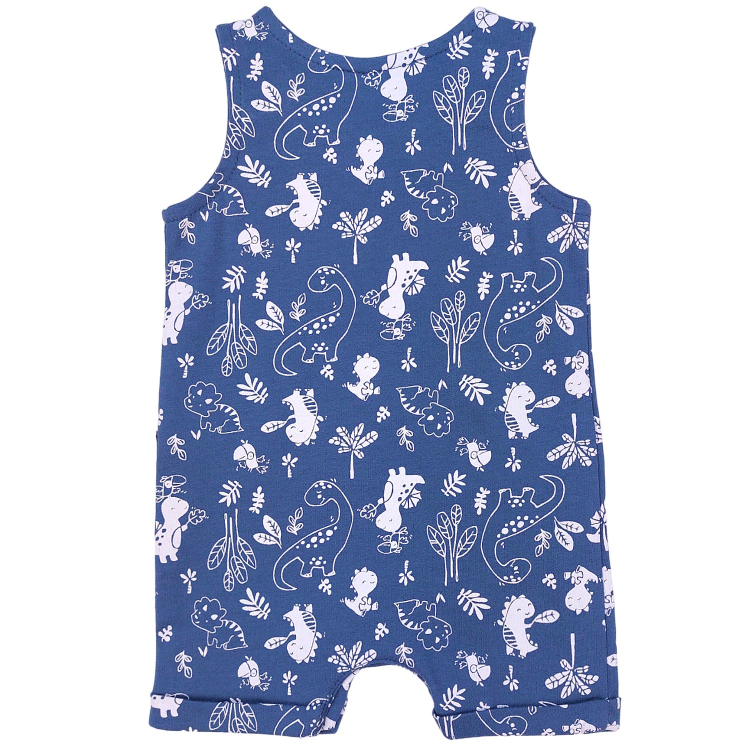 Rampers w kolorze niebieskim ozdobiony jest delikatnymi, białymi wzorami dinozaurów i roślin. Ten wyjątkowy wzór jest nie tylko modny, ale także dodaje ubranku dziecięcego uroku. Dinozaury to ulubiony motyw wielu maluchów, co czyni ten rampers idealnym wyborem na codzienne stylizacje.