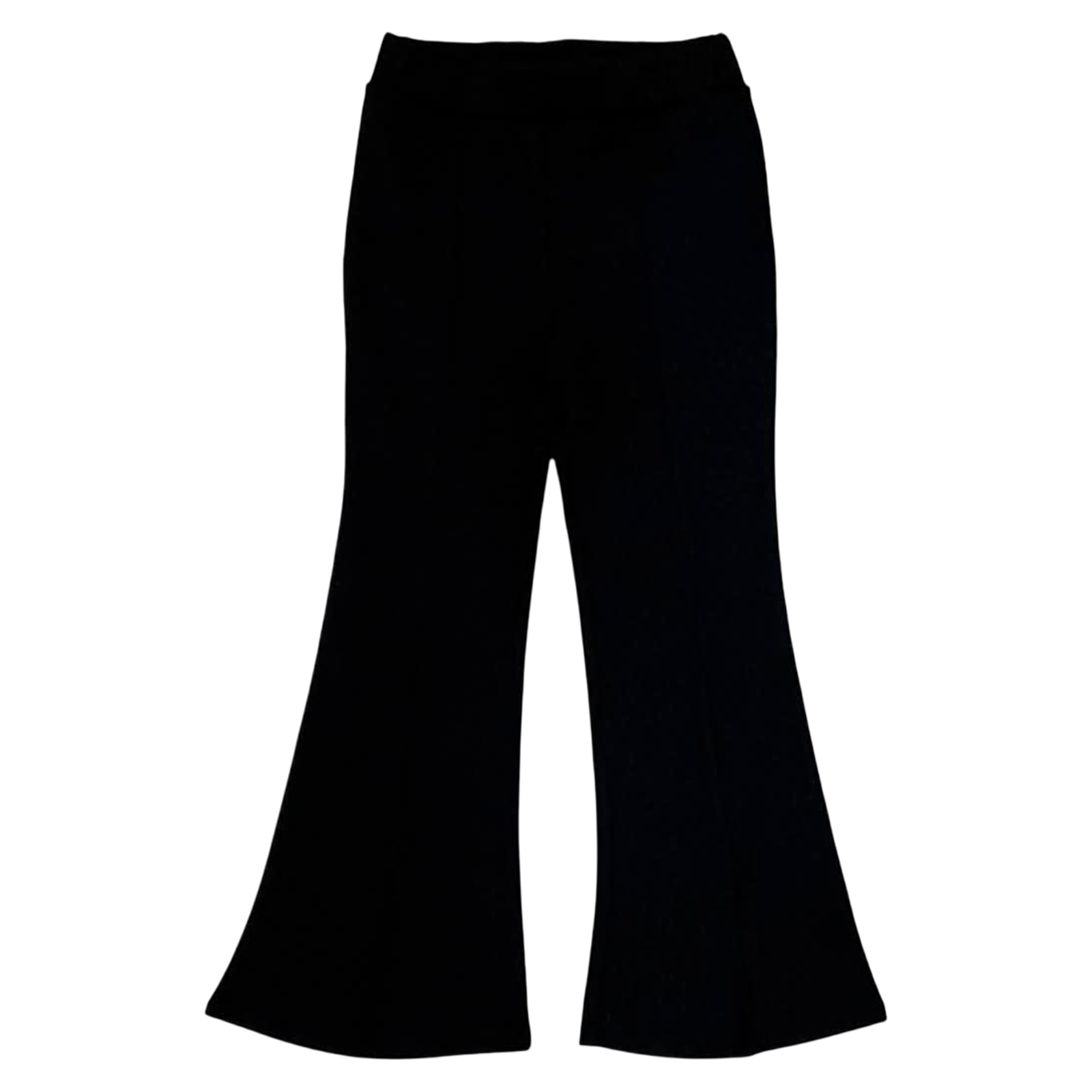 Eleganckie spodnie dziewczęce o kroju dzwonów w klasycznym czarnym kolorze. Doskonałe na sezon wiosna-lato. Wykonane z miękkiej i elastycznej tkaniny, zapewniają pełny komfort noszenia. Posiadają elastyczną talię, co sprawia, że świetnie dopasowują się do sylwetki, oraz kieszenie boczne dla dodatkowej funkcjonalności. Idealne zarówno na specjalne okazje, jak i na codzienne wyjścia.