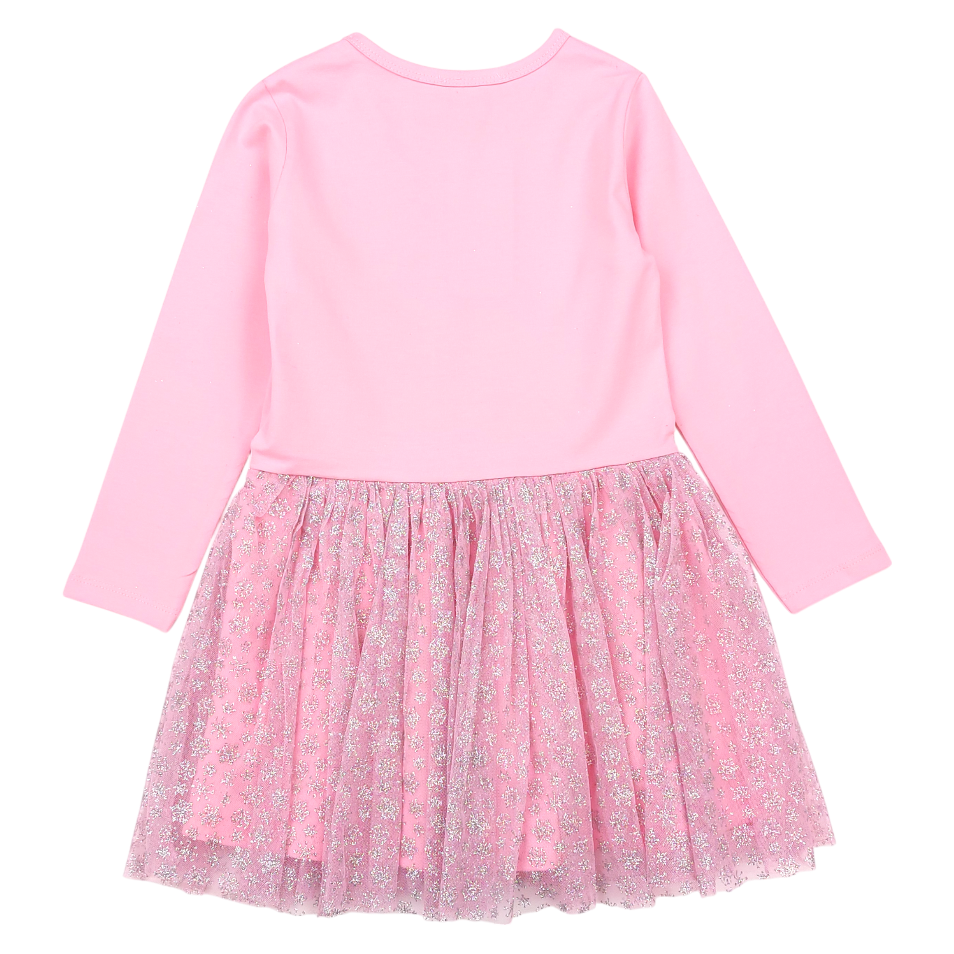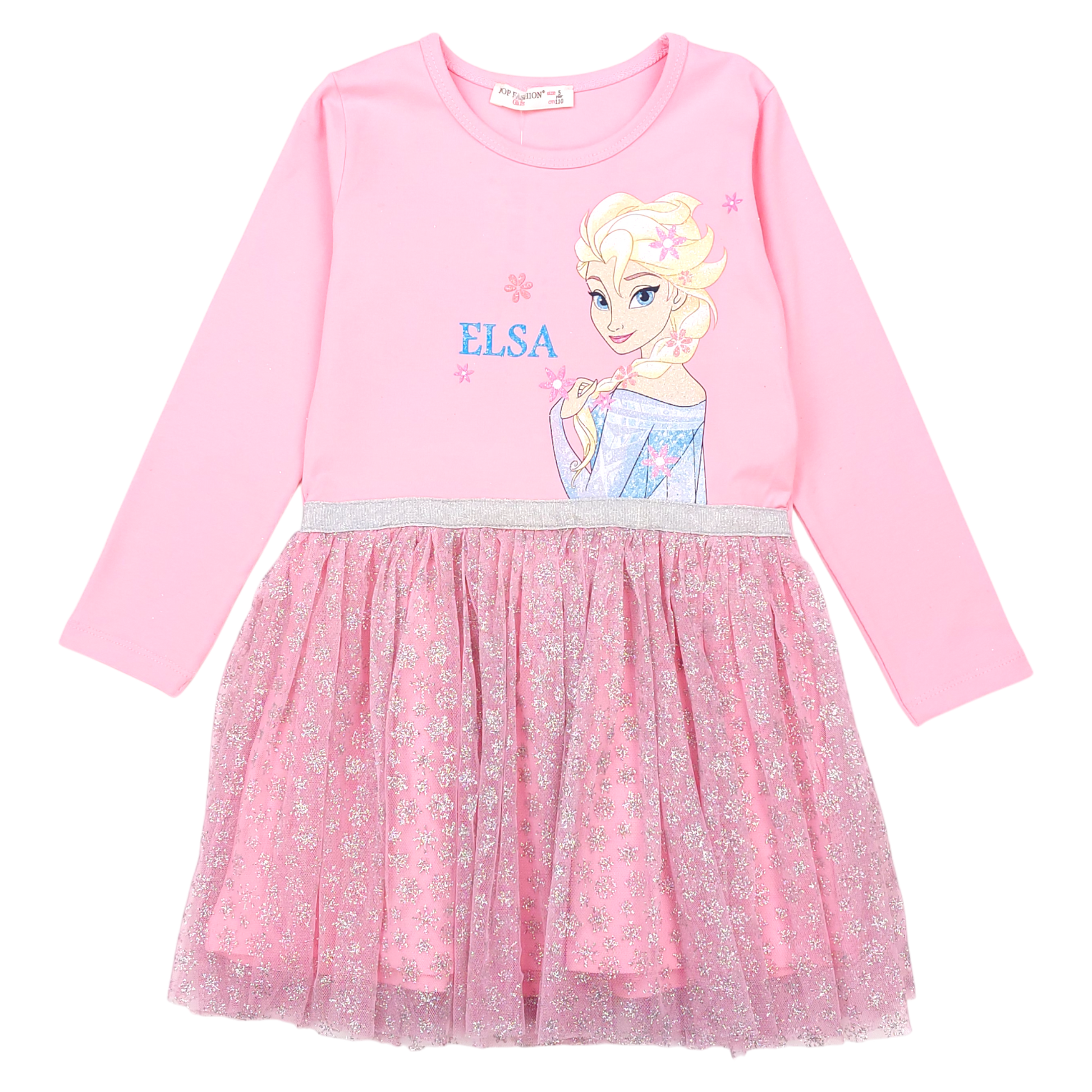 Urocza różowa sukienka dziewczęca z brokatowym wykończeniem, doskonała na specjalne okazje w sezonie jesień-zima. Ozdobiona motywem z postacią Elsy, który zachwyci każdą małą miłośniczkę bajek. Górna część wykonana z elastycznego materiału zapewnia wygodę, a dolna warstwa tiulowa z brokatowym wzorem dodaje sukience elegancji.