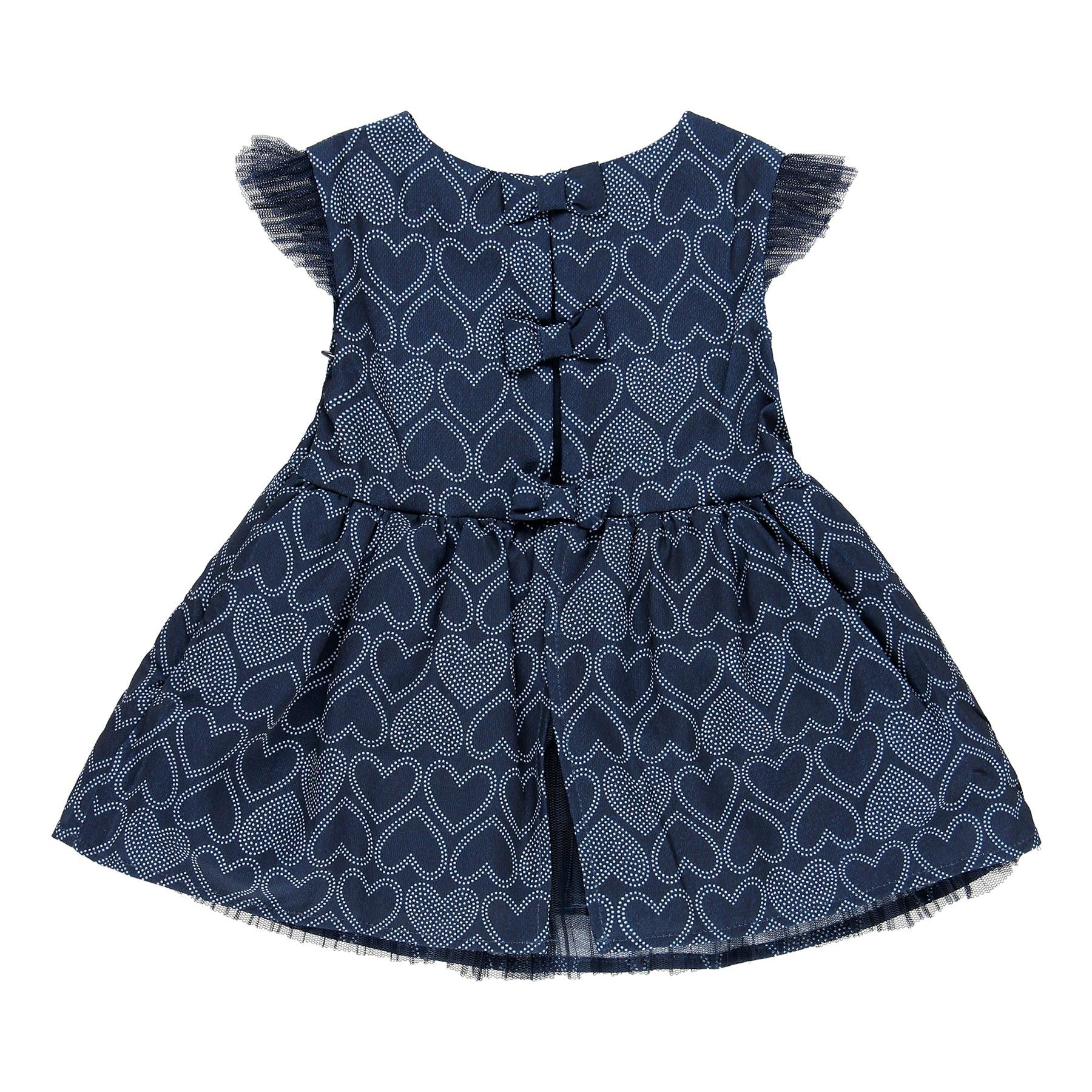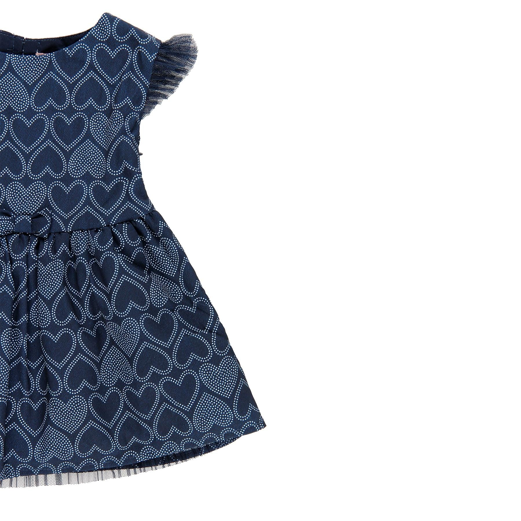 Sukienka elegancka dla dziewczynki dla dzieci z krótkim rękawem ozdobnym tiulem i nadrukiem w serduszka dziewczynka Boboli z kolekcji wiosna lato kod produktu 709129 kolor granatowy. Odzież dziecięca.