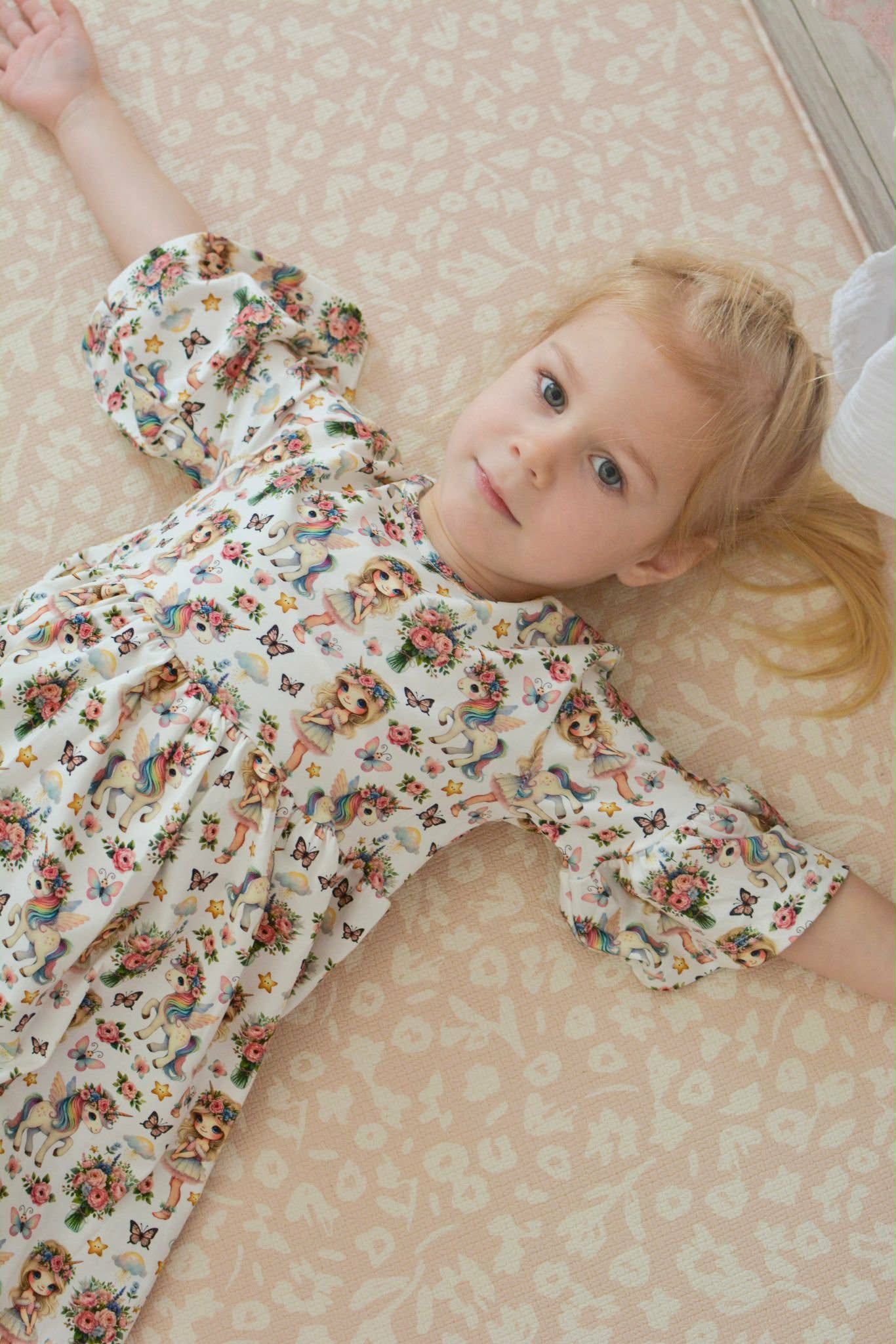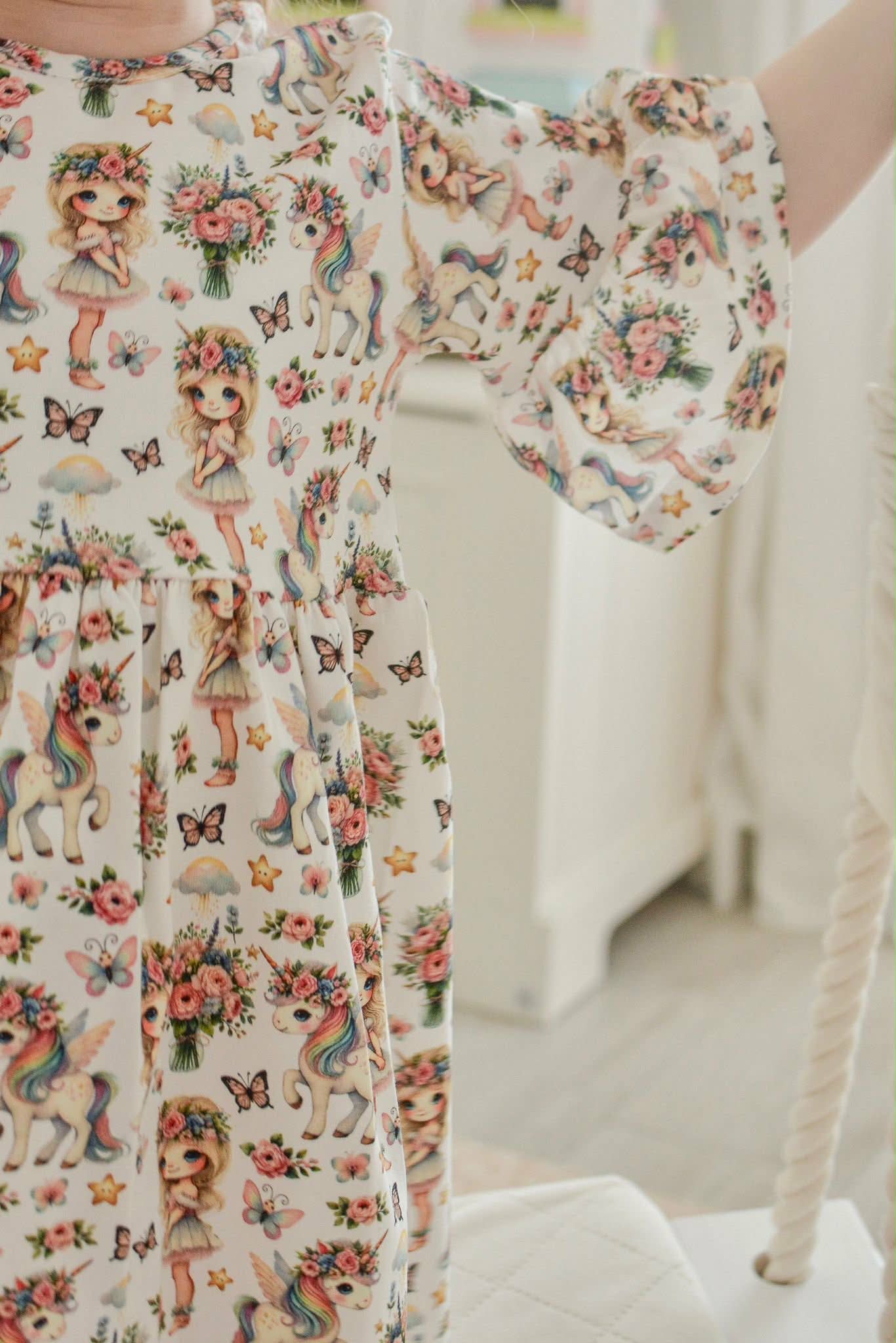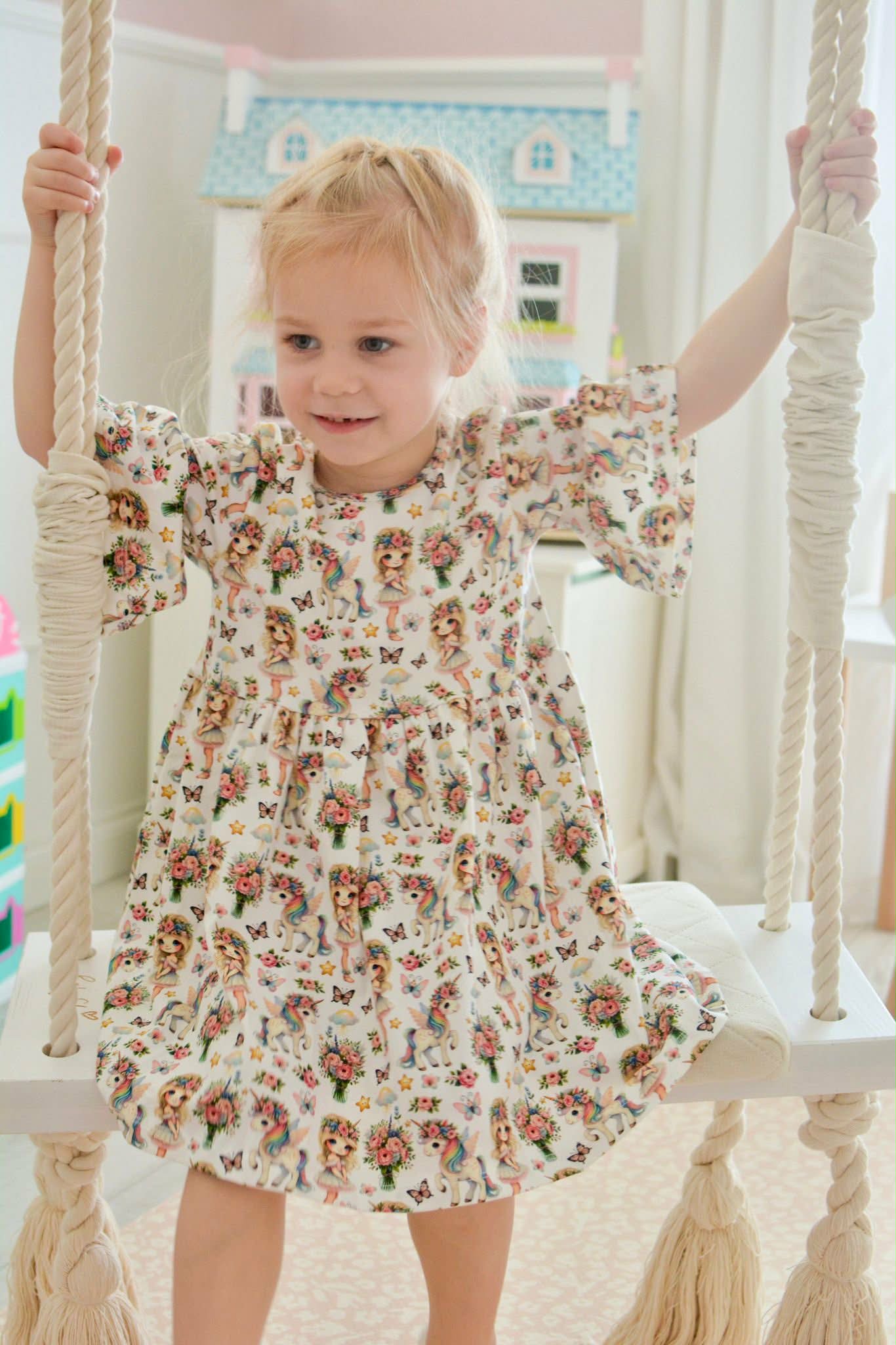Dziewczęca sukienka z motywem jednorożca w kolorze brudnego różu