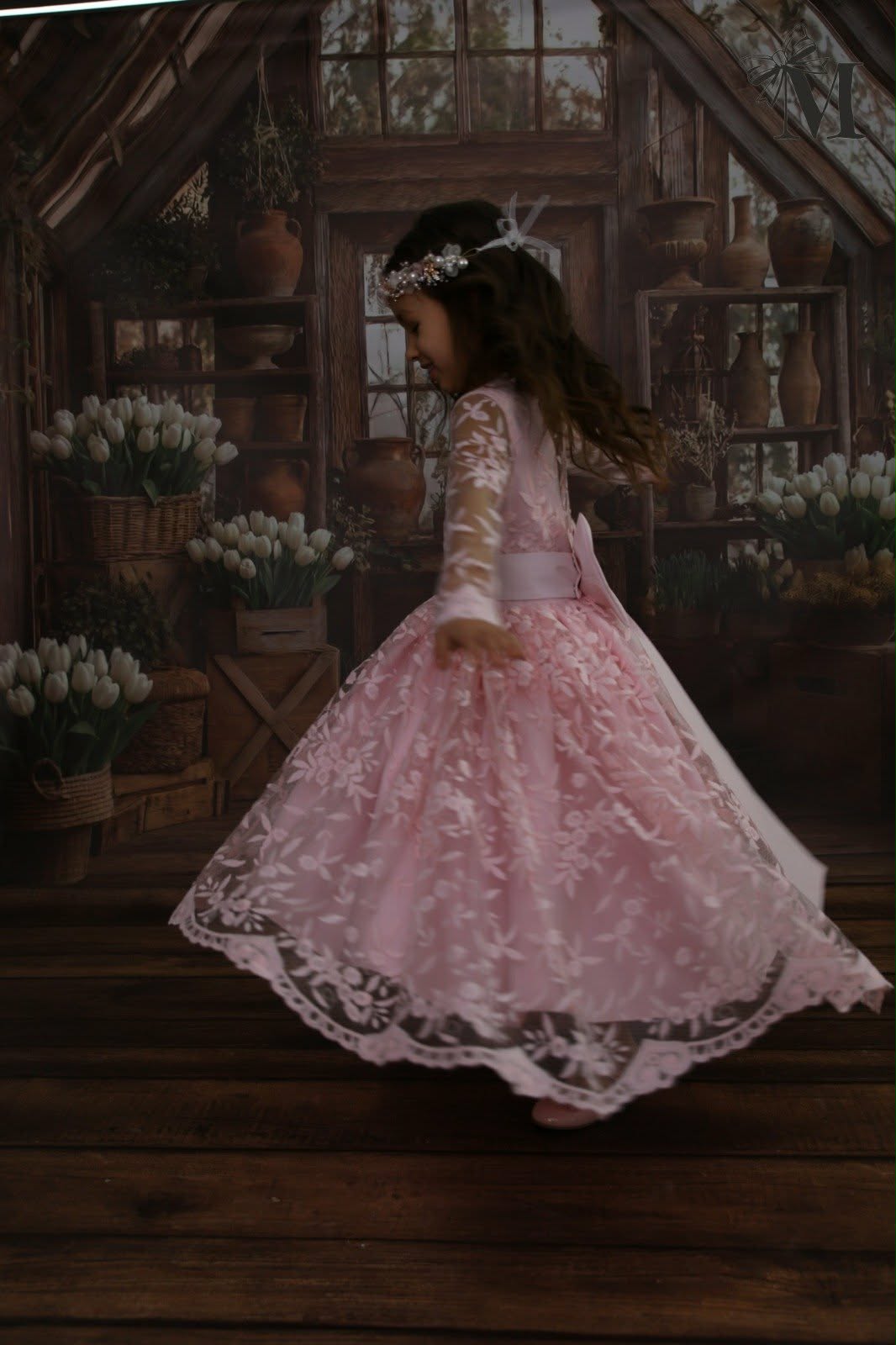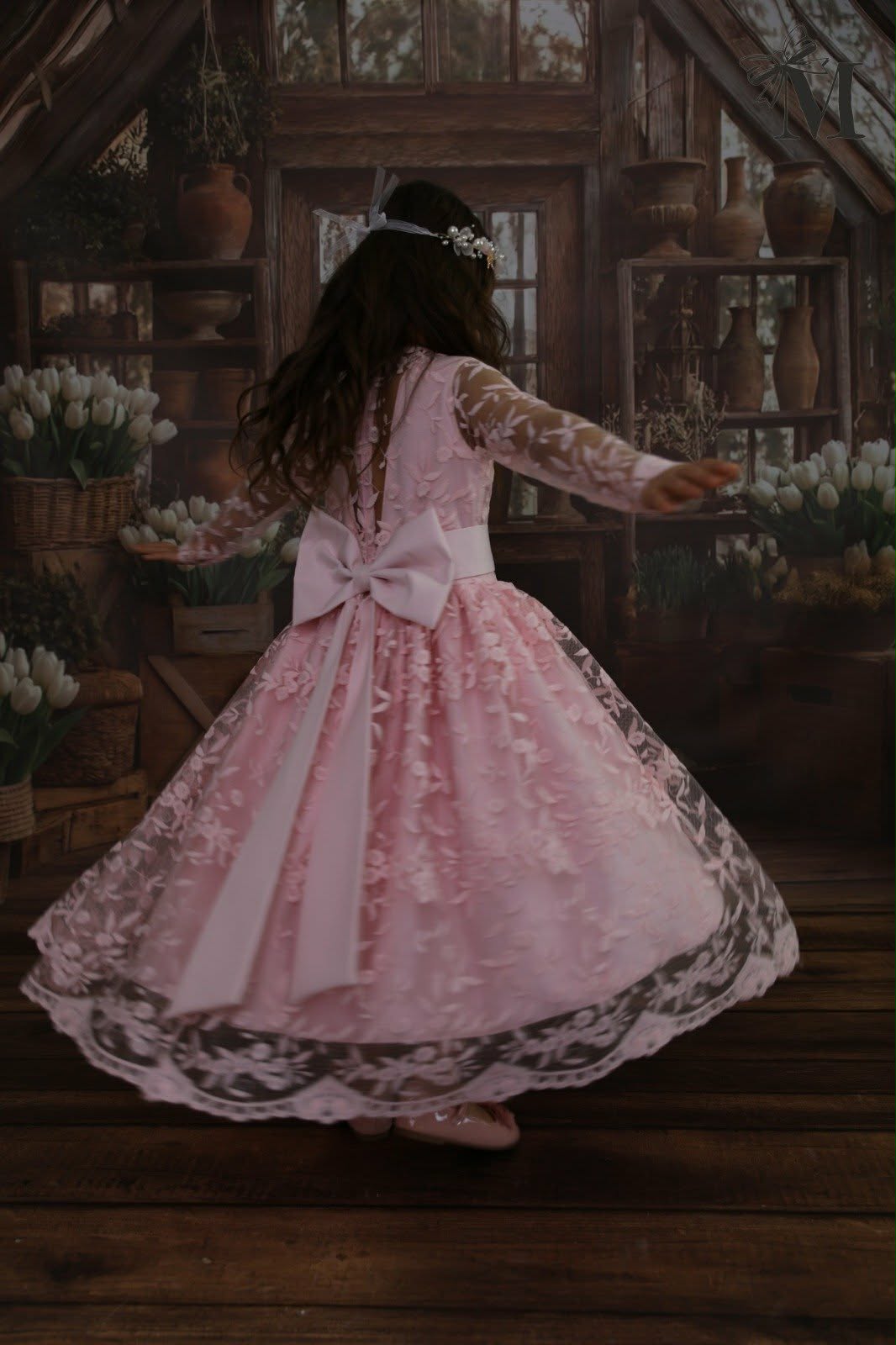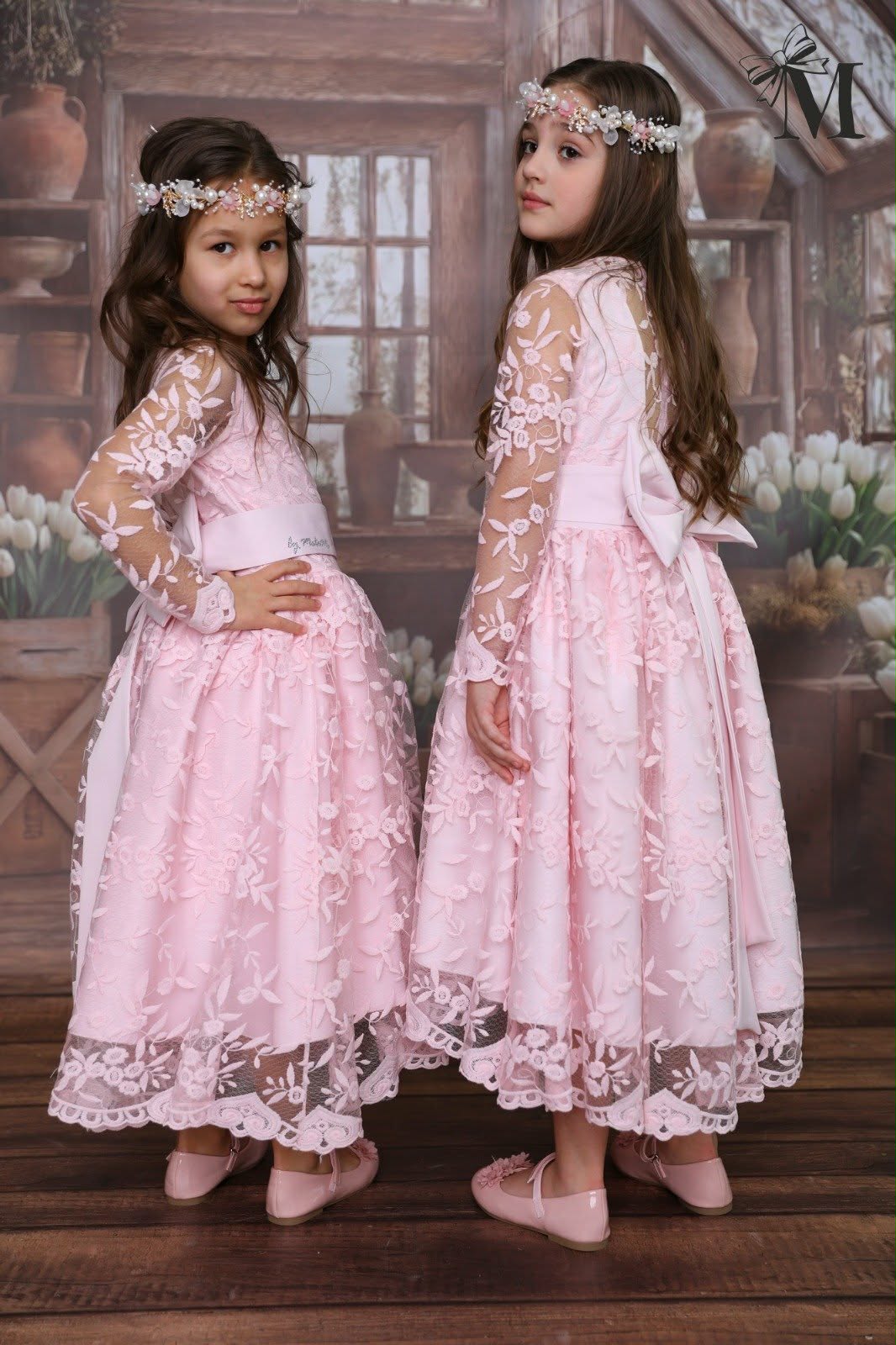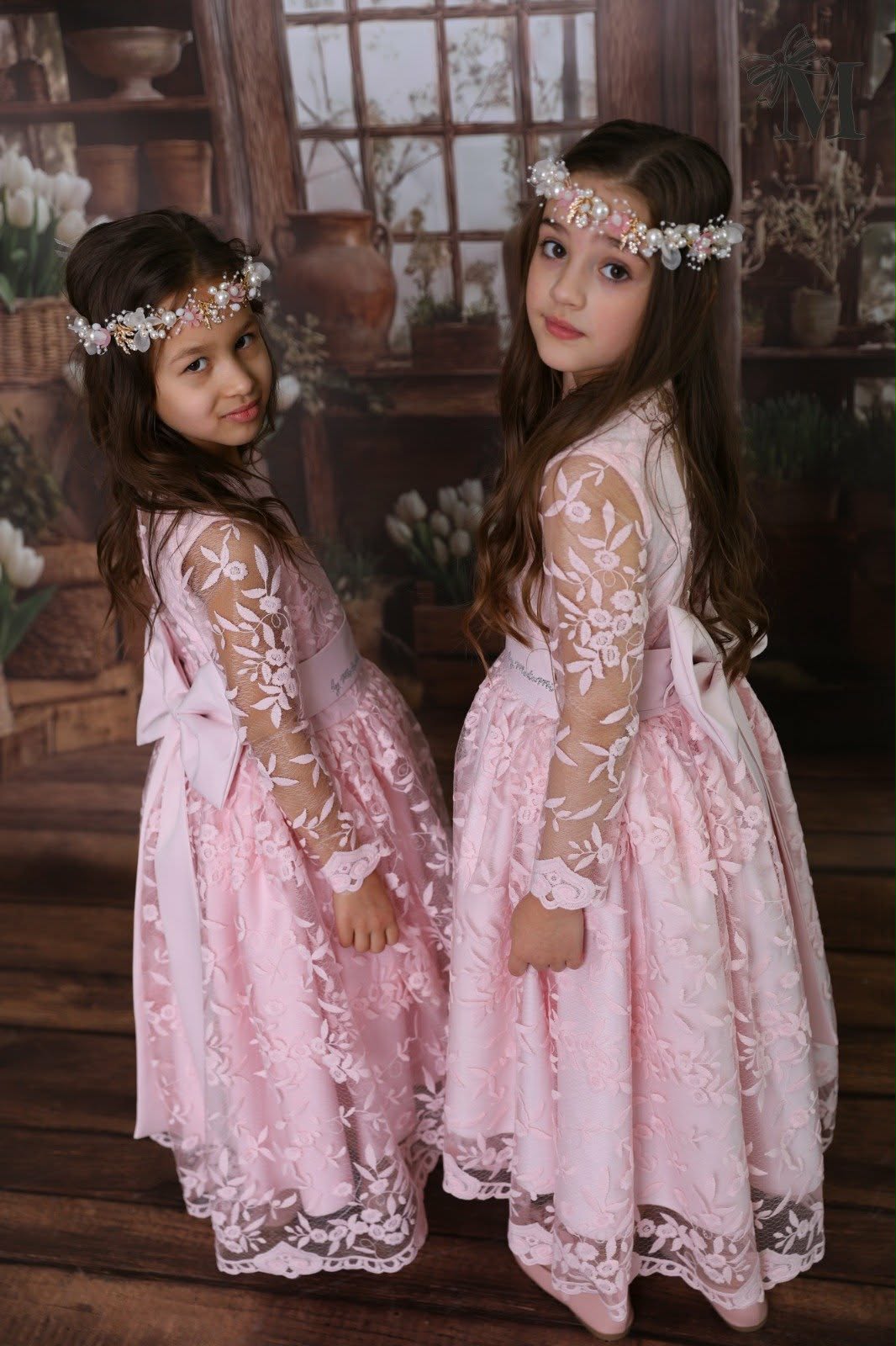 Dziewczęca sukienka koronkowa z kokardą w kolorze różowym