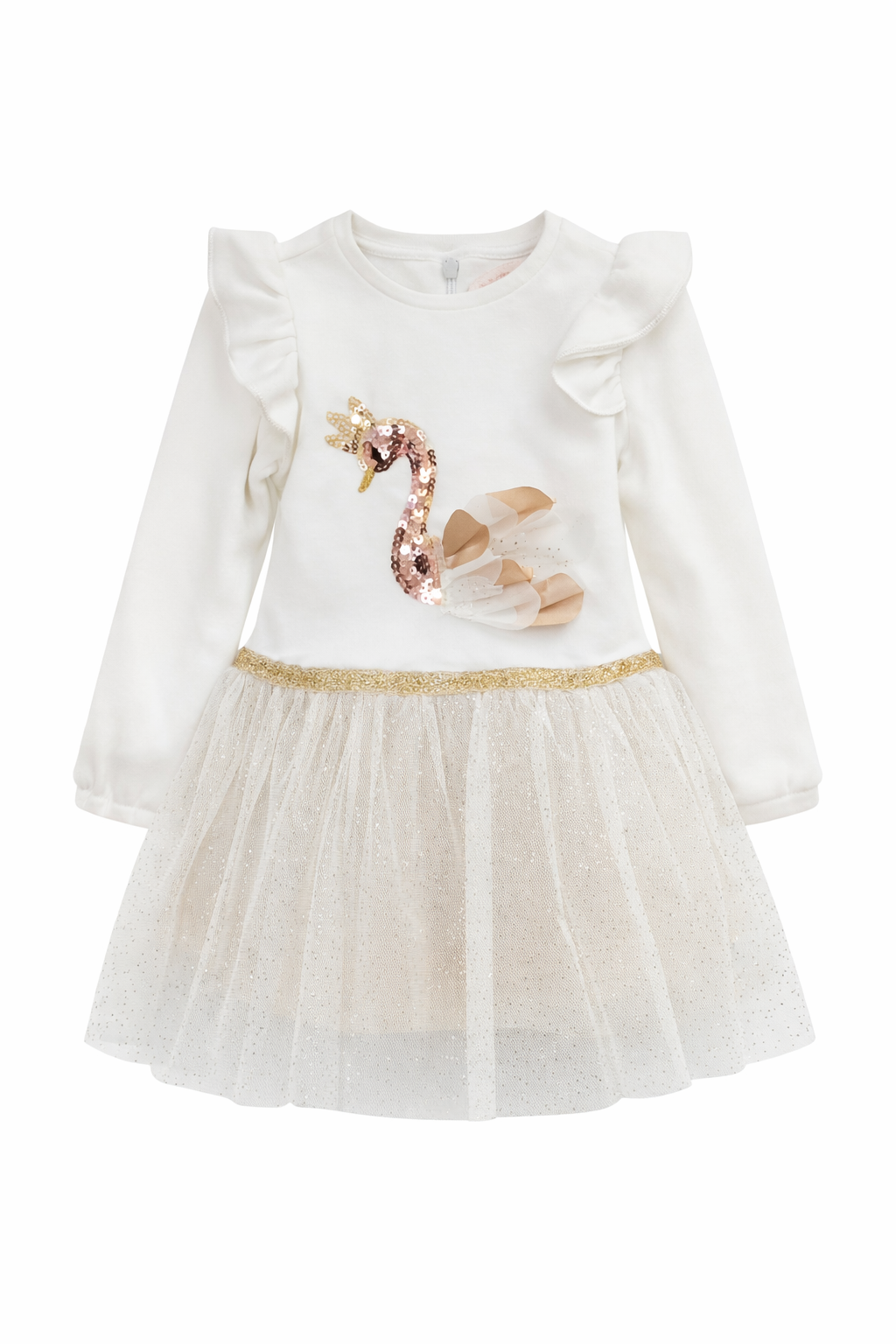 Kremowa sukienka welurowa z motywem łabędzia dla dziewczynki