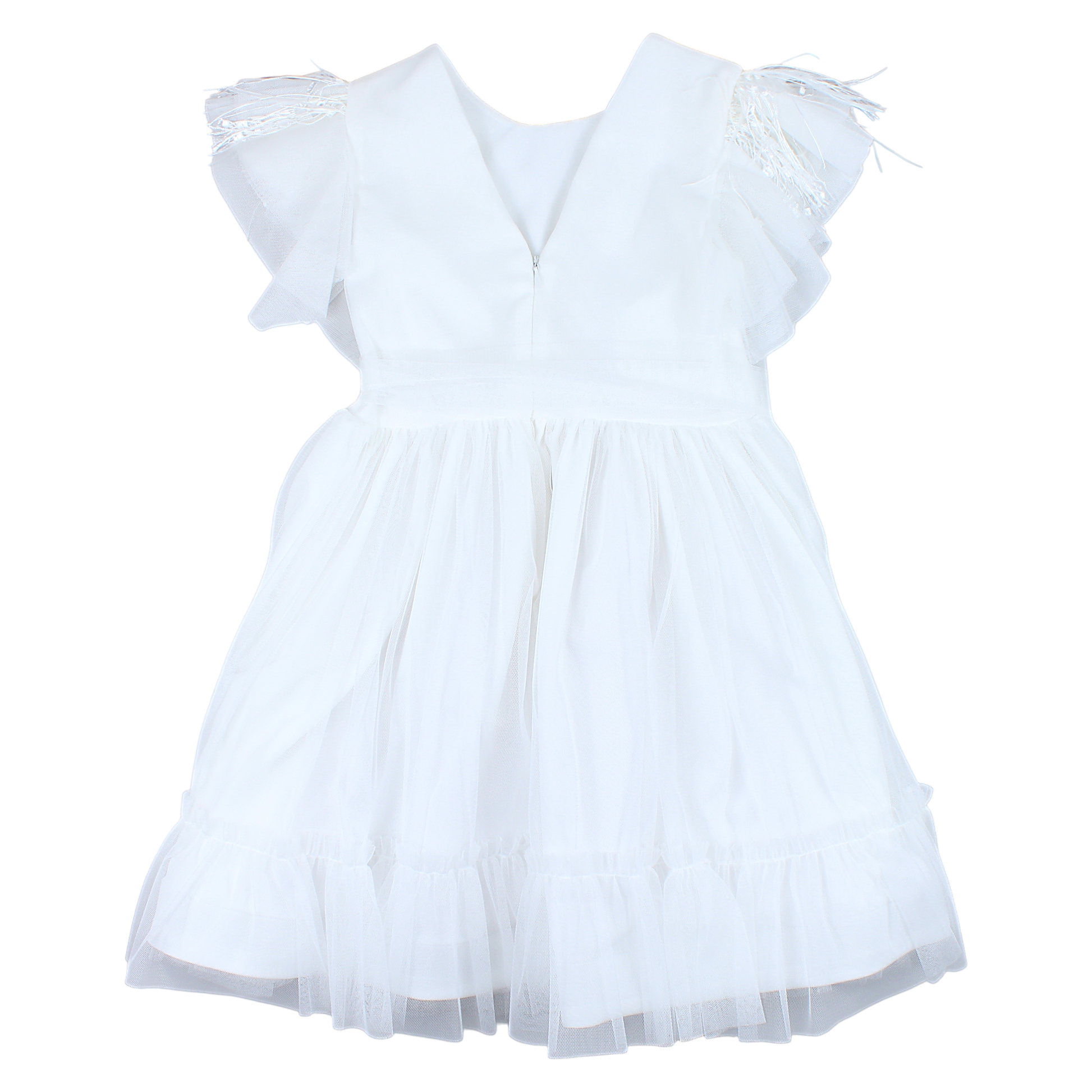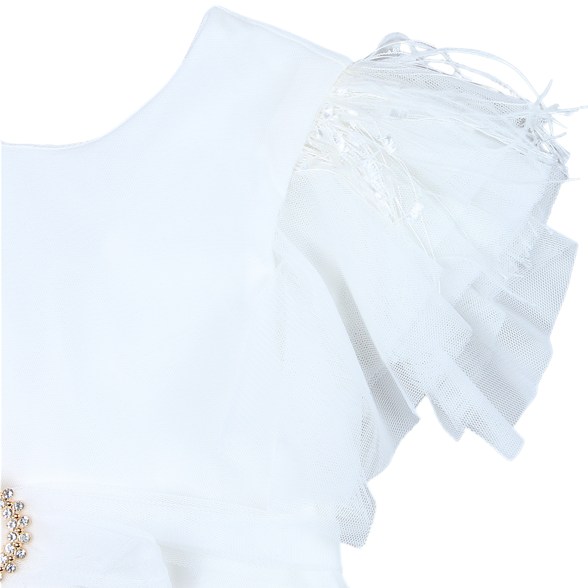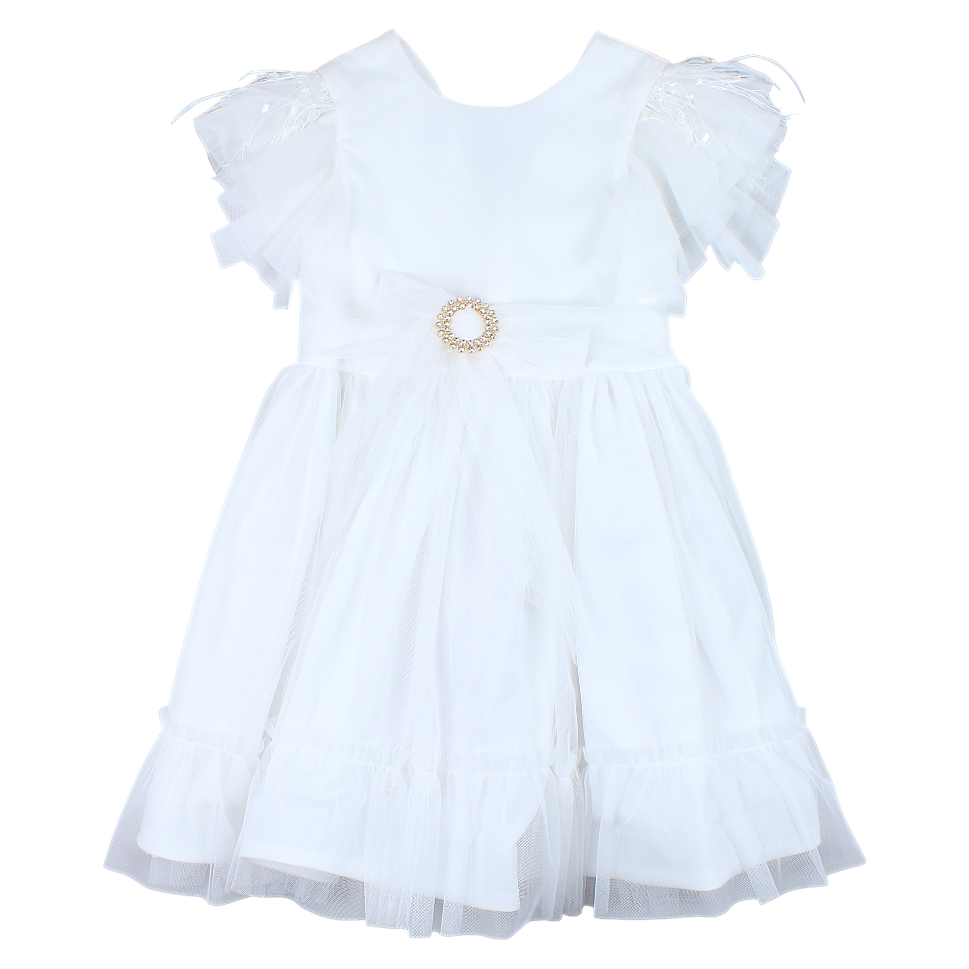 Przedstawiamy urokliwą sukienkę wizytową dla dziewczynki w kolorze kremowym. Sukienka ozdobiona jest delikatnymi piórkami na ramionach, co nadaje jej wyjątkowego charakteru. Wykonana z miękkiego materiału, zapewnia komfort noszenia. Ozdobna broszka w formie okręgu dodaje elegancji. Sukienka ma krótki rękawek i falbany na dole. Przeznaczona jest dla dzieci i doskonała na specjalne okazje.