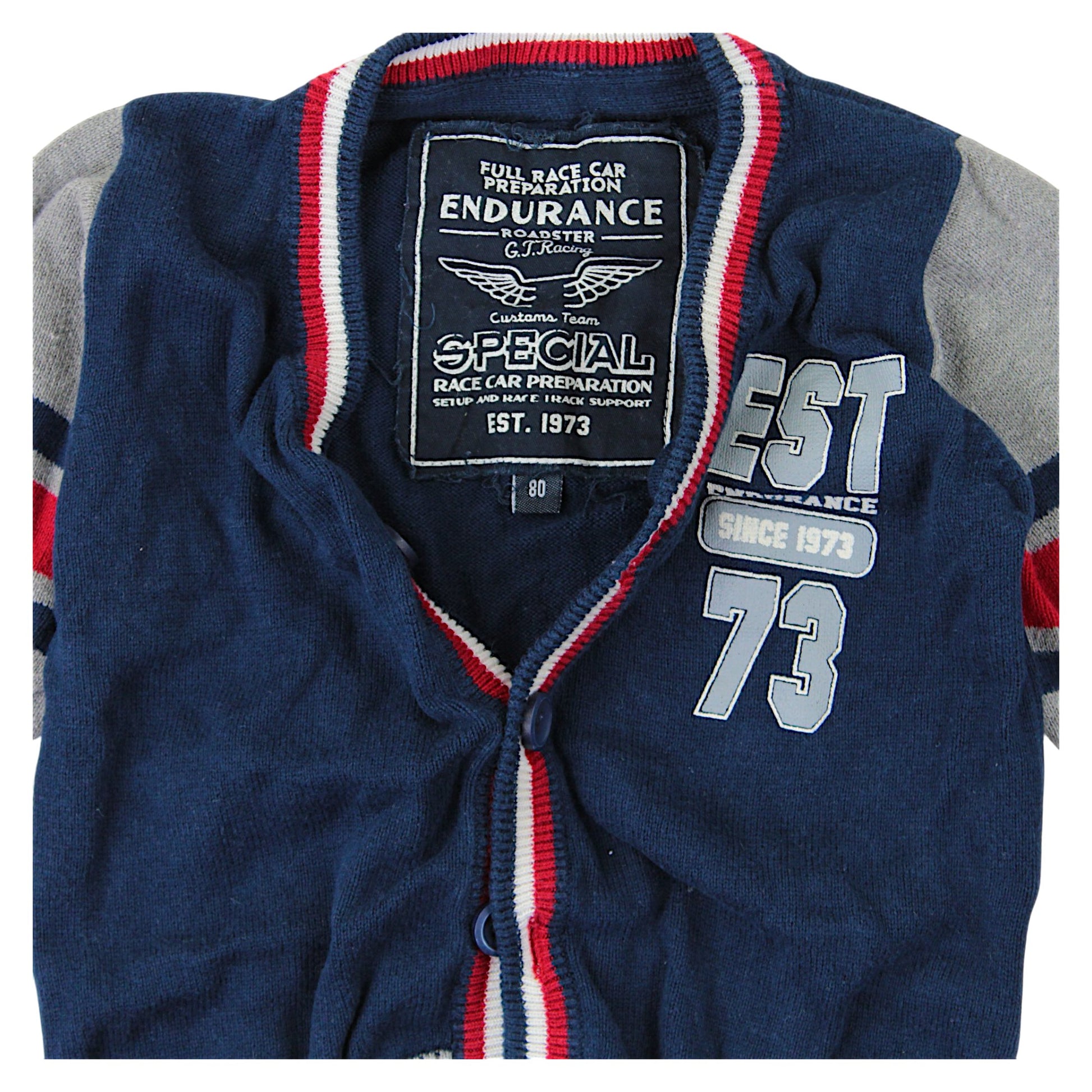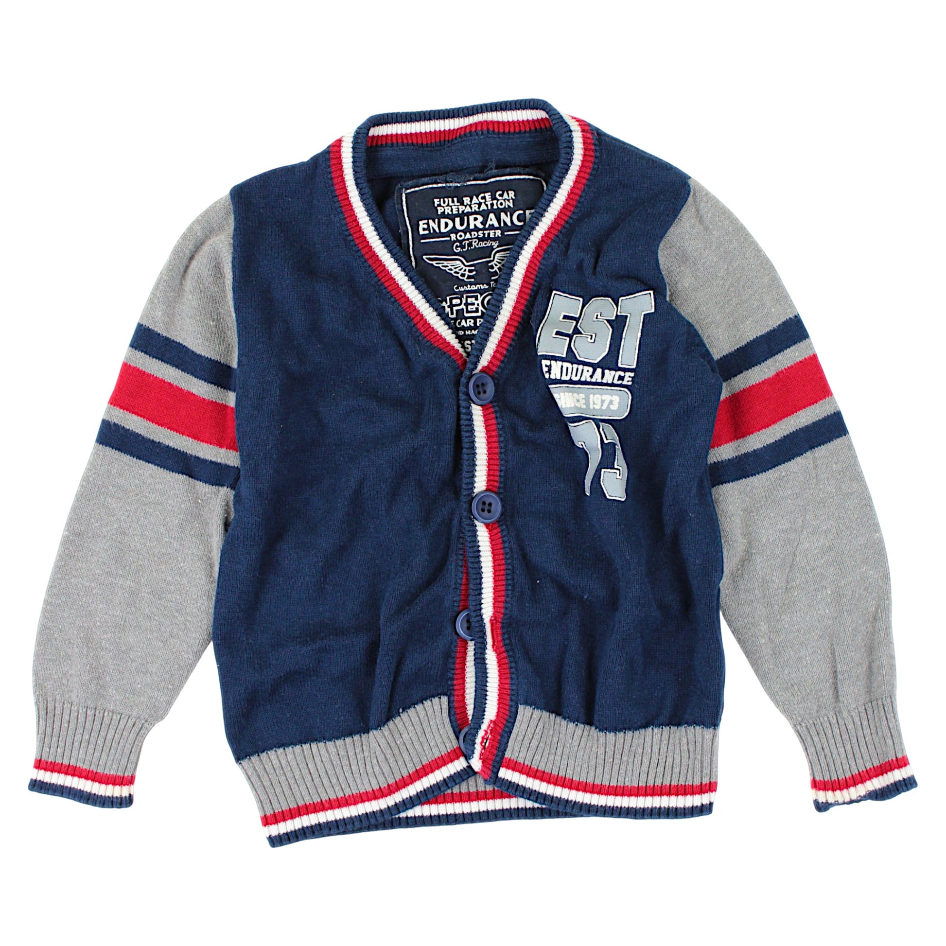 Stylish button-up sweatshirt for boys by EST. 1973 in navy blue with grey sleeves decorated with red and navy stripes. Classic cut with long sleeves and contrasting cuffs and collar give it a sporty character. Perfect for cooler days in the spring-summer season. Button -up front makes it easy to put on, and the patch with the inscription adds a fashionable accent.