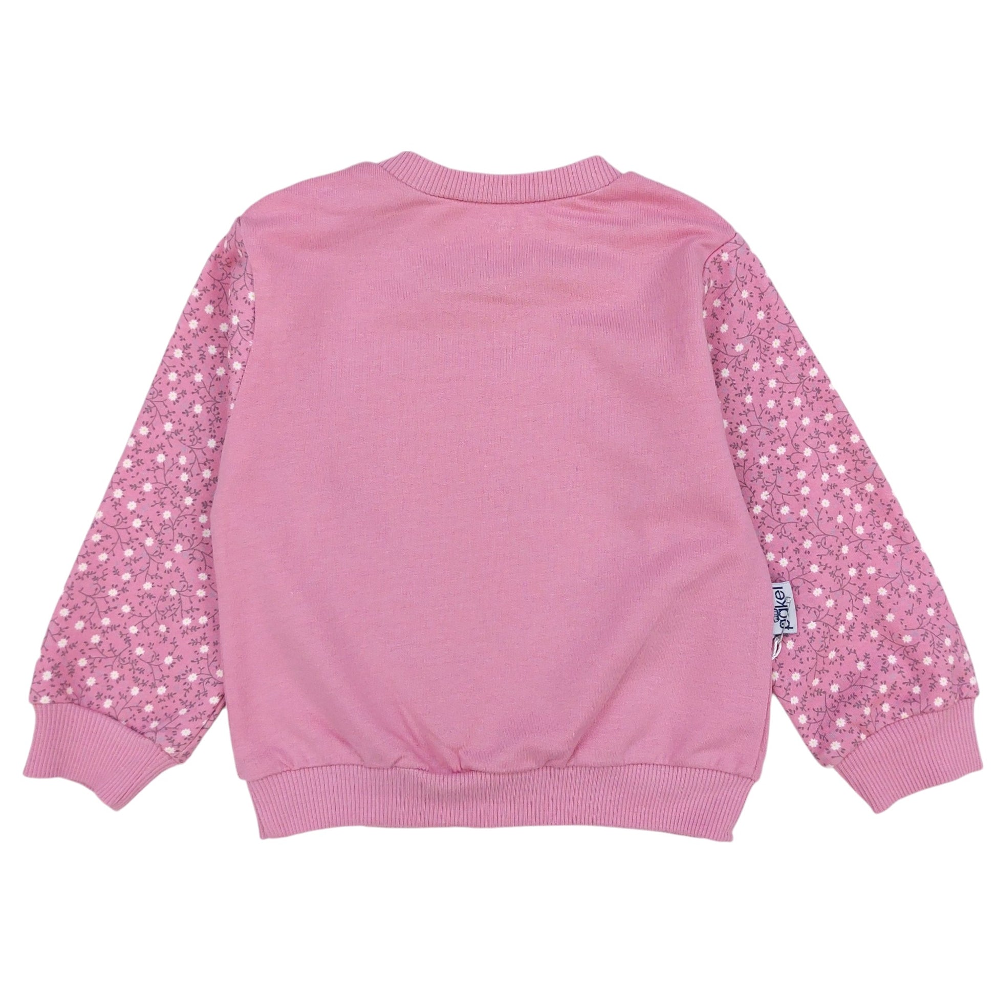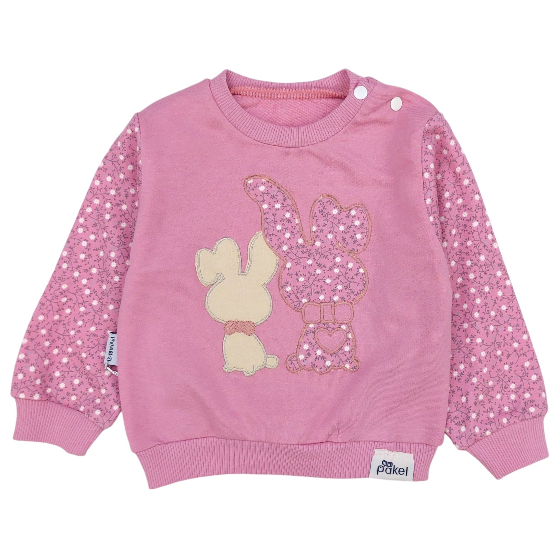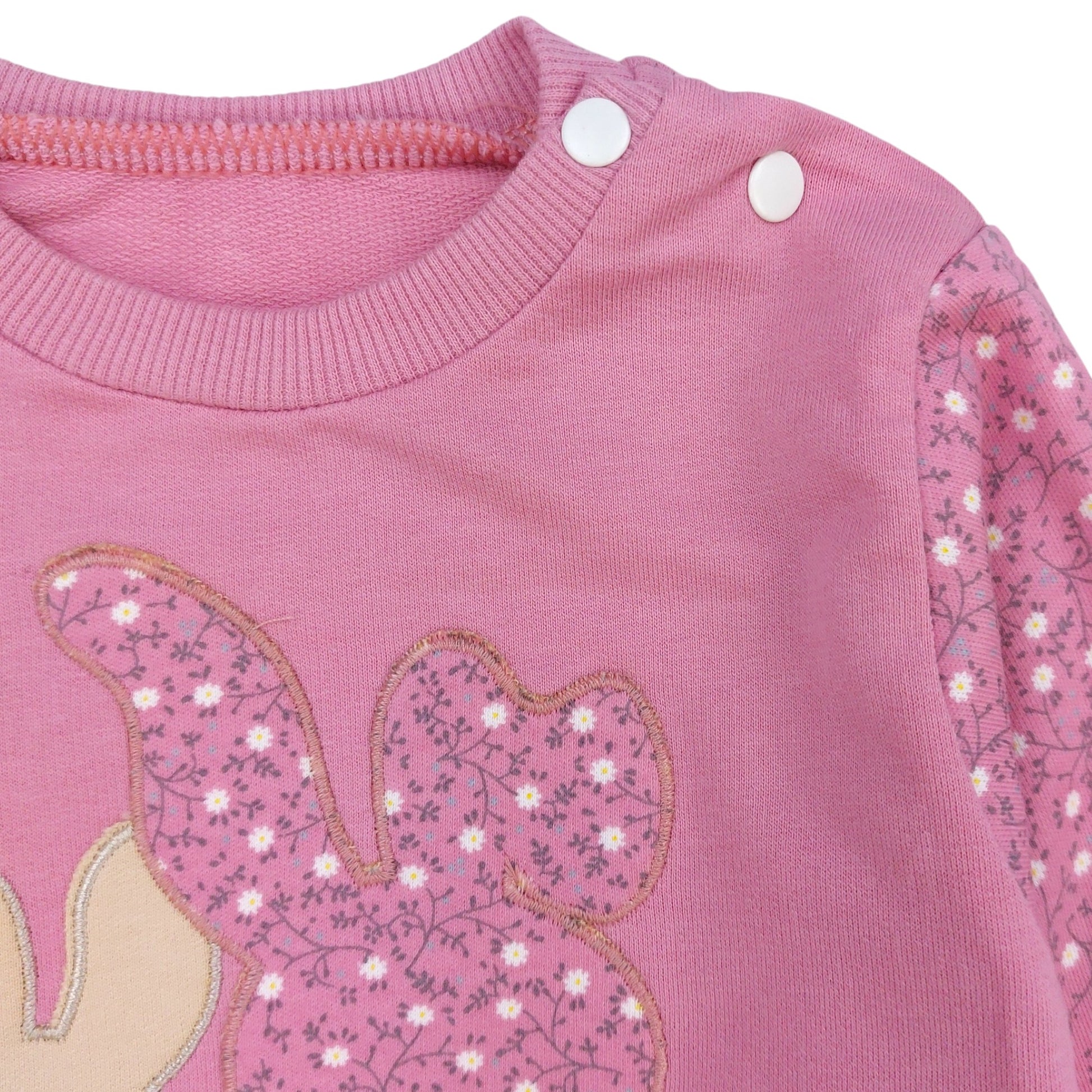 The set consists of two parts: a sweatshirt and trousers. The sweatshirt has a beautiful heather colour and is decorated with embroidery with a rabbit motif, which gives it a unique character. The sleeves attract attention with a subtle pattern of small flowers, which adds delicacy and girlish charm. The sweatshirt has a convenient snap fastening on the shoulder, thanks to which dressing the child is quick and easy.