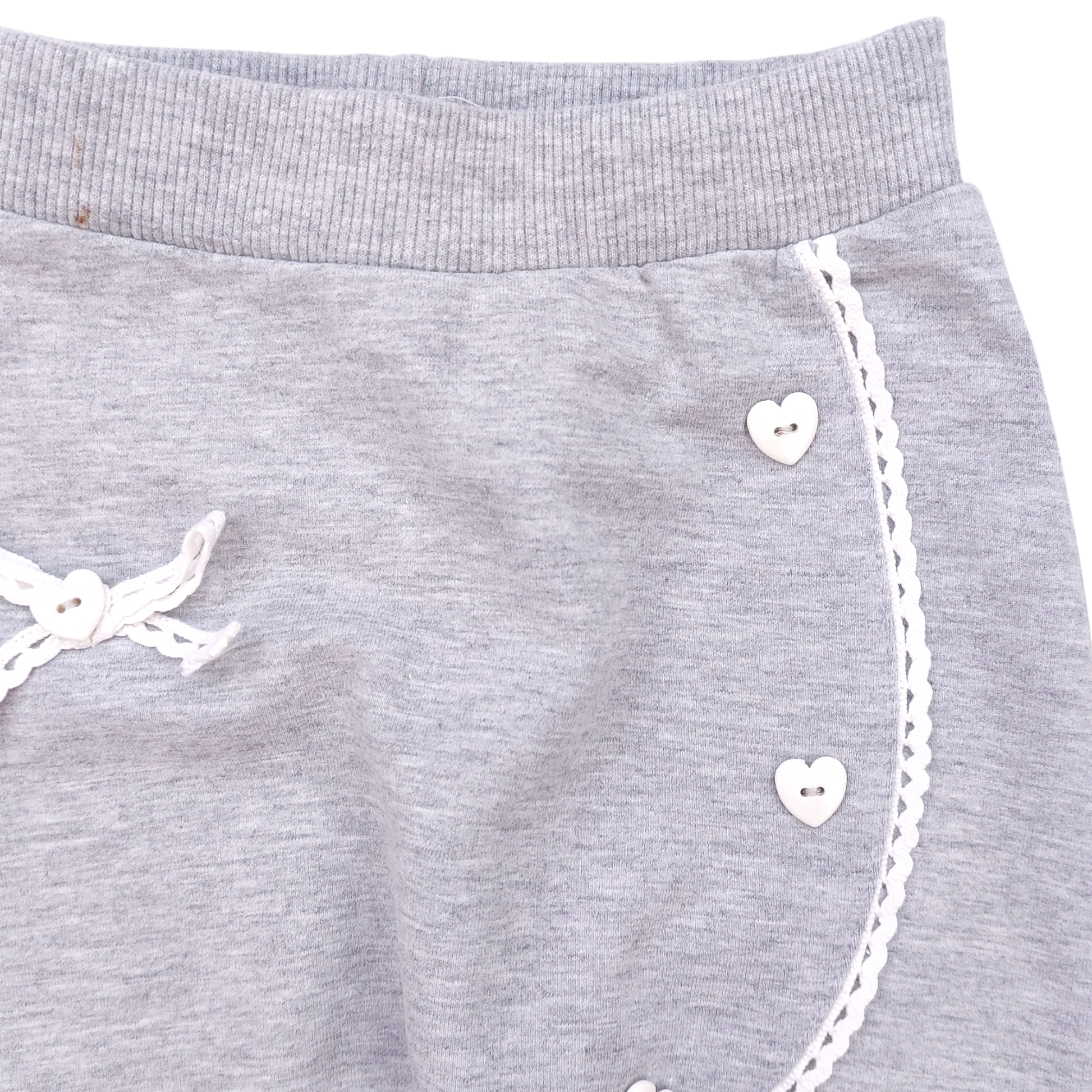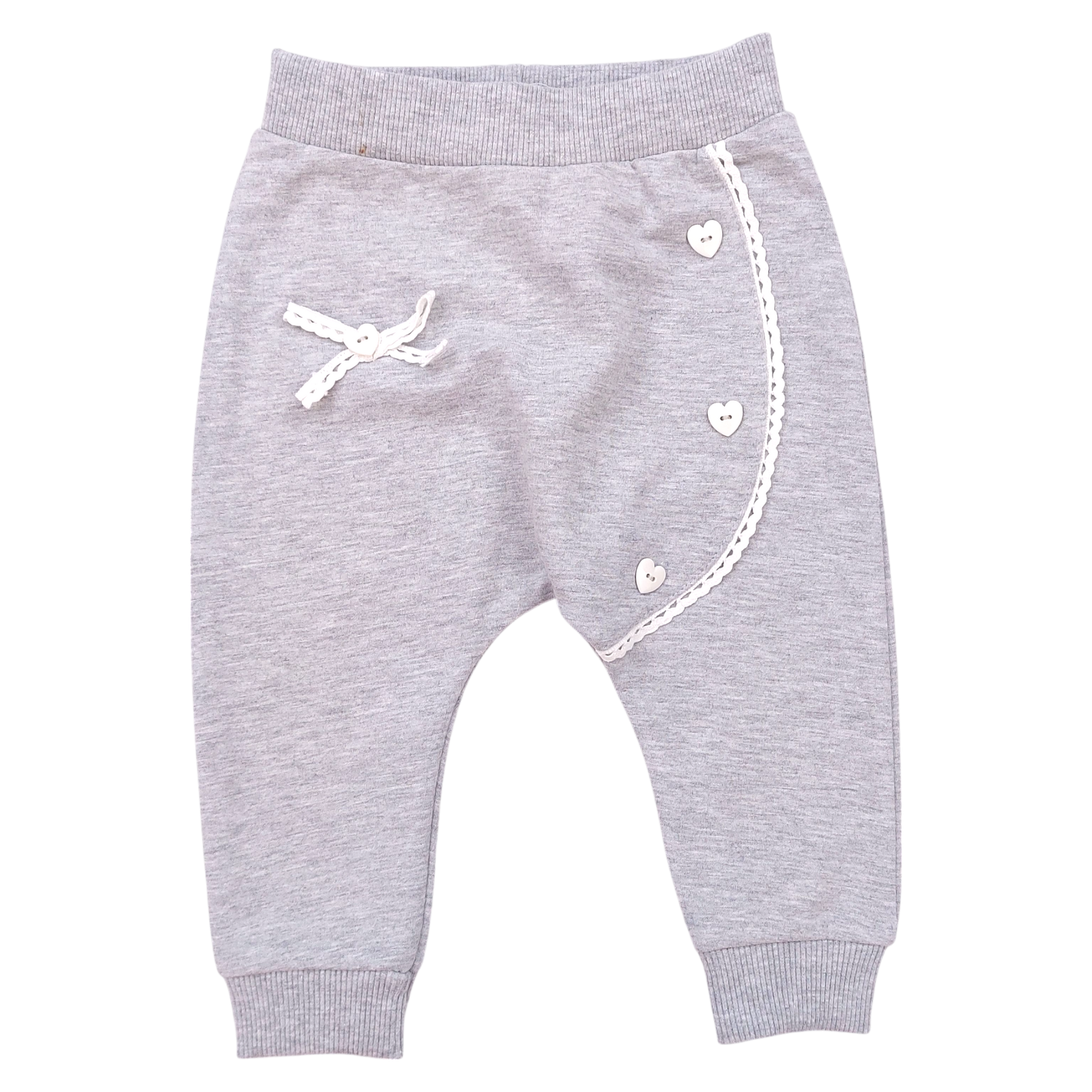 Pants in a shade of grey, with an elastic waistband and cuffs on the legs, provide freedom of movement during play. Delicate decorative lace inserts and heart-shaped buttons give them a unique character. Thanks to the solid workmanship and pleasant to the touch material, the pants are perfect for everyday styling, and their universal design allows for easy matching with other elements of the wardrobe.