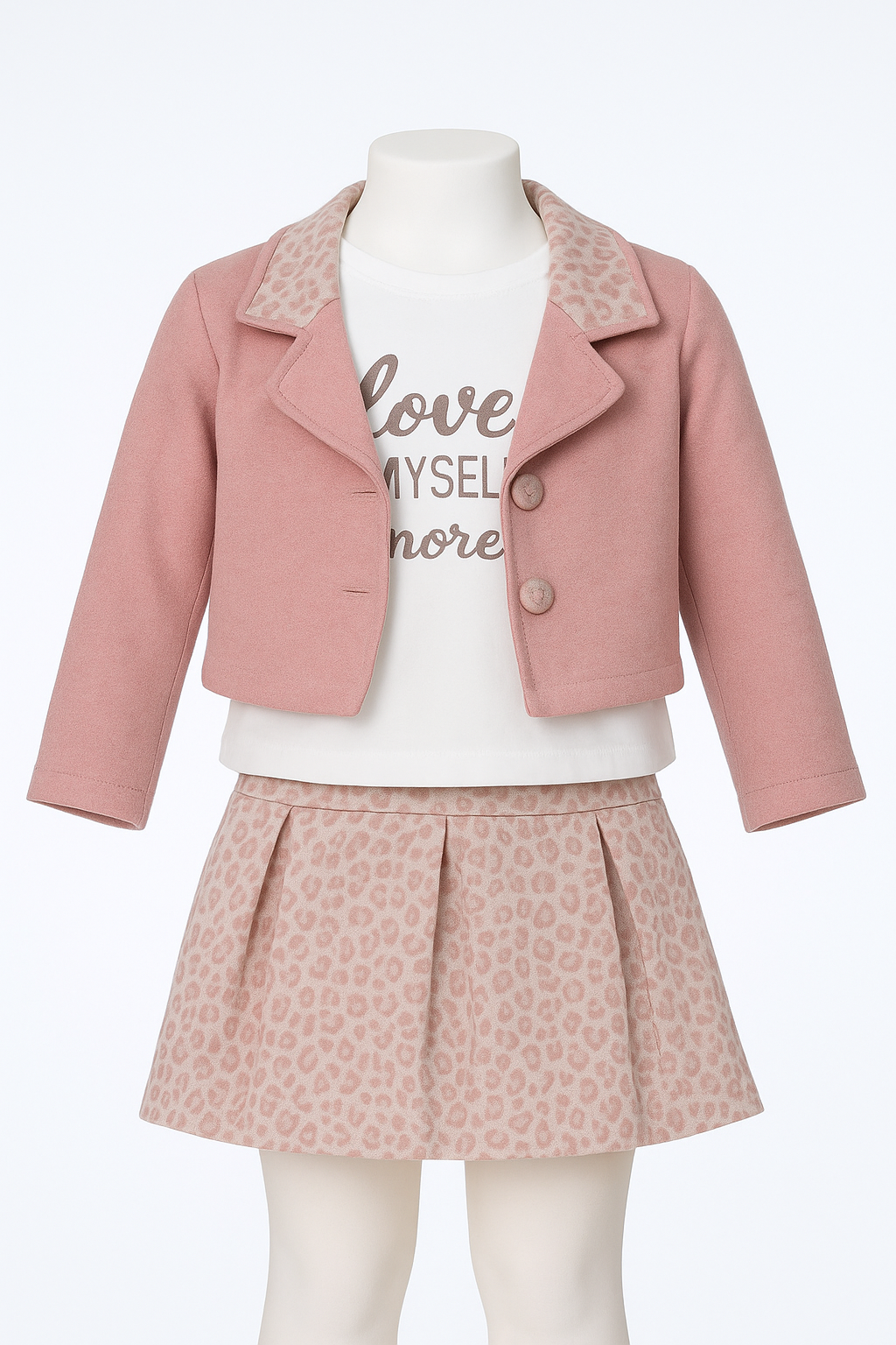 This powder pink set for girls is the perfect choice for the fall and winter season. The set consists of three pieces: an elegant blazer , a stylish skirt , and a comfortable blouse . The blazer features a subtle leopard print, adding character. The skirt is designed for comfort and freedom of movement. The blouse, made of soft cotton, provides warmth and comfort. The whole creates a harmonious ensemble that's perfect for a variety of occasions.Composition: blouse 97% cotton 3% lycra jacket 70% cotton 30% polyester skirt 57% polyester 30% cotton 3% lycra and viscose