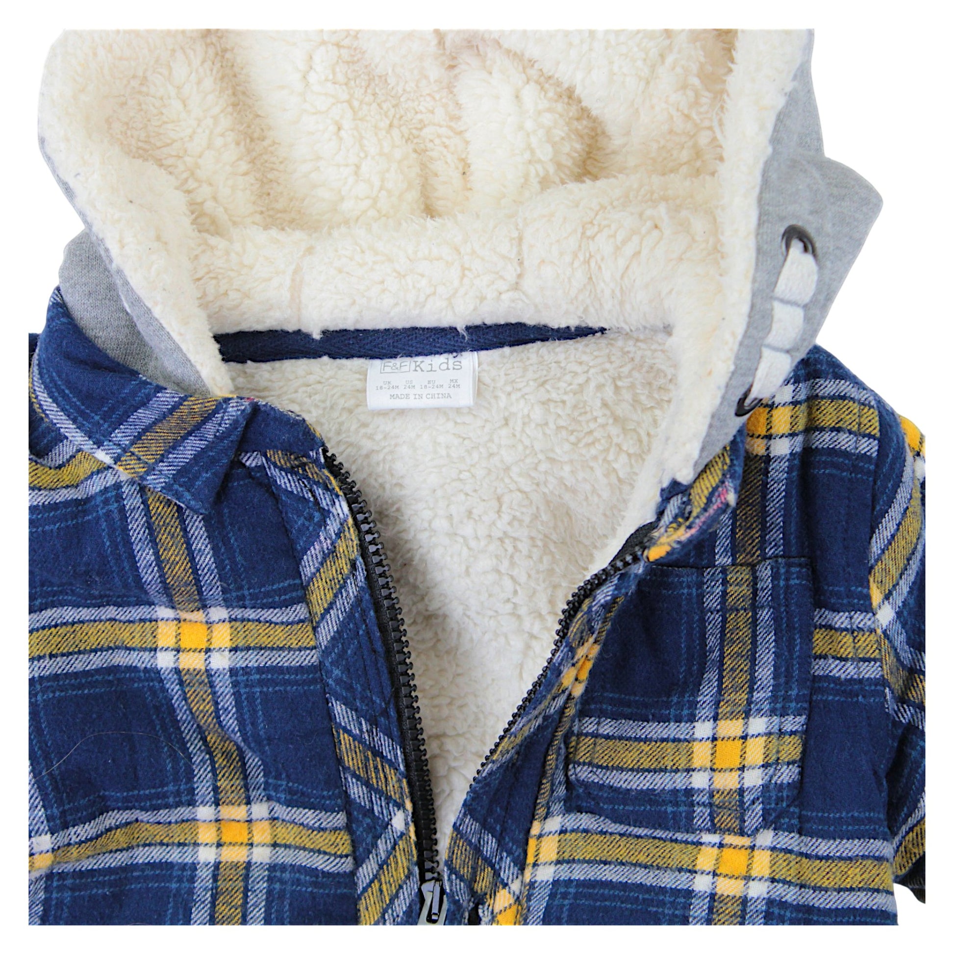 The navy blue insulated hooded jacket by F&F Kids is the perfect choice for the spring-summer season. Made of soft flannel material in a check pattern , it provides not only a stylish look, but also thermal comfort. The soft sheepskin lining inside the jacket and in the hood protects against cold and wind, guaranteeing warmth even on colder days. The hood with a gray finish adds a sporty character and additional protection against the wind. The zipper is practical and comfortable for everyday use. The long sleeve and classic cut give the jacket a timeless style.