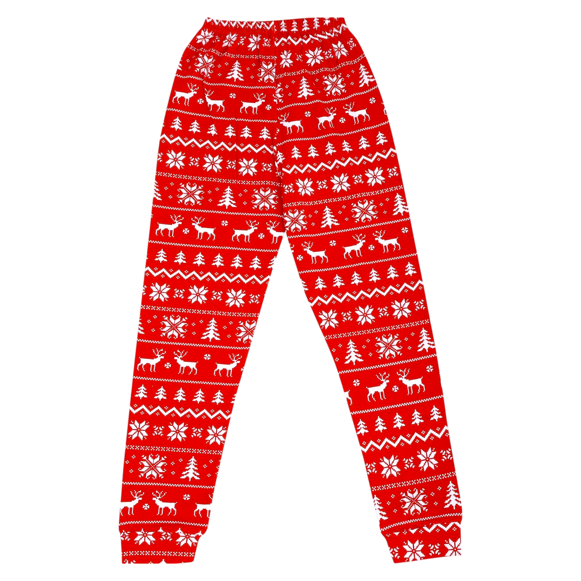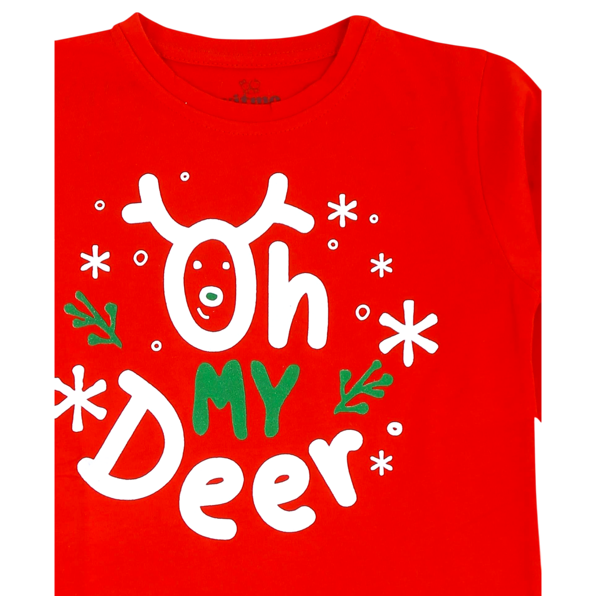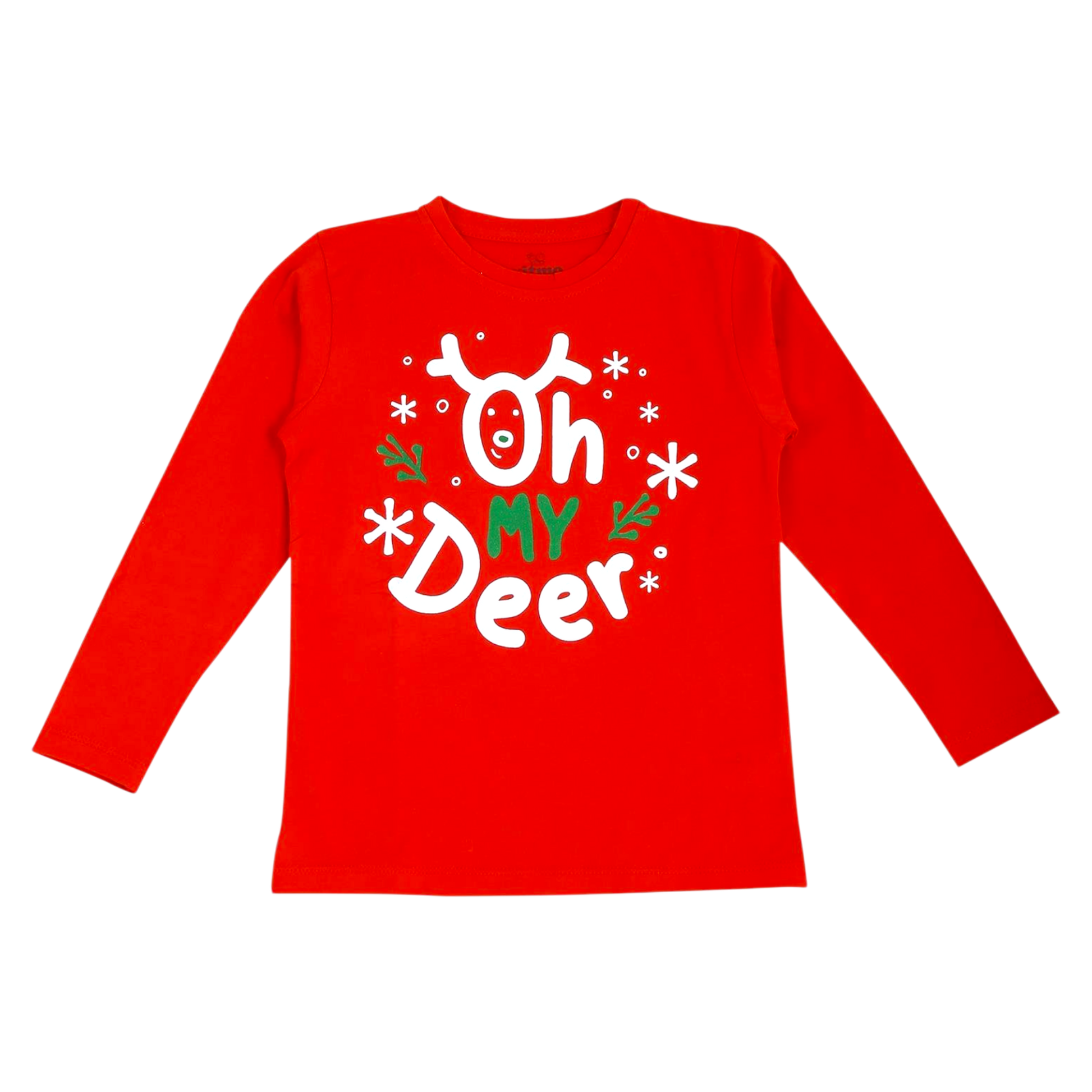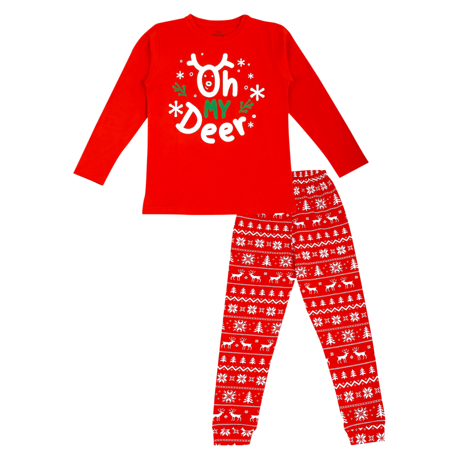 Girls' Christmas pajamas in an intense red color, perfect for winter evenings. It consists of a long sleeve with a charming inscription "Oh MY Deer", decorated with decorative deer antlers and stars and plant accents. The pajama bottoms are full of Christmas patterns - from snowflakes to deers and Christmas trees, which create a unique, festive atmosphere. The pajamas are made of soft, pleasant to the touch cotton , ensuring comfort during sleep. The product is ideal for winter nights, as well as a gift under the Christmas tree.