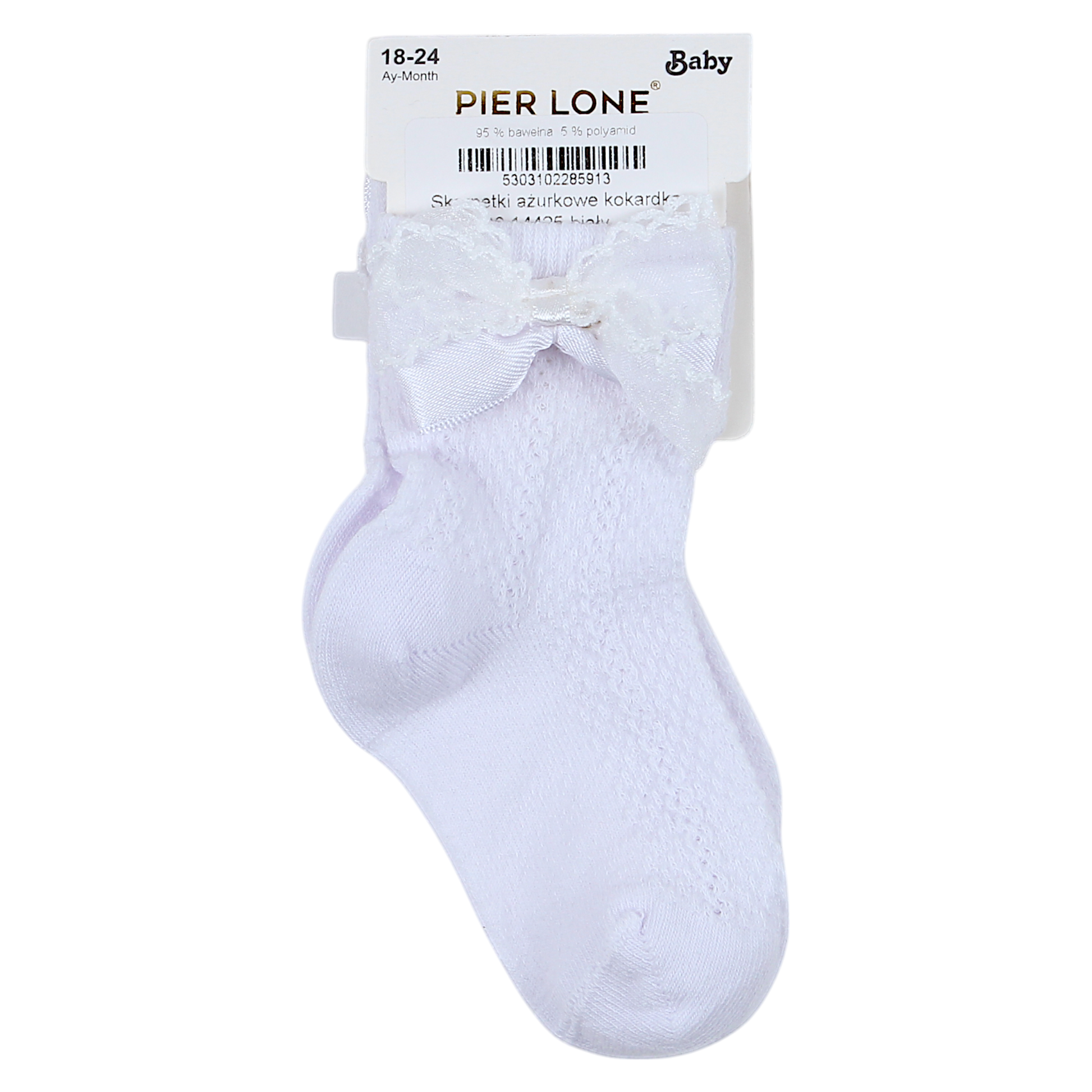 We present beautiful white openwork socks with a bow for girls, from the well-known brand Pier Lone. These charming socks are perfect for spring and summer, thanks to which your child will feel comfortable, even on the warmest days. Made of high-quality materials, these socks offer excellent breathability and comfort of wearing. The openwork pattern gives them elegance and sophistication, and the addition of a delicate bow adds a girlish charm. These socks not only look great, but also provide exceptional comfort. Thanks to the material from which they are made, they are flexible and gentle to the child's skin. The socks are an ideal proposition for every occasion, both everyday and special occasions. The product is intended for girls and is an indispensable element of every child's wardrobe. Their neutral color, which is classic white , makes them easy to combine with various styles, adding them subtle charm and grace. They are easy to maintain and retain their shape even after repeated washing.