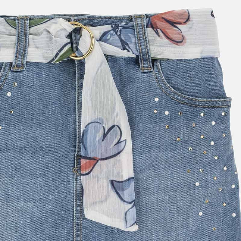 Children's denim skirt with pockets, colored belt and rhinestones, adjustable elastic waistband for girls Mayoral from the junior girl collection from the spring summer season, product code 6952, color 61 Jeans. Youth clothing for children.