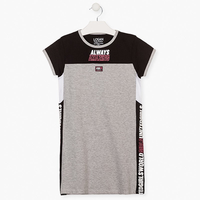 Children's sports dress with short sleeves and prints for girls Losan from the spring-summer collection product code 114-7007AL color 582 Gray. Children's clothing.