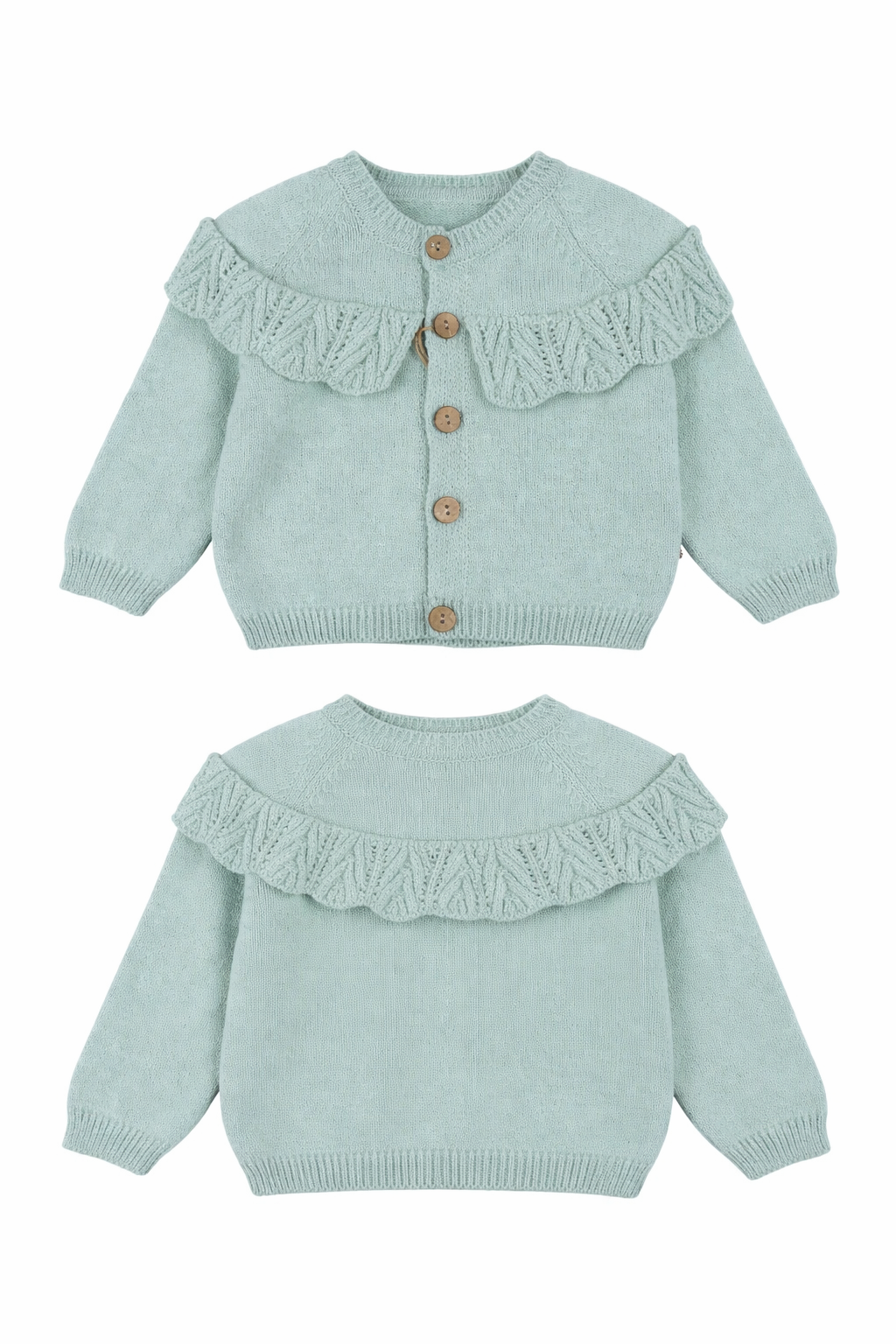 A charming sage -colored cardigan for girls from Becol . Made of soft material, it's perfect for the fall and winter season. A delicate ruffle at the neckline adds an elegant touch. The button closure makes it easy to put on and take off. A perfect choice for colder days, it provides comfort and warmth. Perfect for everyday styling and special occasions.